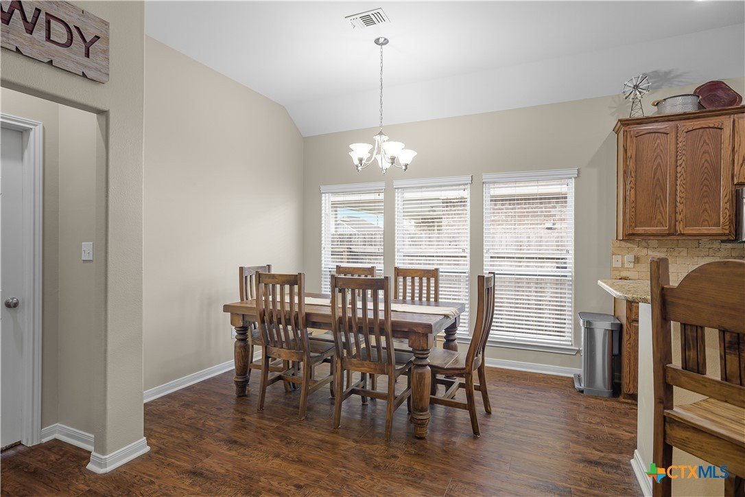 Well-cared-for 3 bedroom, 2 bathroom brick home offering a comfortable and functional layout. The open living area features high ceilings and dark wood laminate flooring. Kitchen includes custom wood cabinets, granite countertops, and stainless steel appliances. Split bedroom arrangement with a spacious primary suite featuring his and hers sinks, granite countertop, garden tub, separate shower, and walk-in closets. Enjoy the shaded backyard and covered patio, ideal for relaxing or entertaining. Clean, move-in ready home in an established area with easy access to town.