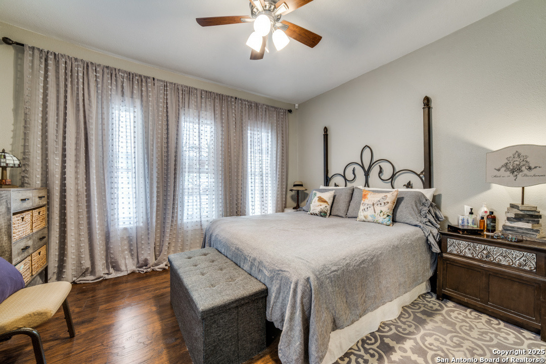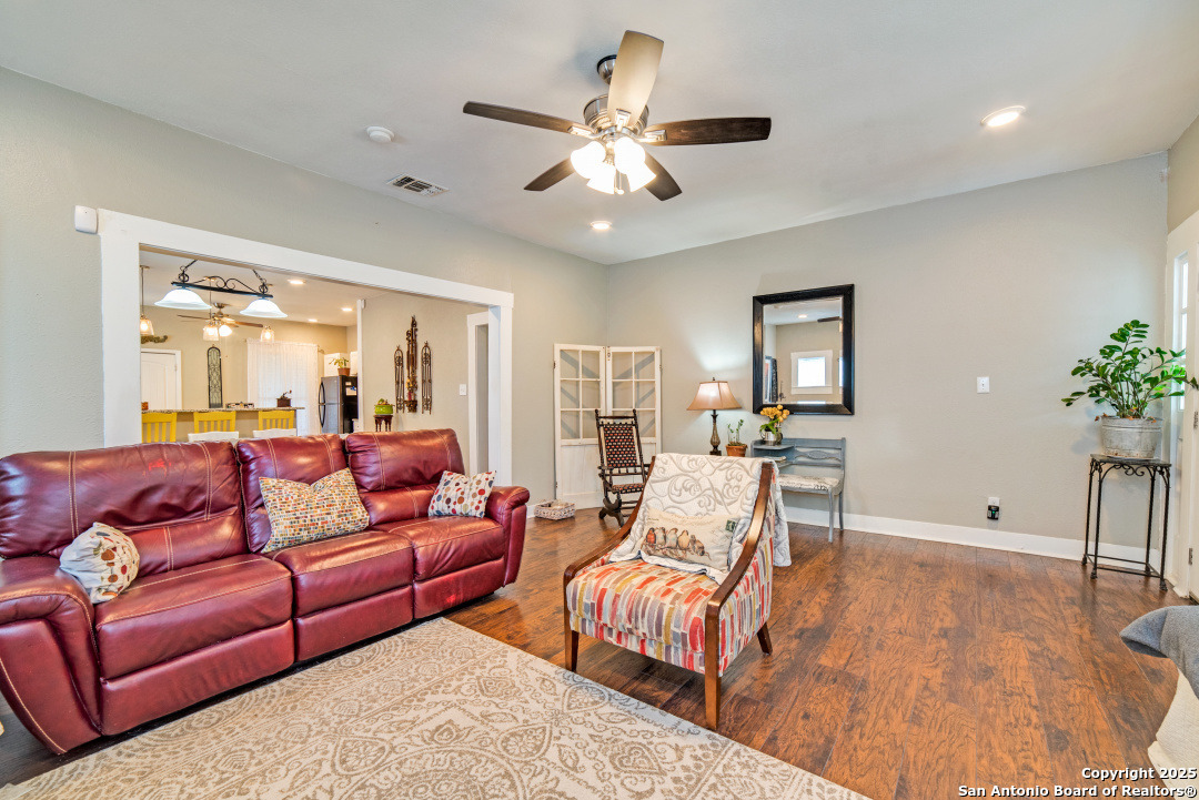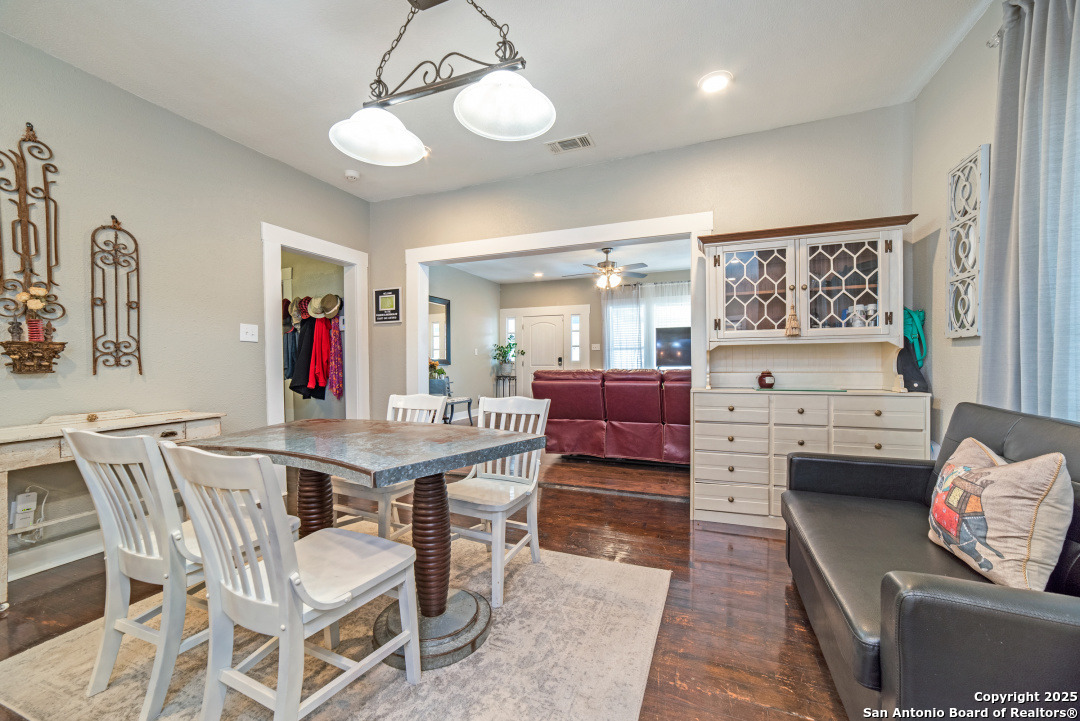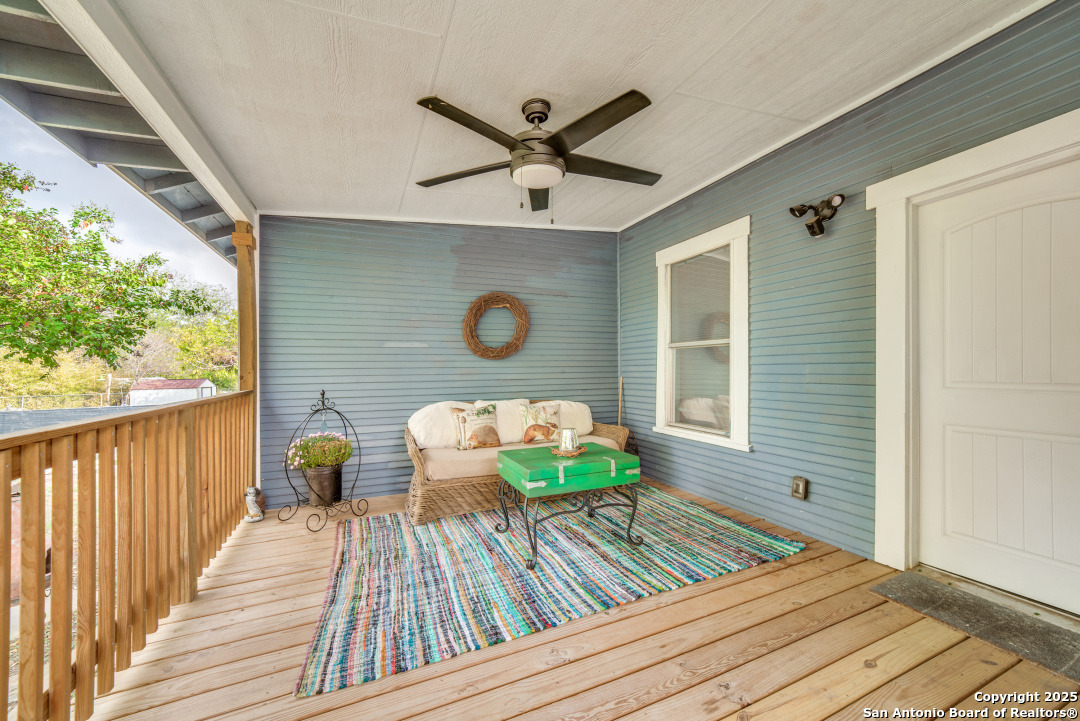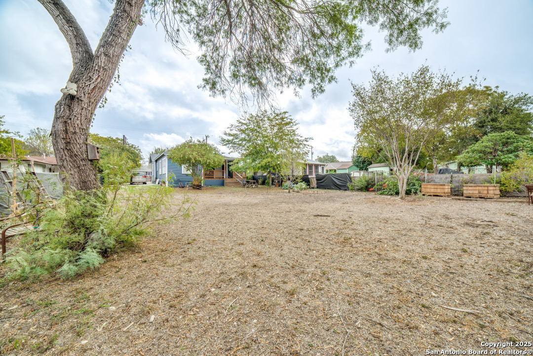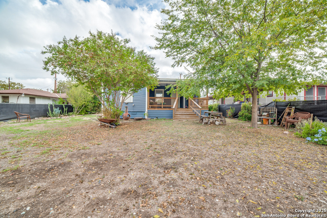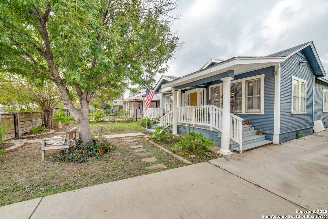 Welcome to Clark Bungalow! Move-in ready 1940s bungalow in the Denver Heights subdivision, part of the SA Community Revitalization Program. This home offers great curb appeal with an oversized front porch and inviting charm. Bright, open floor plan ideal for entertaining. Kitchen includes granite countertops, tile backsplash, breakfast bar, and stainless steel appliances-refrigerator w/filtered ice maker, stove w/convection oven, professional-grade microwave, and dishwasher. Utility room features energy-efficient washer and dryer plus a large-capacity purification system is also a filtration system. and reverse osmosis system (installed 2018). All mentioned appliances convey. Home features 9 ft ceilings, natural light, shiplap accents, and ceiling fans throughout. Roof, attic insulation, and flooring updated in 2018. Ring Alarm Security System with keyless entry and exterior lighting. Back door leads to a large covered deck (built 2020) for outdoor relaxation or entertaining. Yard includes garden beds within a Certified Wildlife Habitat-great for sustainable living. Easy access to I-10 and I-35. Minutes from AT&T Center, Convention Center, Alamo, Riverwalk, The Pearl, museums, parks, and St. Phillips College. Nearby shopping, dining, and VIA bus stop. Additional Notes: Extensive weatherization project completed in 2024 and a new, 5-ton heat pump condenser installed in 2025. Previously operated as a licensed short-term rental. Furnishings/decor available for purchase (info upon request). Oversized lot zoned for multi-family development. RN-4