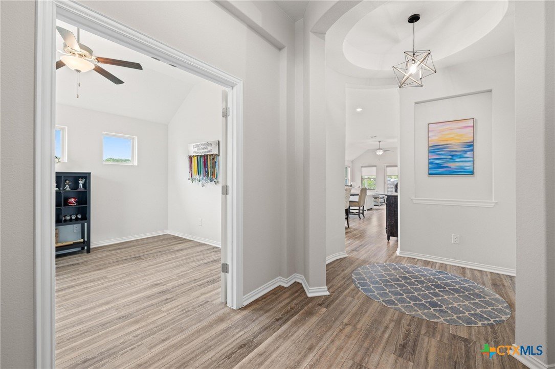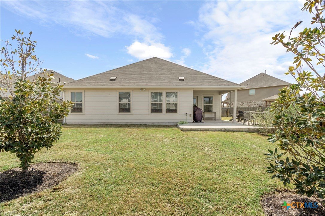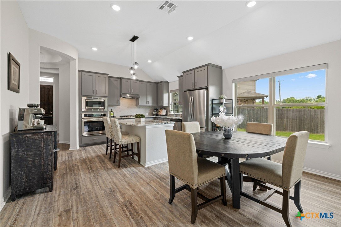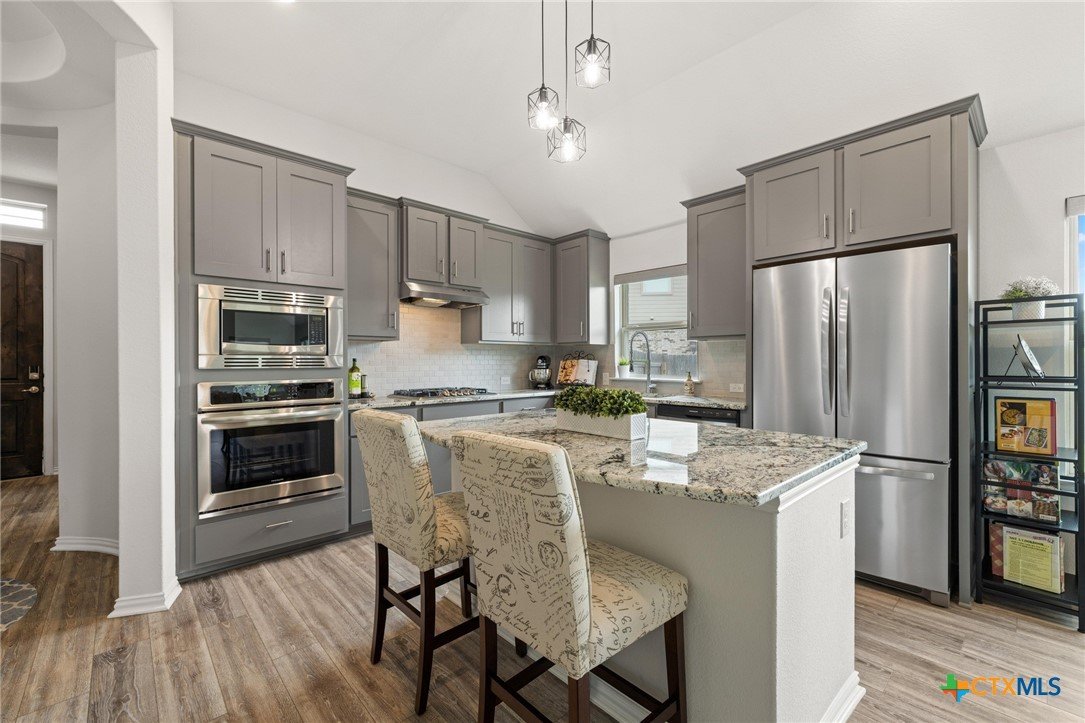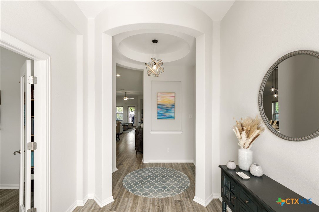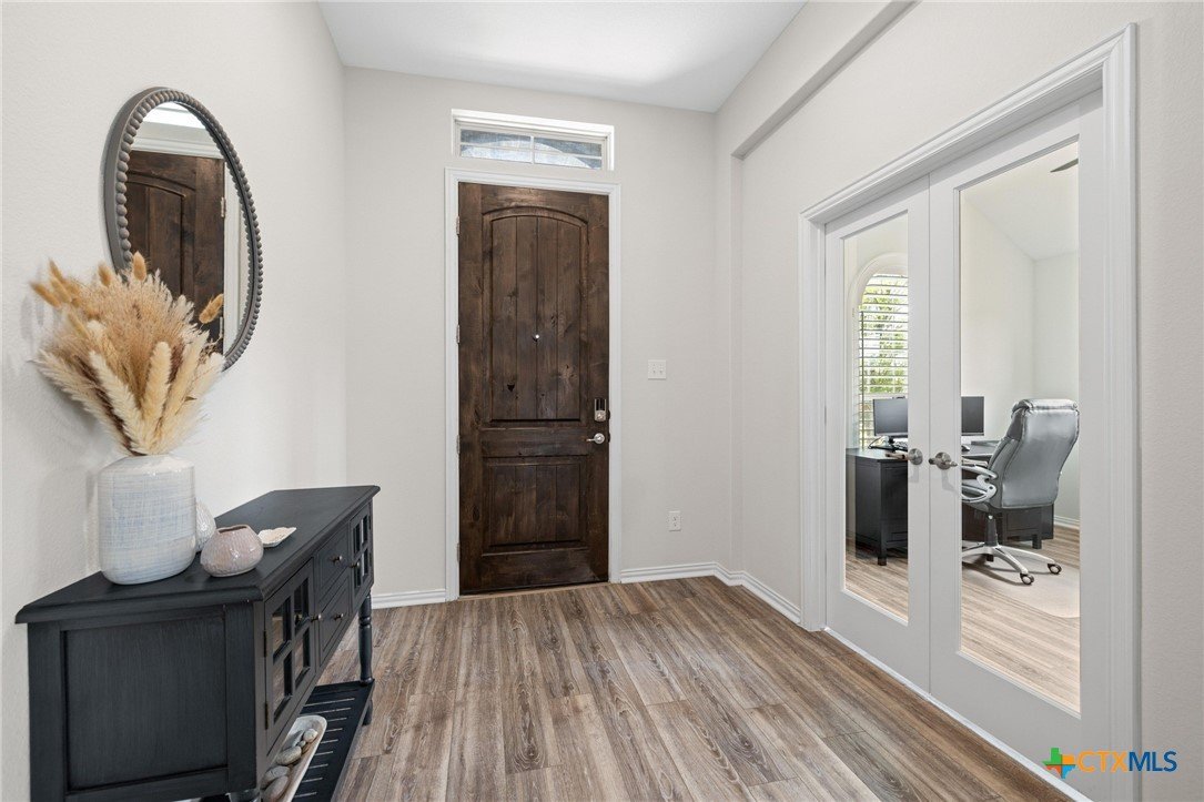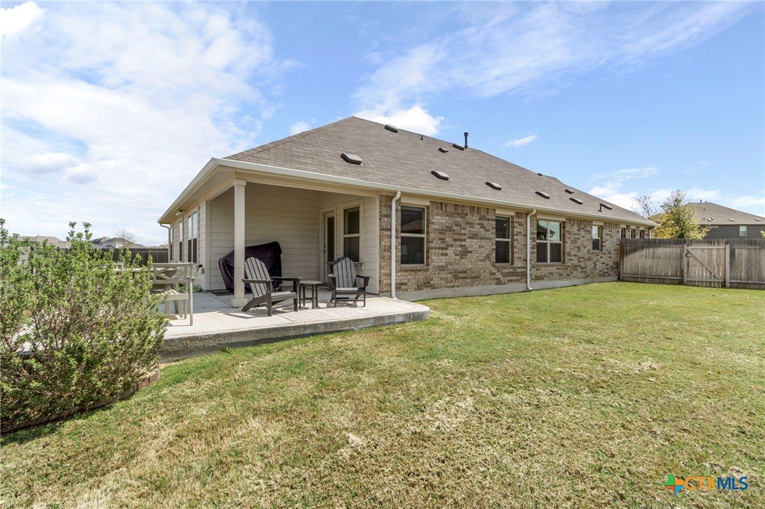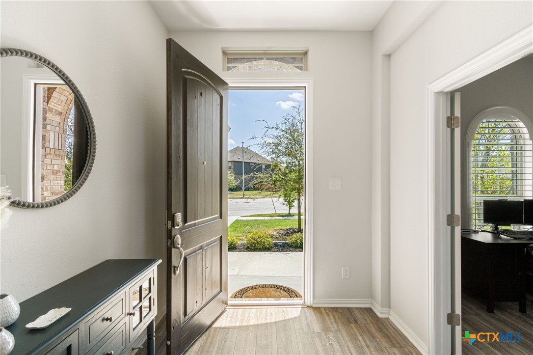 Welcome to this beautifully maintained 1-story, 3-bedroom, 2-bath home in the desirable Brooklands subdivision! Spanning 2,020 sqft, this home offers a thoughtfully designed open floor plan with modern finishes and a layout that adapts to many lifestyles. Step inside and be greeted by a striking rotunda foyer, a unique architectural feature that sets the tone for this exceptional home. The spacious living area is filled with natural light, seamlessly flowing into the chef-inspired kitchen, which boasts sleek gray cabinets, stainless steel appliances, stunning granite countertops, a large island, and built-in oven and microwave—perfect for both casual meals and entertaining. Enjoy Luxury Vinyl Plank flooring throughout the main living areas, office, and bonus room, with plush carpet reserved for the bedrooms for added comfort. The primary suite is a serene retreat, offering ample space and a spa-like en-suite bath. Two additional bedrooms provide room for family or guests. Need flexibility? This home includes a dedicated home office and a bonus room—ideal for a game room, fitness space, or second office. The oversized lot features a huge backyard with a covered patio, perfect for outdoor gatherings, gardening, or simply relaxing. Plus, the extended driveway and 2.5-car garage provide plenty of parking and storage. Conveniently located within walking distance to both the elementary and middle schools. This home also offers easy access to the new SE Loop in Hutto, making for a quick commute to downtown, the airport, and major tech hubs. The Samsung plant is just 10 minutes away. HEB and the Stone Hill Shopping center are just quick drive down the road. Don’t miss out on this meticulously maintained Brightland Homes, Laurel floor plan—a perfect blend of style, space, and convenience!
