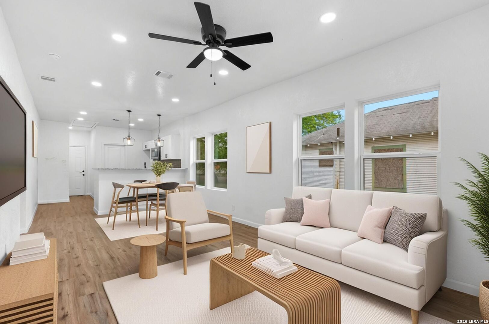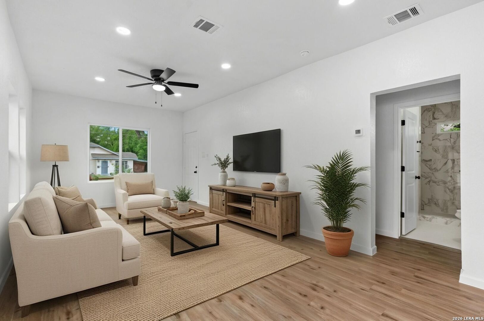 Beautifully updated single-story home that is move-in ready and waiting for its new owners. Step inside to an open-concept living and dining space filled with natural light, creating a warm and inviting atmosphere from the moment you walk in. With no carpet throughout, the home offers both a modern aesthetic and easy maintenance. The kitchen is thoughtfully designed with solid countertops, soft-close cabinetry, and a new stove and dishwasher that convey. Enjoy year-round comfort with central A/C throughout-no window units in sight. The primary suite includes a private ensuite bathroom, while both bathrooms feature sleek walk-in showers for a modern, updated feel. Start your mornings or unwind in the evenings on the covered front porch, and take advantage of the spacious, fully fenced yard-perfect for pets, gatherings, or simply enjoying the outdoors. A paved off-street parking space adds convenience, and the location is hard to beat-less than 2 miles from the Frost Bank Center and Freeman Coliseum, placing you close to Spurs games, concerts, and some of San Antonio's top events. Whether you're a first-time buyer looking for a home you can enjoy right away or an investor seeking a strong addition to your portfolio, this property offers both comfort and opportunity.