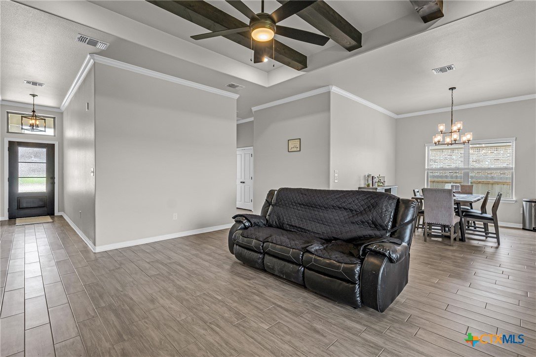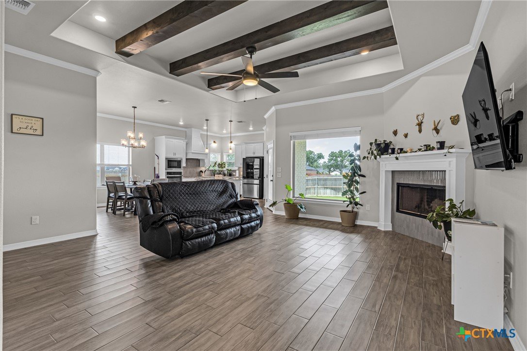 Stunning 4-Bedroom Home with Spa-Like Primary Bath & Designer Finishes! Step into comfort and style in this beautifully appointed 4-bedroom, 2-bath home offering 2,140 square feet of thoughtfully designed living space. From its inviting curb appeal to the serene backyard retreat, every detail of this home blends luxury and functionality. The spacious family room is the heart of the home, featuring eye-catching wood-beamed ceilings, a cozy wood-burning fireplace with an elegant tiled surround, and an ornate mantel that creates a warm, welcoming atmosphere. The open-concept layout flows seamlessly into the modern kitchen, where you’ll find granite countertops, designer backsplash and upscale accents, custom soft-close Shaker cabinets, built-in oven and microwave, a sleek cooktop with vent hood, and a powered granite-topped breakfast bar perfect for casual meals. Enjoy your morning coffee in the breakfast area overlooking the private backyard. Retreat to the spa-like primary suite, where vaulted ceilings and abundant natural light create an airy, relaxing vibe. The luxurious ensuite bath boasts a dual-entry walk-in shower, garden tub, and separate opposing vanities—designed to elevate your daily routine. The split bedroom floorplan has three guest bedrooms and a full guest bathroom on the other side of the home, maximizing privacy. Additional features include spray foam insulation for energy efficiency, crown molding, wood-look ceramic tile flooring in main areas, ceiling fans, and a 2-car garage. Enjoy outdoor living in the beautifully landscaped backyard, complete with a privacy fence, covered back patio, and an automatic sprinkler system to keep your lawn looking its best year-round. Conveniently located near Baylor Scott & White, shopping, dining, and easy access to I-35, this home combines modern comfort with everyday convenience. Don’t miss your opportunity to own this exceptional home—schedule your private showing today!