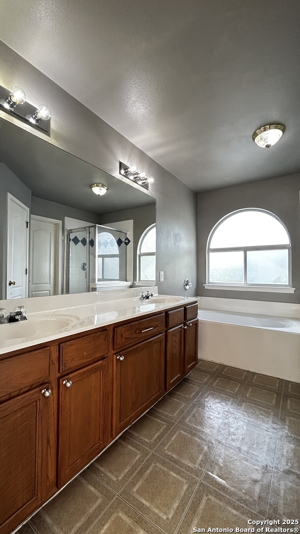 Nice 3 Bed. 2.5 Bath Home in Gated Community on Cul-de-sac. All Vinyl Plank Flooring and Tile. No Carpets except Stairs. Living Room with 15 ft Ceiling, Gas Fireplace. Kitchen with Breakfast Bar, Stove, Microwave, Dishwasher. All Bedrooms Upstairs. Primary Bedroom with Ceiling Fan, Walk-in Closet. Primary Bath with Separate Shower/Garden Tub, Dual Sinks. Fenced Yard on Greenbelt (no back neighbor) and Large Patio for BBQs, entertaining. 2 Car Garage with Opener. Community Playground, Basketball. Closet to Medical Center, 1604, IH-10.