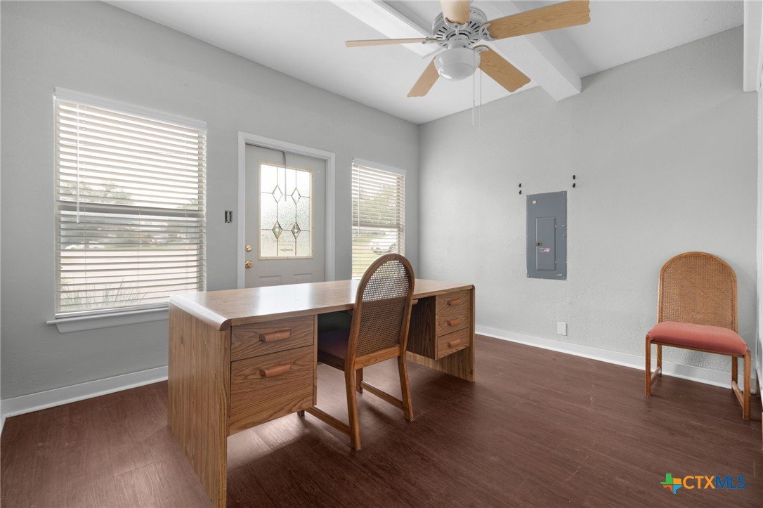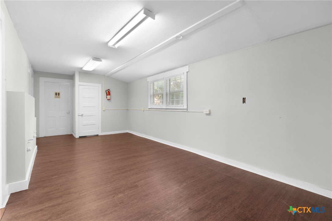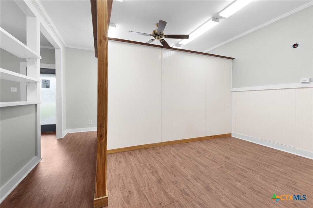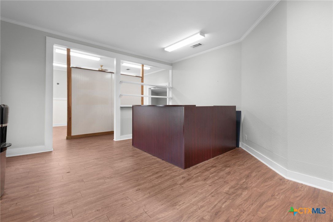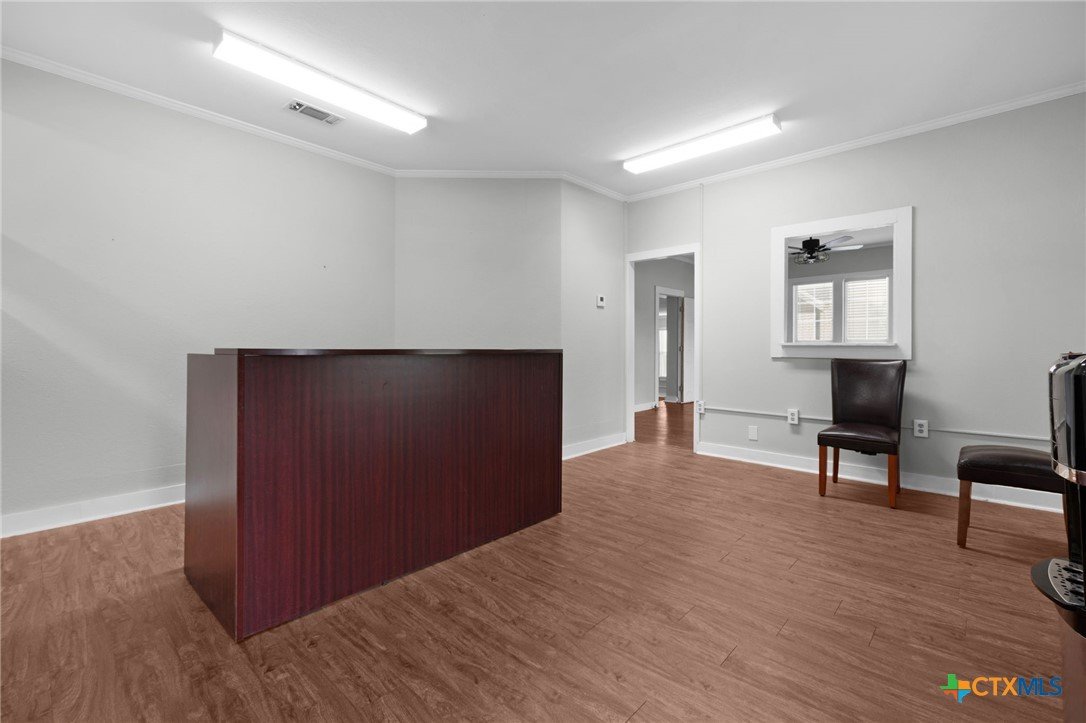 Versatile and well-maintained, this retail/office space offers a functional layout ideal for a variety of professional uses. Featuring a welcoming reception center, six private offices, two half bathrooms, a dedicated breakroom, and a spacious kitchen/conference/hospitality room with step-down access, this building is designed for productivity and comfort. Additional highlights include a copy center, file/storage room, and multiple closets for extra storage. The space is finished with painted wood walls and sheetrock, crown molding, 9-foot ceilings (except in the breakroom), ceiling fans, updated lighting, and AT&T Fiber Internet. Recent updates include fresh interior paint, updated light fixtures, and new flooring throughout. With four separate entrances and central electric heat and air, this property is move-in ready and primed for business.