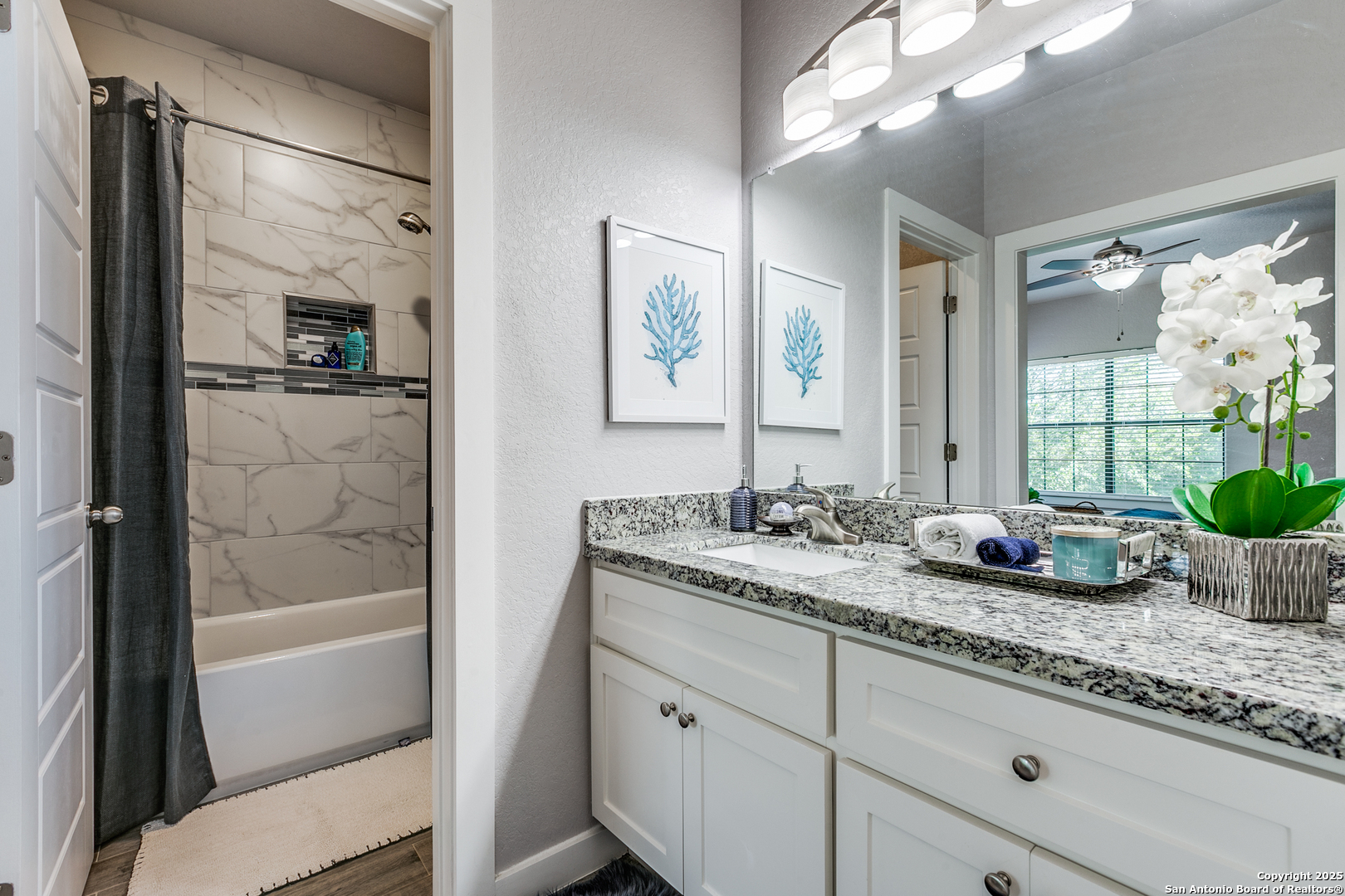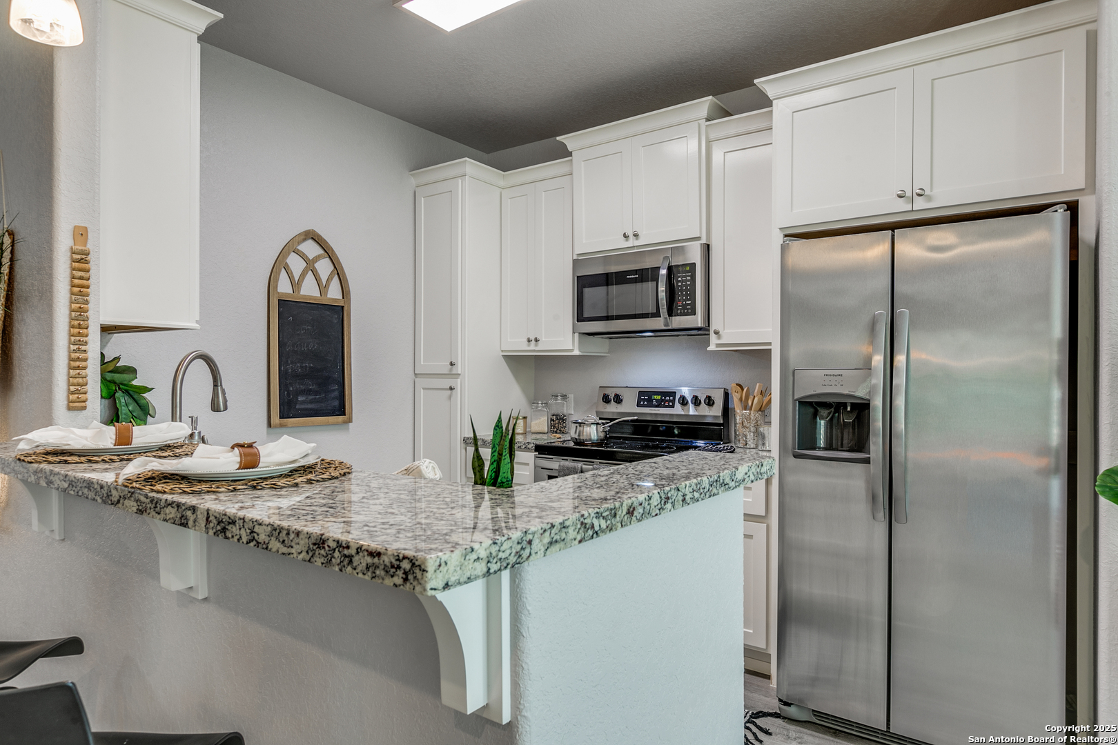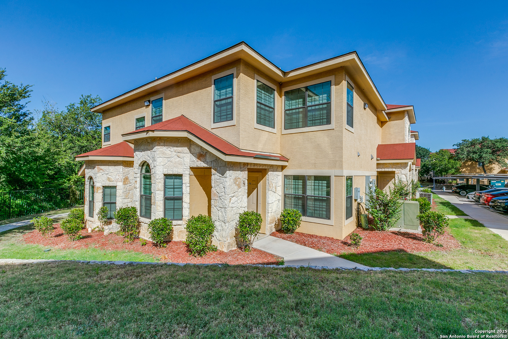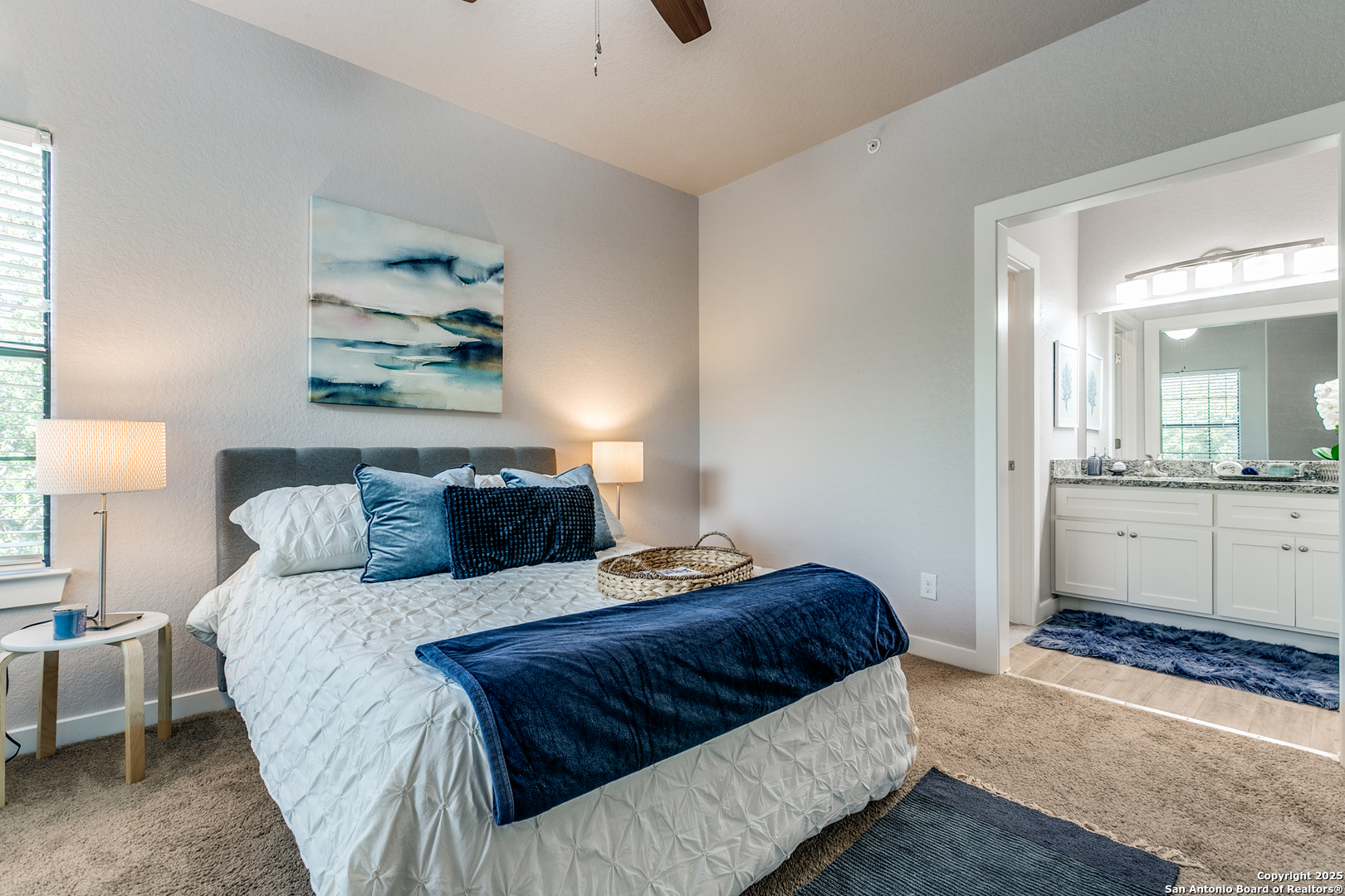 Pristine condo, corner unit on greenbelt - quiet and secluded! Complex Centrally located near Med Center! This like-new condominium built in 2019 has low fees, great amenities, and all the comforts of a single family home without the hassle of outside maintenance and upkeep. Downstairs is open and quite large tiled wood-look floor, built-ins for extra storage, with a full bath to accommodate overnight guests, a separate dining nook, and conveniently located pantry/ utility room / laundry just off the kitchen. Granite countertops with breakfast bar off the peninsula. Upstairs - two spacious bedrooms each with en-suite bathroom. Master has nicely outfitted walk-in closet with built-in storage. Washer / Dryer and Refrigerator included.