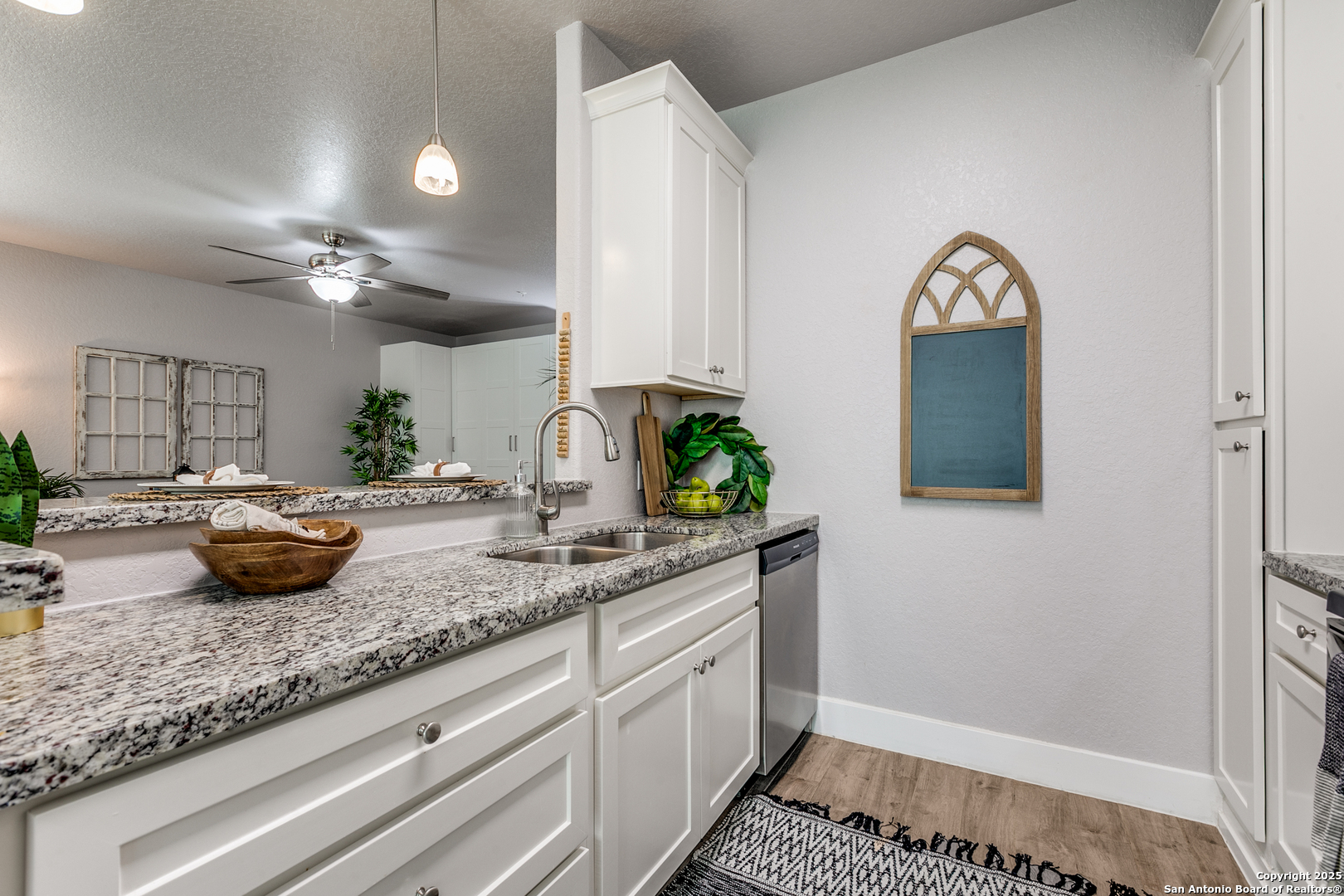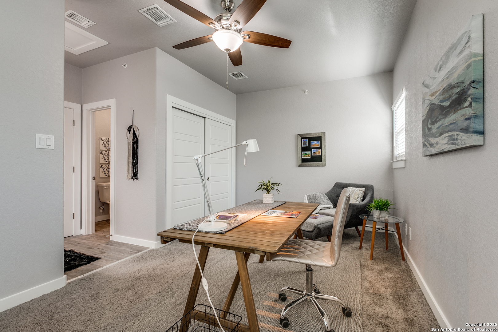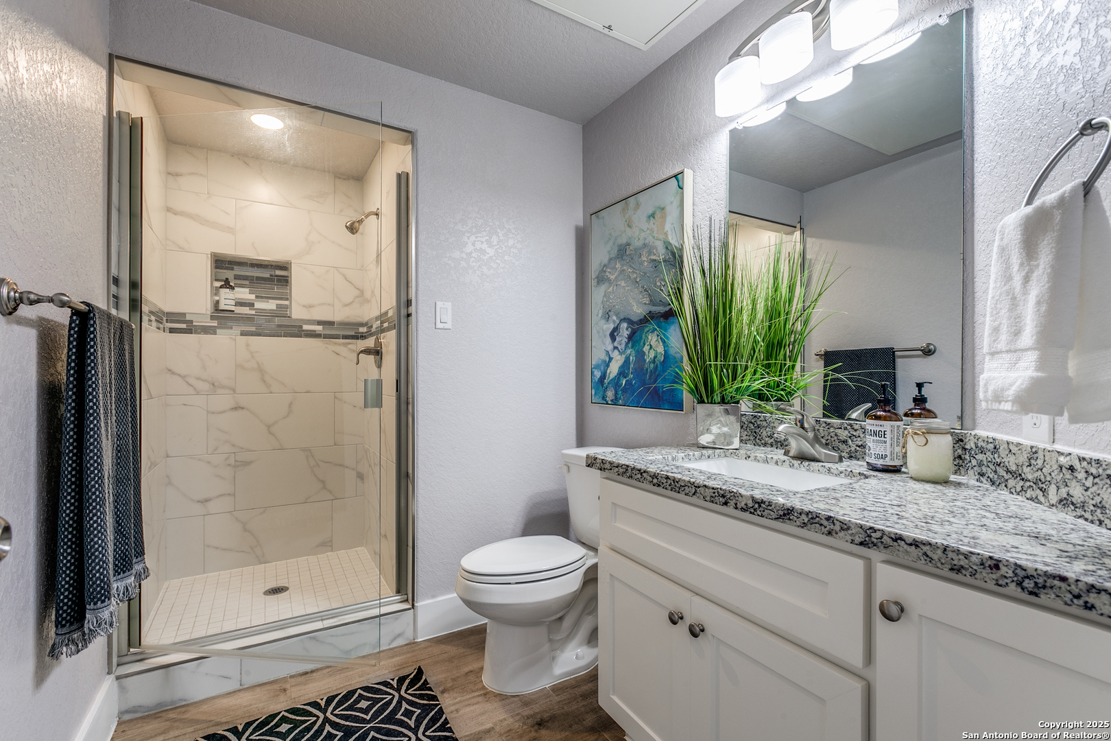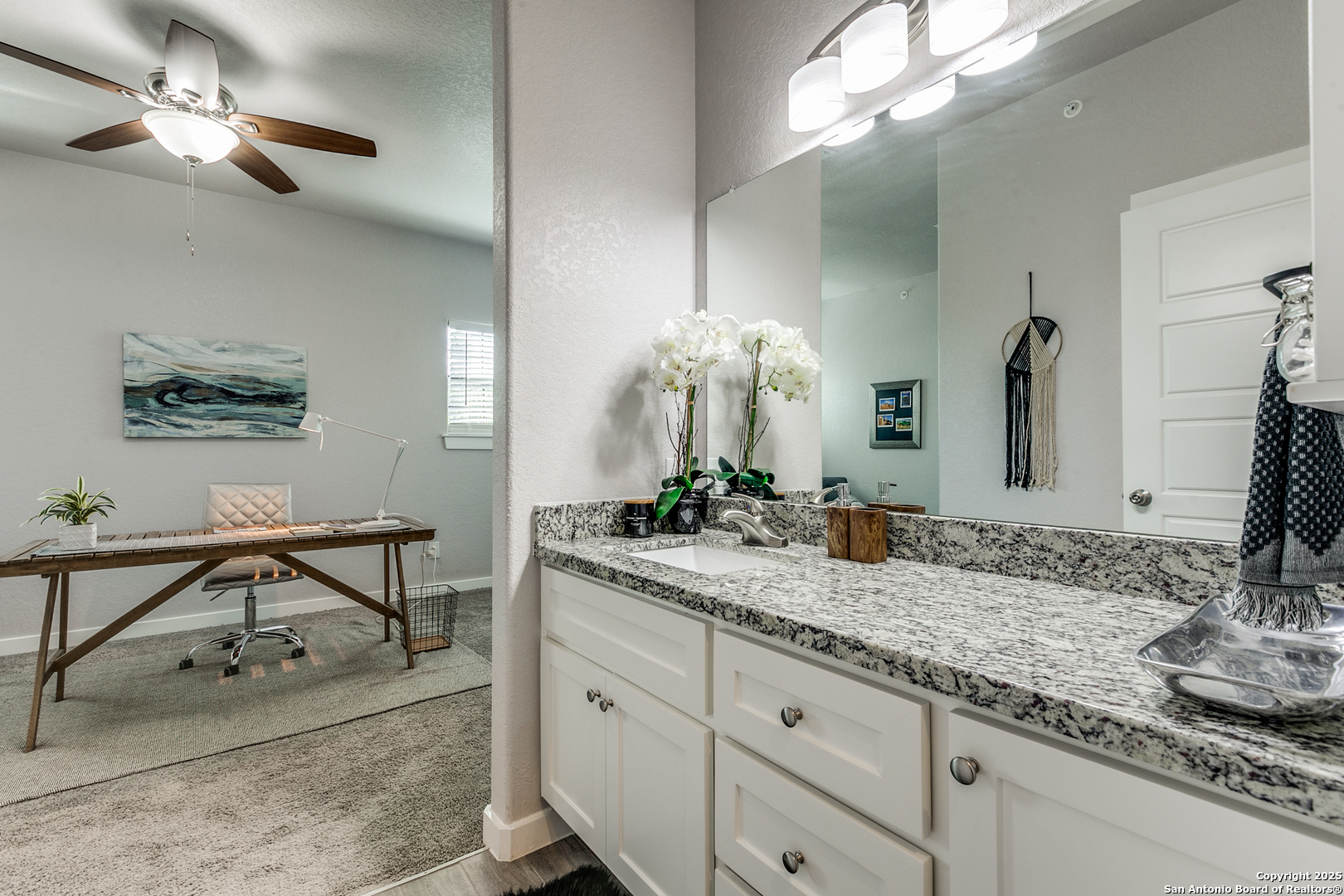 Pristine condo, corner unit on greenbelt - quiet and secluded! Complex Centrally located near Med Center! This like-new condominium built in 2019 has low fees, great amenities, and all the comforts of a single family home without the hassle of outside maintenance and upkeep. Downstairs is open and quite large tiled wood-look floor, built-ins for extra storage, with a full bath to accommodate overnight guests, a separate dining nook, and conveniently located pantry/ utility room / laundry just off the kitchen. Granite countertops with breakfast bar off the peninsula. Upstairs - two spacious bedrooms each with en-suite bathroom. Master has nicely outfitted walk-in closet with built-in storage. Washer / Dryer and Refrigerator included.