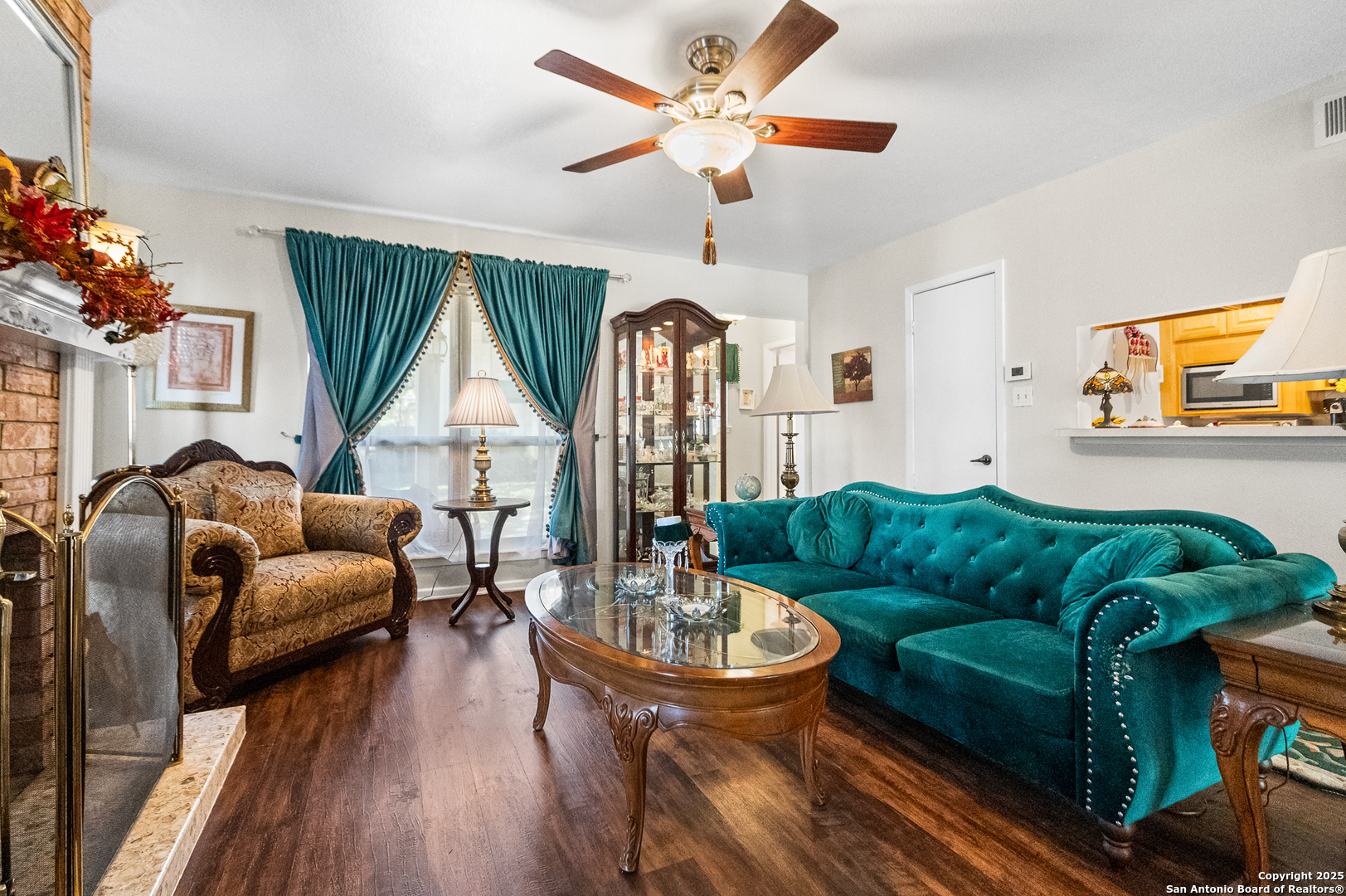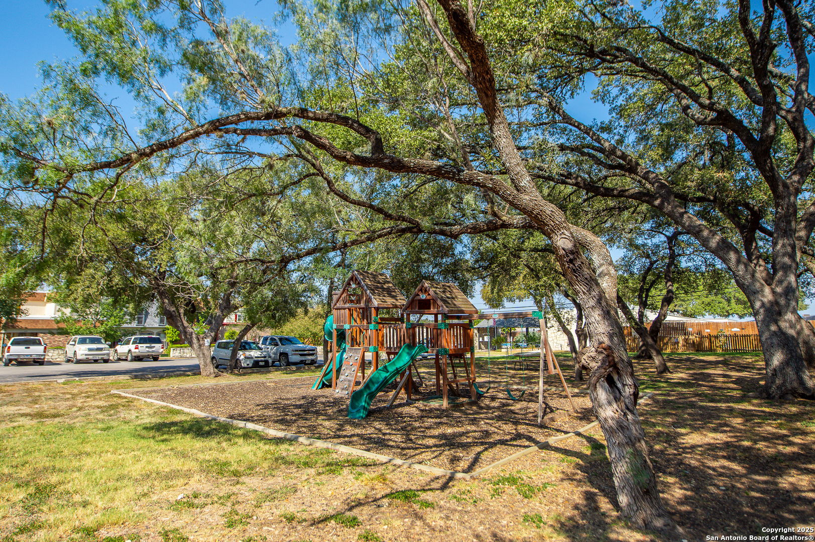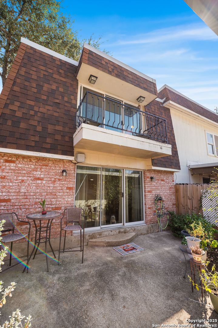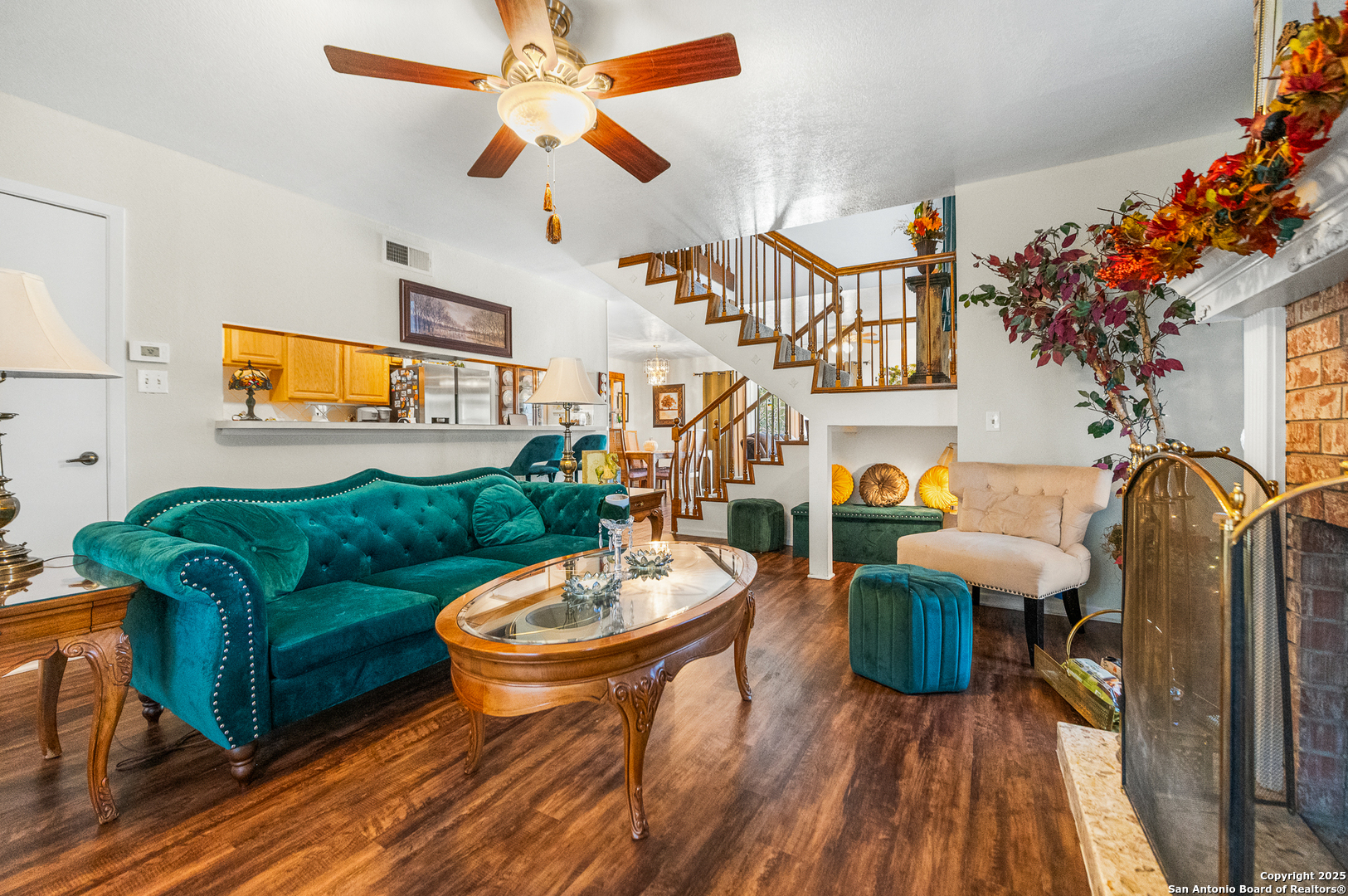 Welcome to this beautifully & private corner unit that blends charm, comfort, & functionality in all the right ways. Gorgeous natural light fills this spacious home featuring an open floor plan that makes everyday living feel effortless. The inviting living room sets the tone with a classic brick fireplace,wood-burning or gas-for cozy evenings or casual get-togethers. Just around the corner, the fun and flexible family room opens seamlessly to the dining area, creating a warm space that's perfect for entertaining or relaxing with loved ones. The kitchen is a standout with generous storage, ample counter space for meal prep, and a welcoming eat-in breakfast bar that connects beautifully with all main living areas. Whether you're chatting with guests or keeping an eye on what's happening in the family room, this kitchen is the heart of the home. Upstairs, you'll find two spacious and relaxing bedrooms, each with its own dedicated vanity area, connected by a shared bathroom and shower/tub combo-ideal for privacy and convenience. The second bedroom features sliding glass doors that open onto a balcony overlooking your private enclosed patio, which leads directly to a large, two-car garage. Beyond the home, enjoy a well-maintained community with top-notch amenities including a pool, park and playground, dog run, clubhouse, and a friendly, responsive management team. Conveniently close to the airport for travelers and with easy access to both 281 and 410 and Wurzbach Pkwy, everything you need is just minutes away. Comfort, space, and community-it's all here, waiting for you.