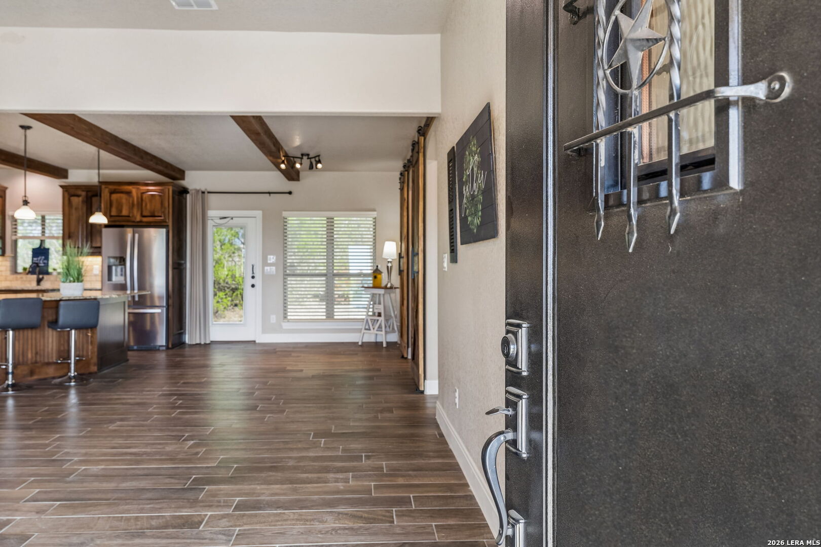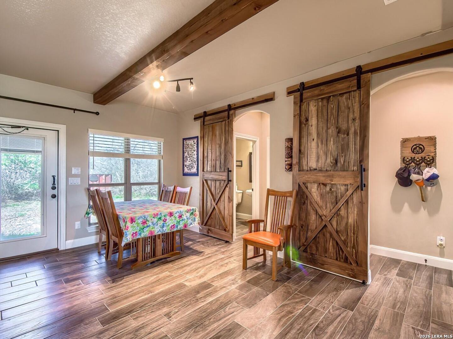 OPEN HOUSE 04/11/2026 from 4:00 PM to 6:00 PM 6197 Pfeil Rd, Schertz, TX 78154 - A rare opportunity to own nearly 4.96 acres of beautiful Texas land with a modern ranch home built in 2019. This thoughtfully designed one-story property offers the perfect blend of comfort, functionality, and country living with city convenience. The home showcases smart-home technology and upgrades ideal for both everyday living and entertaining. The open-concept kitchen is a chef's dream, featuring a large breakfast island, stainless steel appliances, custom cabinetry, and abundant workspace. The home is designed with accessibility in mind and includes a flat garage entry, wider doorways, a walk-in shower, and a front-porch ramp for ease of mobility. A standout feature is the fully heated and insulated 700-sq-ft garage, complete with water softener, pellet stove, sink, and a second laundry area-perfect for hobbies, projects, or additional workspace. The exterior showcases stone and contemporary stucco finishes, an oversized front patio, solar screens for energy efficiency, and a 30x40x15 slab workshop with water and electricity. The property is fully fenced and ready for large animals, making it ideal for those seeking a rural lifestyle. A 15-ft-deep pond adds a rare and scenic touch to the acreage. Inside, you'll find charming barn doors, wood beams in the kitchen, plantation shutters in the living room and owner's suite, reinforced walls for TV mounting, soft-close cabinets and toilets, spacious bedrooms with oversized closets, and ceiling fans throughout. Additional exterior conveniences include four water spigots and five outdoor electrical outlets. Enjoy peaceful country living with quick access to I-10, Loop 1604, Randolph AFB, Fort Sam Houston, Brooke Army Medical Center, and The Forum Shopping Center.