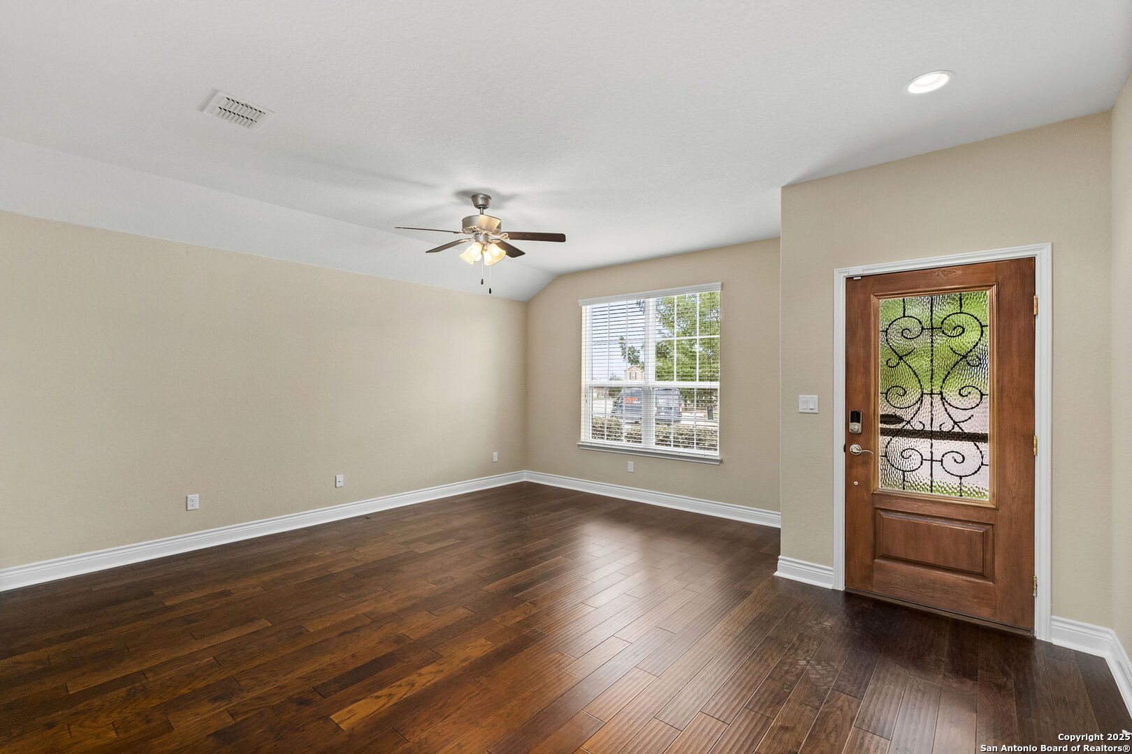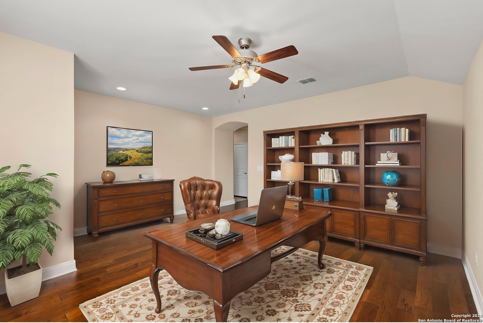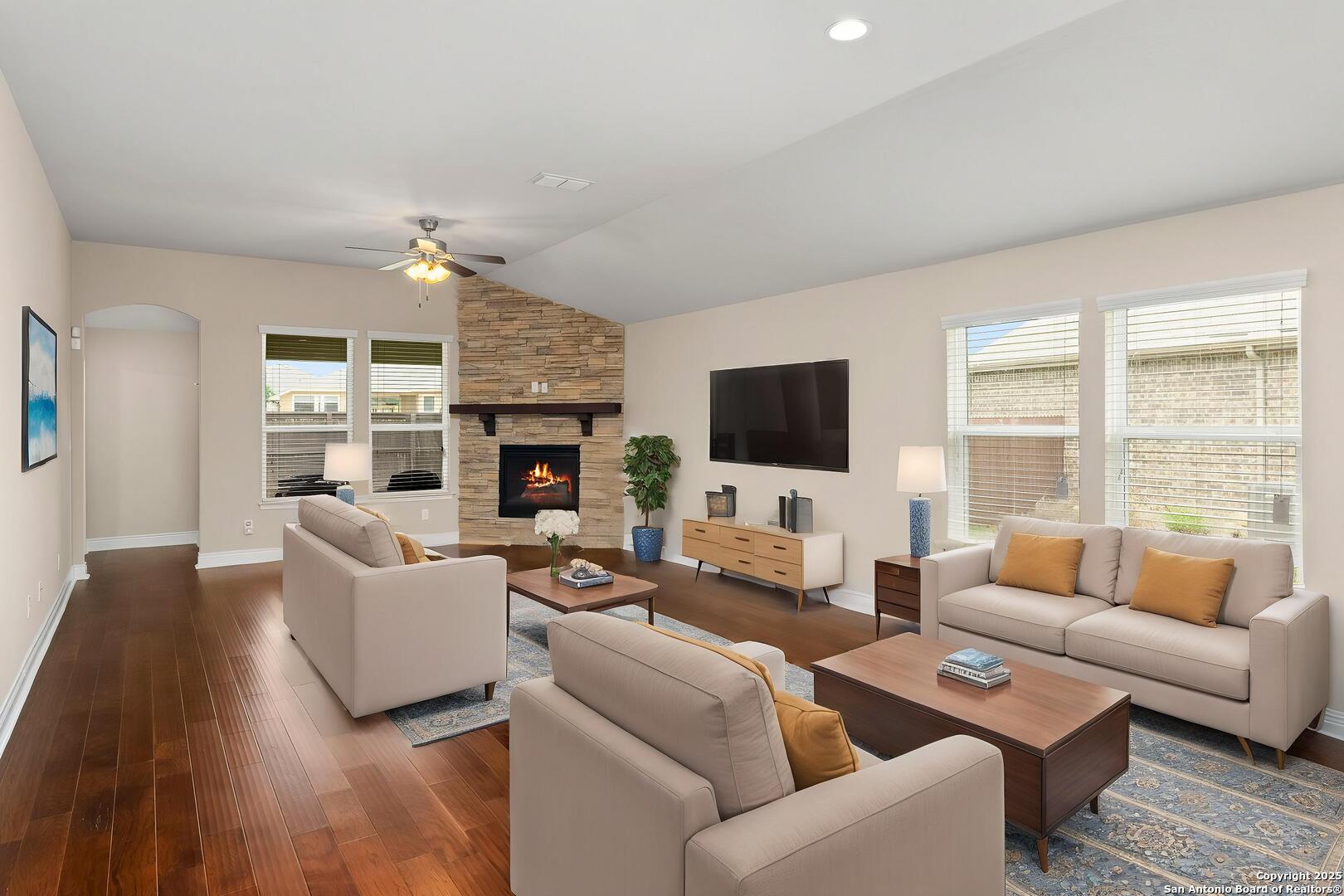 Still accepting back up offers.Welcome to this truly exceptional Pulte-built home in the desirable Ridgemont community! Builder Home Warranty till 11-2027 and Choice Appliance Home Warranty till 9-2027. Built in 2017 and meticulously maintained, this single-story, ADA-compliant home features 36" doorways, a roll-in shower, grab bars, and no steps-perfect for accessibility and comfort. Inside, enjoy 3 bedrooms, 2 baths, a rare 3-car finished garage, and a front flex space ideal for a home office or dining. Stunning Mohawk hand-scraped hardwood floors, granite counters in kitchen and baths, double oven, gas stove, upgraded microwave, and pull-out drawers create a beautiful, functional kitchen. Extras include: surround sound wiring, canned lighting, faux wood blinds, ceiling fans in all rooms, mudroom with built-ins, and a laundry room with sink and cabinets. Primary suite boasts a roll-in shower, private toilet room, and extra storage. Enjoy peace of mind with a lifetime water softener, water filtration system, newer windows, full gutters, professionally maintained sprinkler & HVAC systems, foundation stabilization with warranty, and fresh interior/exterior paint. Pest control system inside walls. The HOA features a pool, grill area, and summer food trucks! This home is move-in ready and lives like a model-don't miss it!