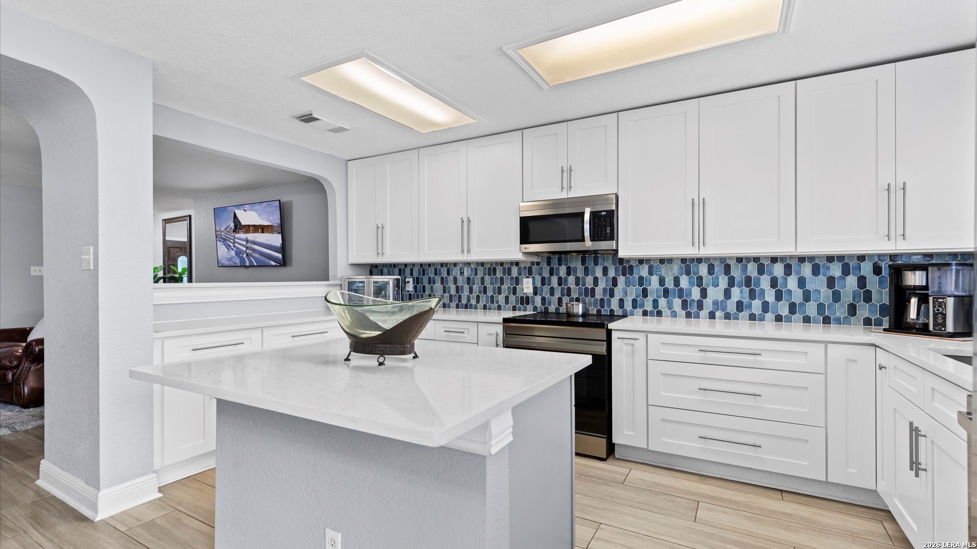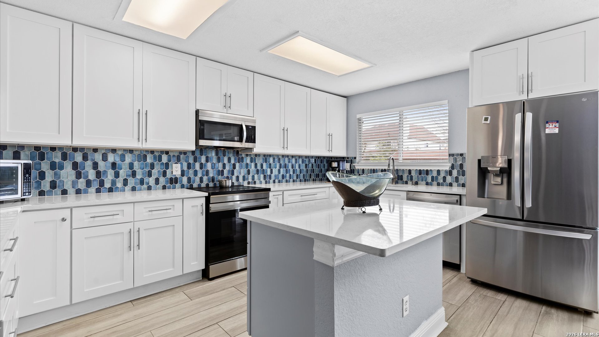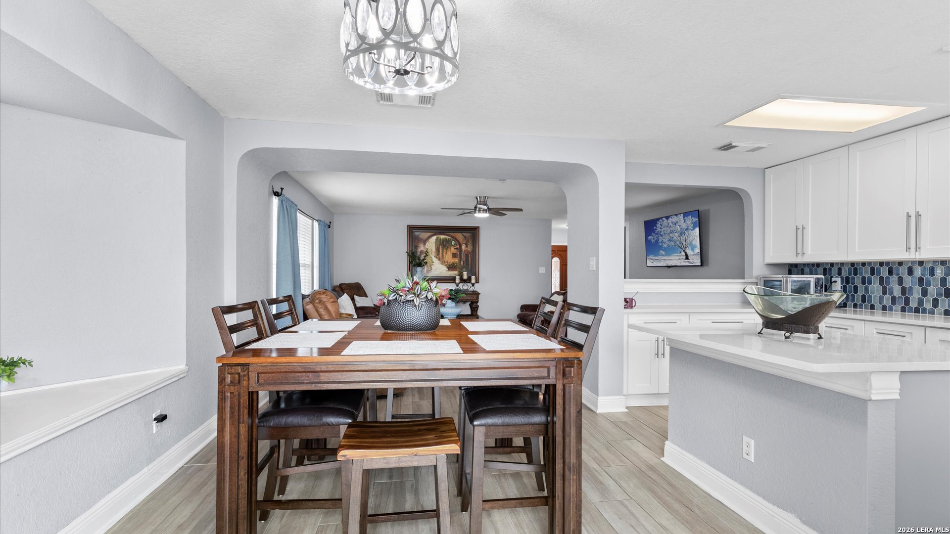 Welcome home to this beautifully updated 3-bedroom, 2-bath residence that blends modern finishes with everyday comfort. The stunning kitchen is the heart of the home, featuring stainless steel appliances, quartz granite countertops, a stylish two-toned blue and white tile backsplash, a center island, and a cozy eat-in dining area-perfect for casual meals or entertaining guests. Both bathrooms have been thoughtfully renovated. The spacious primary suite offers a walk-in shower, dual vanities, new cabinetry, and a sleek quartz granite countertop. For added convenience, the laundry room is located directly inside the primary bathroom. The secondary bathroom has also been tastefully updated to match the home's modern appeal. All bedrooms feature ceiling fans, plush carpet, and generously sized closets, while ceramic tile flooring flows throughout the main living areas. Step outside to a large backyard with plenty of room for kids to play, pets to roam, or weekend gatherings, plus a handy tool shed for all your gardening needs. The home's charming brick front, siding on three sides, and a mature shade tree add to its curb appeal. Enjoy relaxing mornings or peaceful evenings on the inviting front porch-an ideal spot for coffee or a glass of wine.