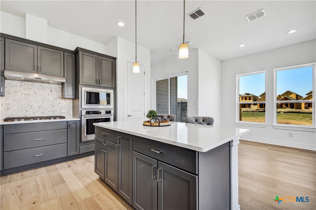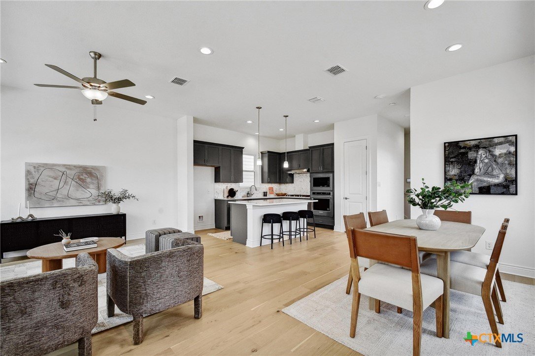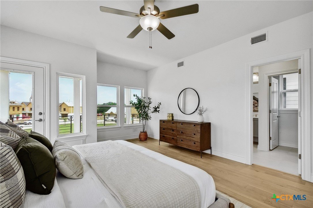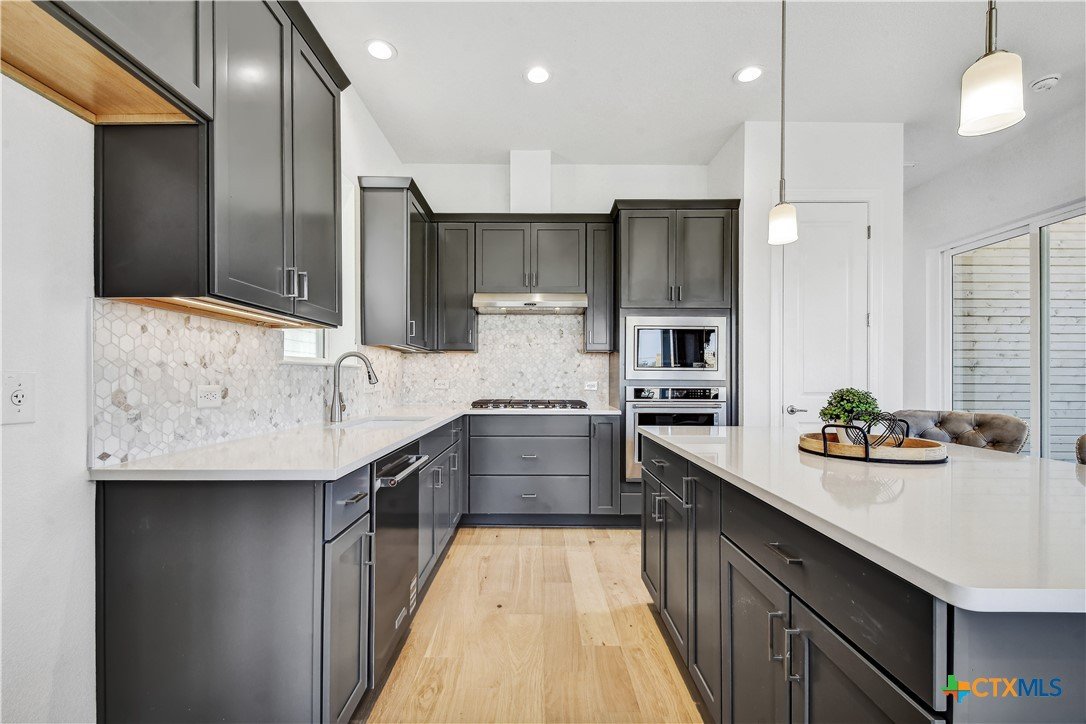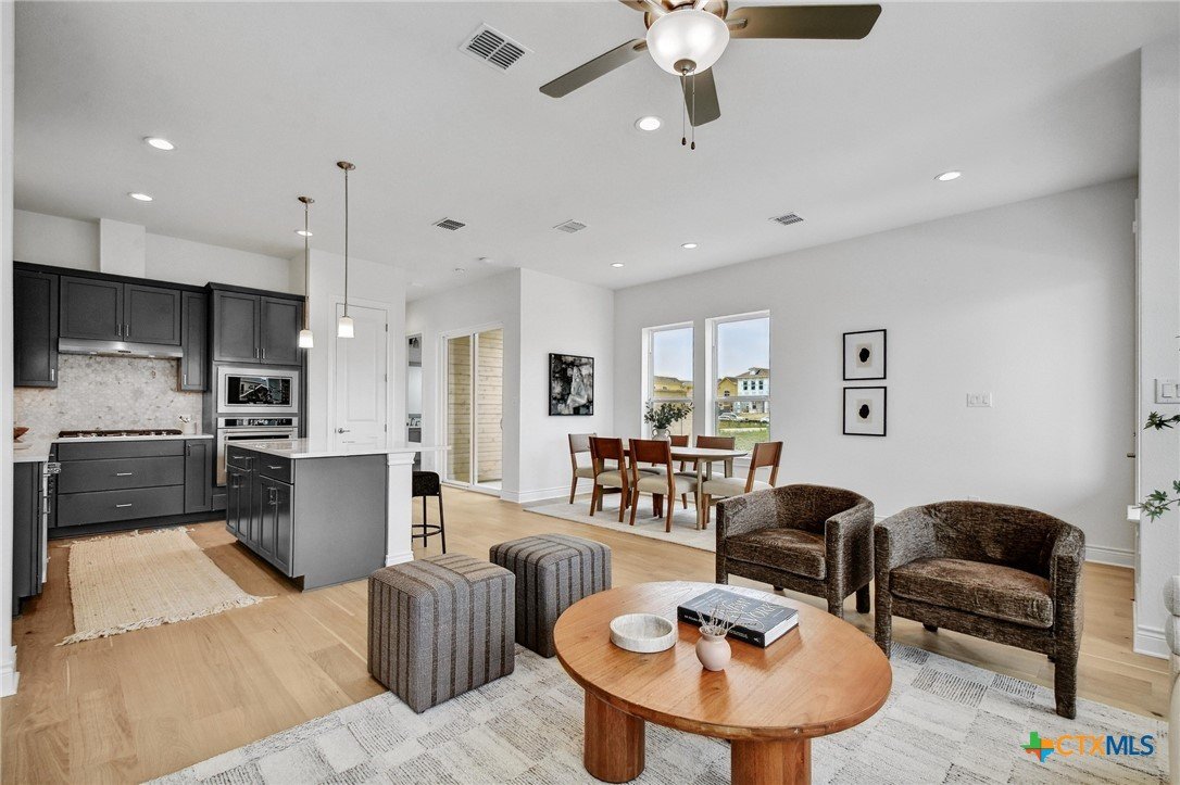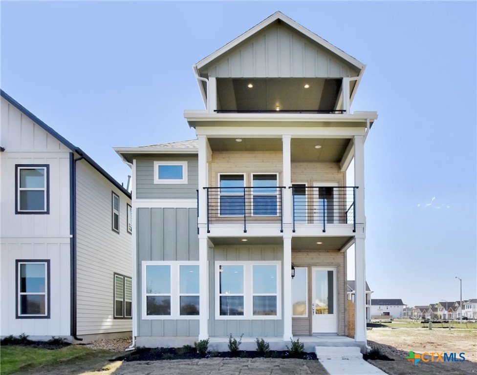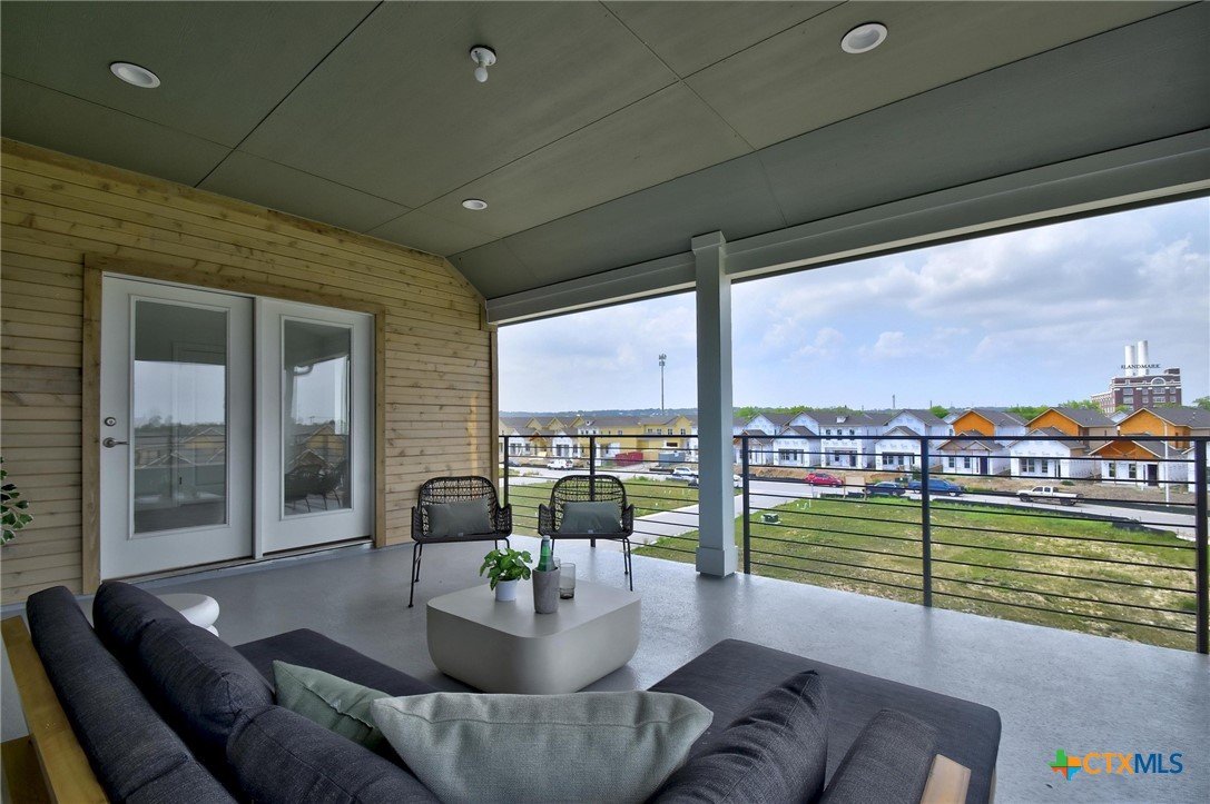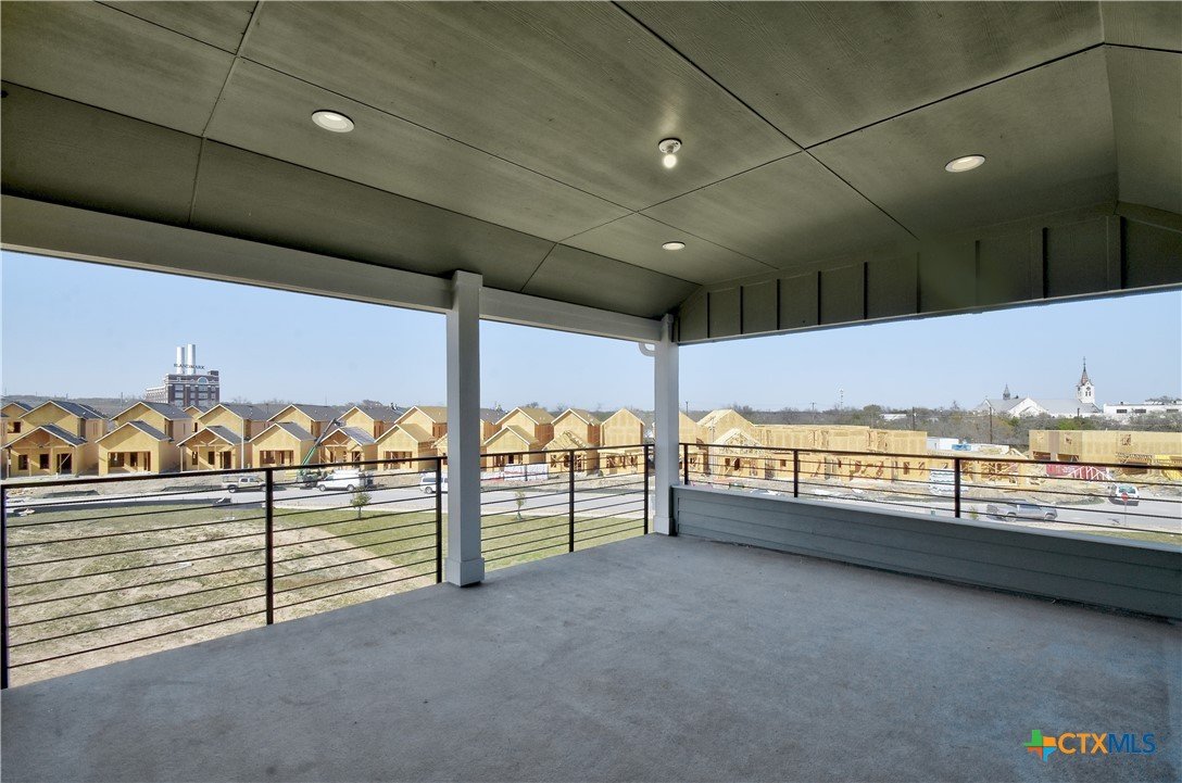 *THE ENTERTAINER'S DREAM HOME * DOWNTOWN NEW BRAUNFELS VIEWS * Swing on by and take a look at this 3-story stunner from Wes Peoples' Homes! Park and City views from the master bedroom balcony and third level living area with outdoor living space in the sought after Town Creek subdivision! Set beneath the bell tower and walking distance to shops and restaurants, Town Creek has become the hottest neighborhood in New Braunfels, TX with close proximity to everything! The well-appointed 3 bedroom, 2 full-bath, and 2 half-bath home boasts soaring ceilings and stunning wood floors throughout the spacious downstairs. At the heart of the home and open to the palatial and over-sized dining and living space is the chef's kitchen with gas cooking, built-in microwave and oven, and quartz center island with convenient counter bar seating for all your entertaining needs. Custom dark grey shaker cabinets and designer backsplash complete the luxurious yet simple design. The half-bath with quartz counters, under-cabinet lighting, and decorator tile is just off of the kitchen near the two-car garage for ease of use. At the top of the wood staircase are two secondary bedrooms with shared bath styled with quartz countertops and floating cabinets, as well as an over-sized laundry room with built-in custom cabinets and washing sink. The HUGE primary suite is a sanctuary-like space with a view from the covered balcony of the old Comal Water Plant stacks and Panther Canyon that line the nearby Comal River. Escape to the en-suite spa bathroom with large mud-set glass surround shower, double vanities with quartz counters, and HUGE walk-in closet, Luxury in Living at its Best! From the third level living/office space with spacious covered outdoor living area you feel as though you are watching the world quietly from your own private perch with the vibrant goings on in the Town Creek subdivision. Come on by and take a look before this beacon of urban lifestyle is gone!