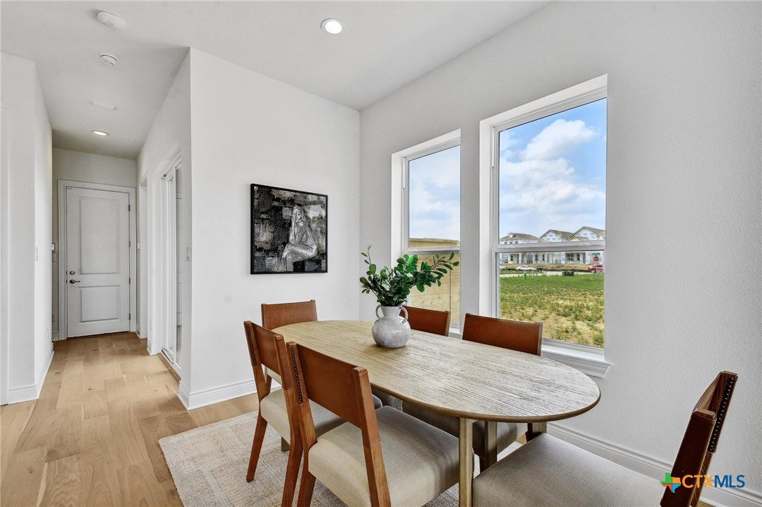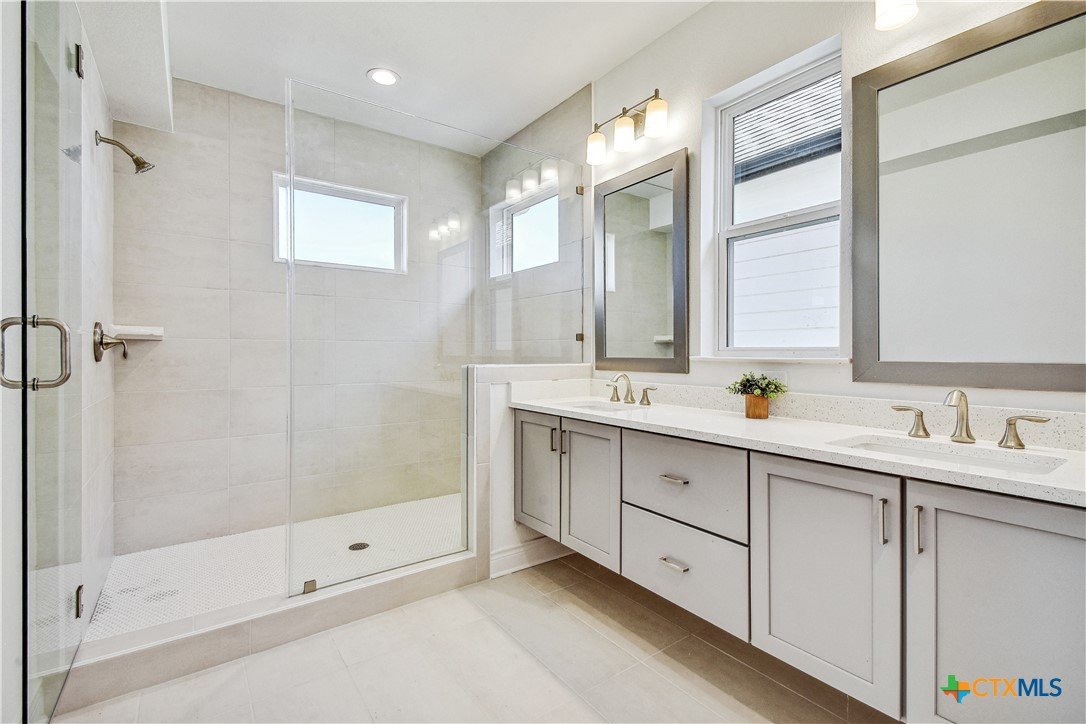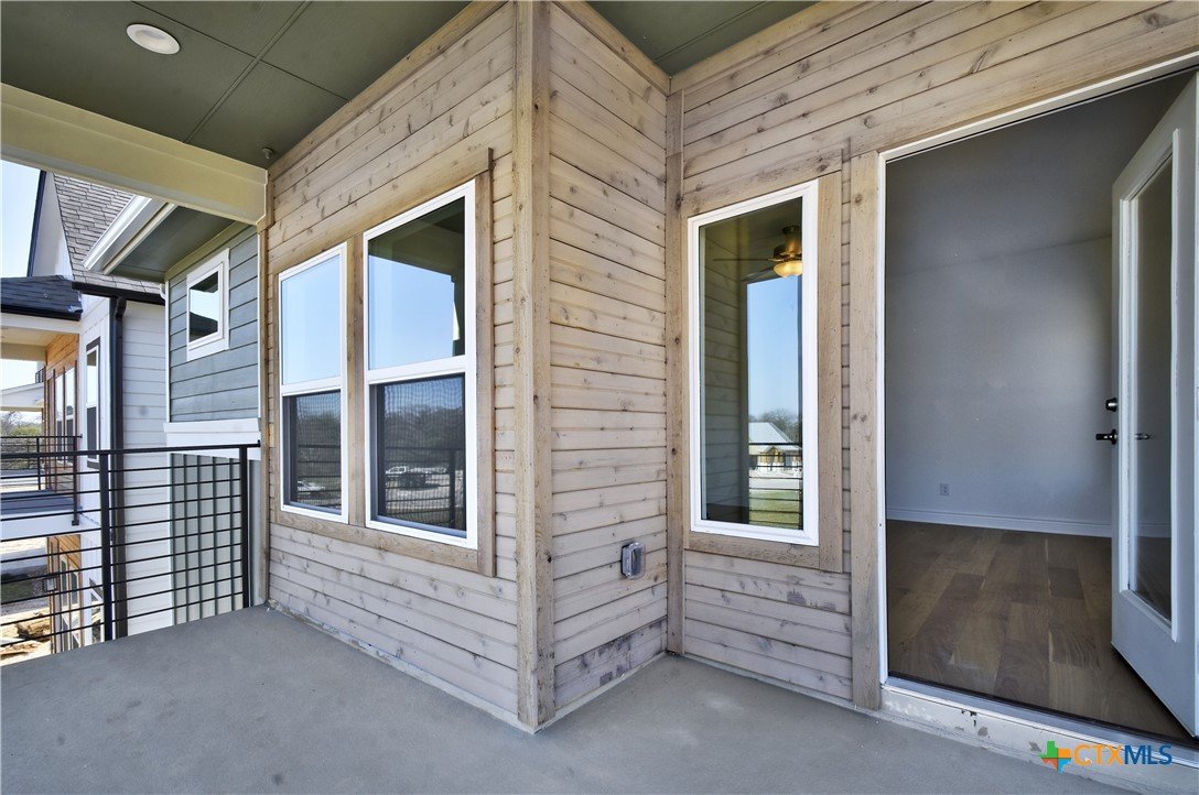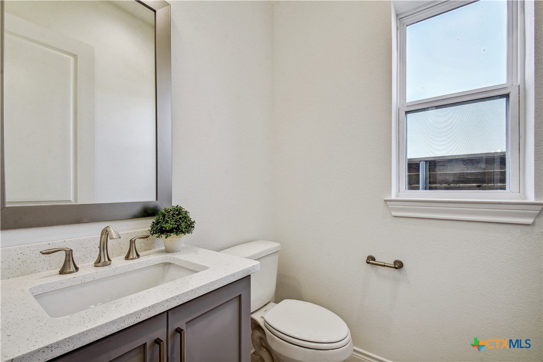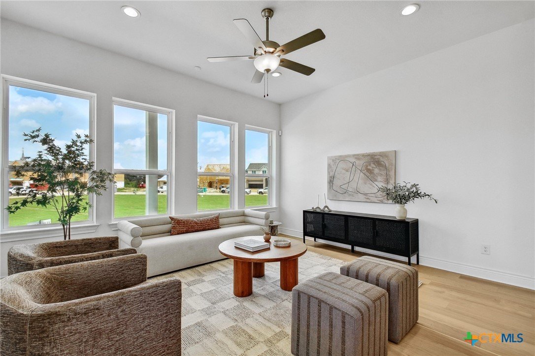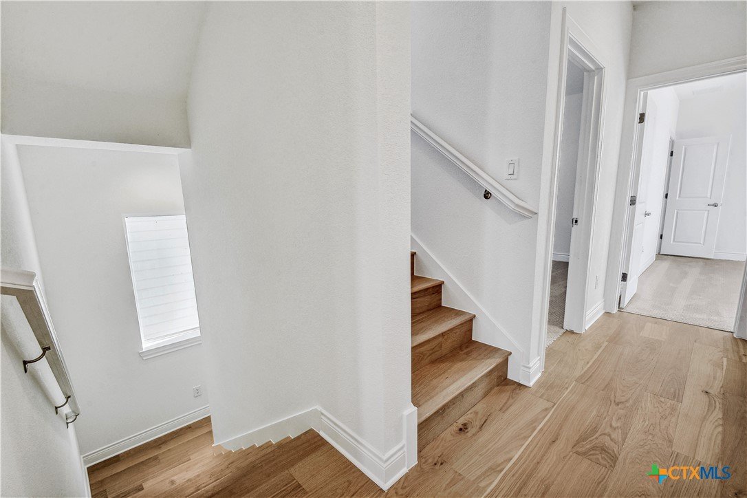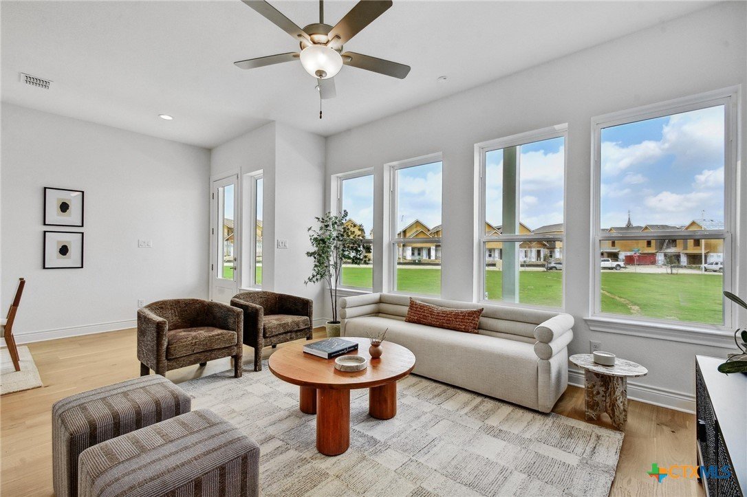 *THE ENTERTAINER'S DREAM HOME * DOWNTOWN NEW BRAUNFELS VIEWS * Swing on by and take a look at this 3-story stunner from Wes Peoples' Homes! Park and City views from the master bedroom balcony and third level living area with outdoor living space in the sought after Town Creek subdivision! Set beneath the bell tower and walking distance to shops and restaurants, Town Creek has become the hottest neighborhood in New Braunfels, TX with close proximity to everything! The well-appointed 3 bedroom, 2 full-bath, and 2 half-bath home boasts soaring ceilings and stunning wood floors throughout the spacious downstairs. At the heart of the home and open to the palatial and over-sized dining and living space is the chef's kitchen with gas cooking, built-in microwave and oven, and quartz center island with convenient counter bar seating for all your entertaining needs. Custom dark grey shaker cabinets and designer backsplash complete the luxurious yet simple design. The half-bath with quartz counters, under-cabinet lighting, and decorator tile is just off of the kitchen near the two-car garage for ease of use. At the top of the wood staircase are two secondary bedrooms with shared bath styled with quartz countertops and floating cabinets, as well as an over-sized laundry room with built-in custom cabinets and washing sink. The HUGE primary suite is a sanctuary-like space with a view from the covered balcony of the old Comal Water Plant stacks and Panther Canyon that line the nearby Comal River. Escape to the en-suite spa bathroom with large mud-set glass surround shower, double vanities with quartz counters, and HUGE walk-in closet, Luxury in Living at its Best! From the third level living/office space with spacious covered outdoor living area you feel as though you are watching the world quietly from your own private perch with the vibrant goings on in the Town Creek subdivision. Come on by and take a look before this beacon of urban lifestyle is gone!