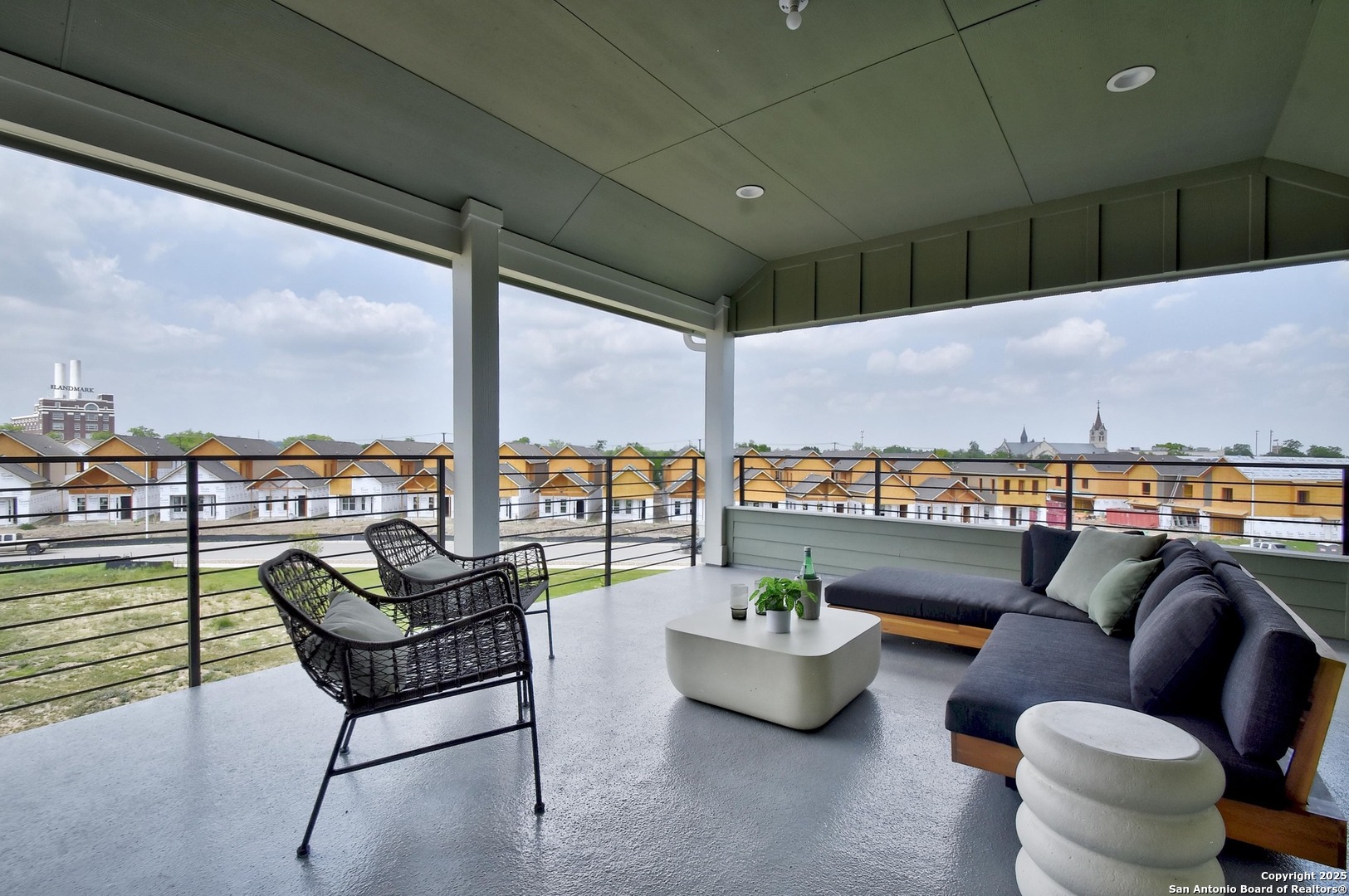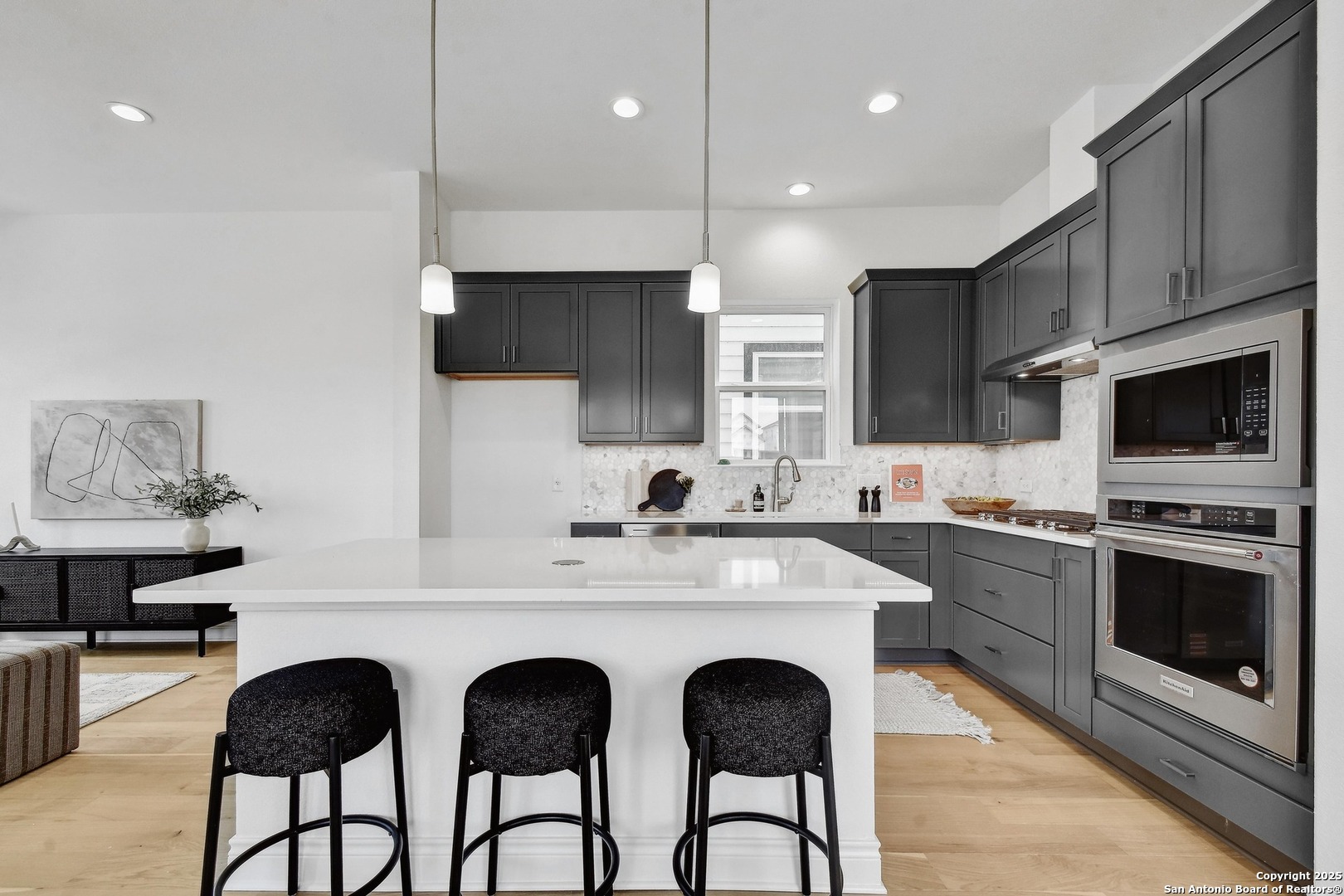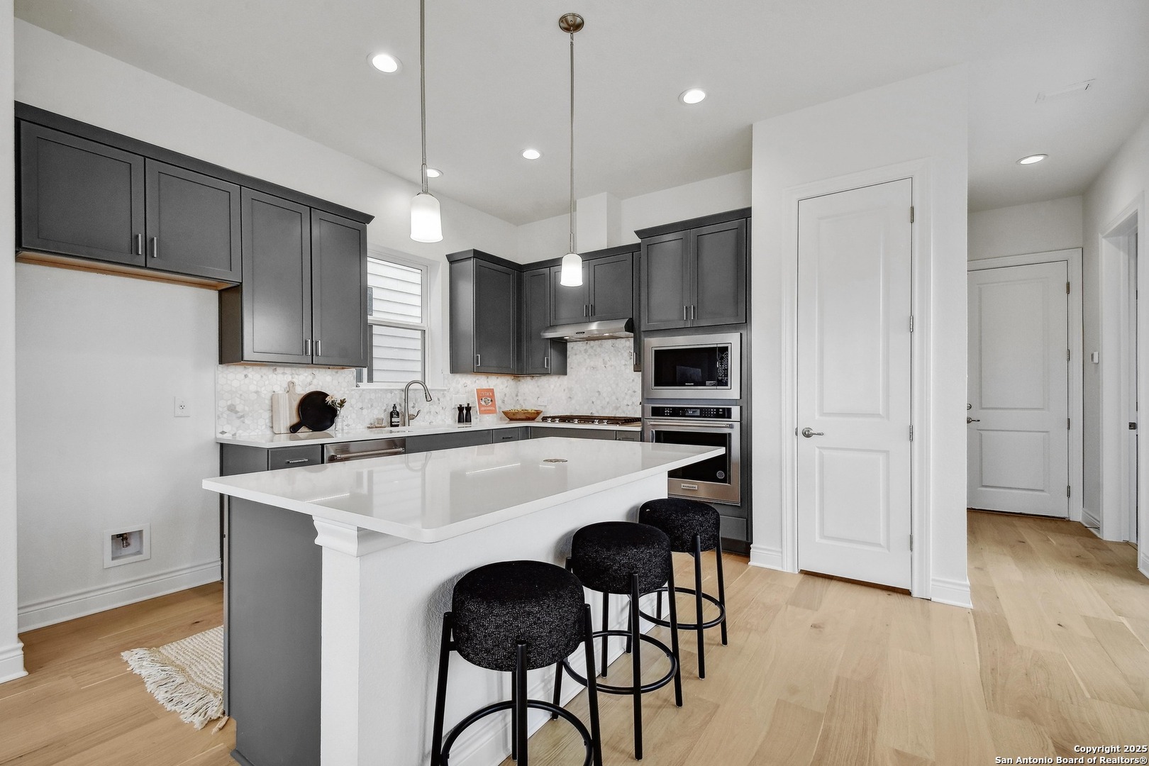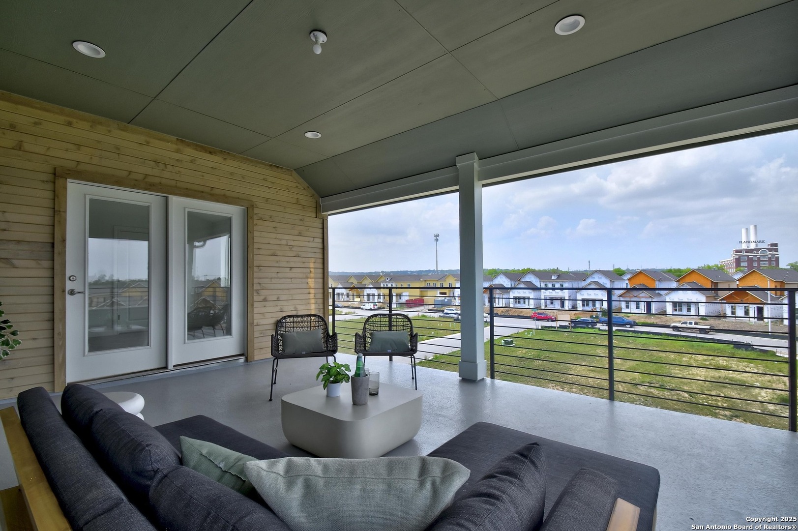 *THE ENTERTAINER'S DREAM HOME * DOWNTOWN NEW BRAUNFELS VIEWS * Swing on by and take a look at this 3-story stunner from Wes Peoples' Homes! Park and City views from the master bedroom balcony and third level living area with outdoor living space in the sought after Town Creek subdivision! Set beneath the bell tower and walking distance to shops and restaurants, Town Creek has become the hottest neighborhood in New Braunfels, TX with close proximity to everything! The well-appointed 3 bedroom, 2 full-bath, and 2 half-bath home boasts soaring ceilings and stunning wood floors throughout the spacious downstairs. At the heart of the home and open to the palatial and over-sized dining and living space is the chef's kitchen with gas cooking, built-in microwave and oven, and quartz center island with convenient counter bar seating for all your entertaining needs. Custom dark grey shaker cabinets and designer backsplash complete the luxurious yet simple design. Don't get lost in the walk-in pantry! The half-bath with quartz counters, under-cabinet lighting, and decorator tile is just off of the kitchen near the two-car garage for ease of use. At the top of the wood staircase are two secondary bedrooms with shared bath styled with quartz countertops and floating cabinets, as well as an over-sized laundry room with built-in custom cabinets and washing sink. The HUGE primary suite is a sanctuary-like space with a view from the covered balcony of the old Comal Water Plant stacks and Panther Canyon that line the nearby Comal River. Escape to the en-suite spa bathroom with large mud-set glass surround shower, double vanities with quartz counters, and HUGE walk-in closet, Luxury in Living at its Best! From the third level living/office space with spacious. covered outdoor living area you feel as though you are watching the world quietly from your own private perch with the vibrant goings on of neighbors bicycling and walking to their favorite coffee shop or strolling down to the gym to get in a work-out. The New Settlers in Town Creek revel in a lifestyle much like living on vacation! Quality craftmanship and classic design at every touch. Everything that "in town" living affords is right outside your front door. Come on by and take a look before this beacon of urban lifestyle is gone!