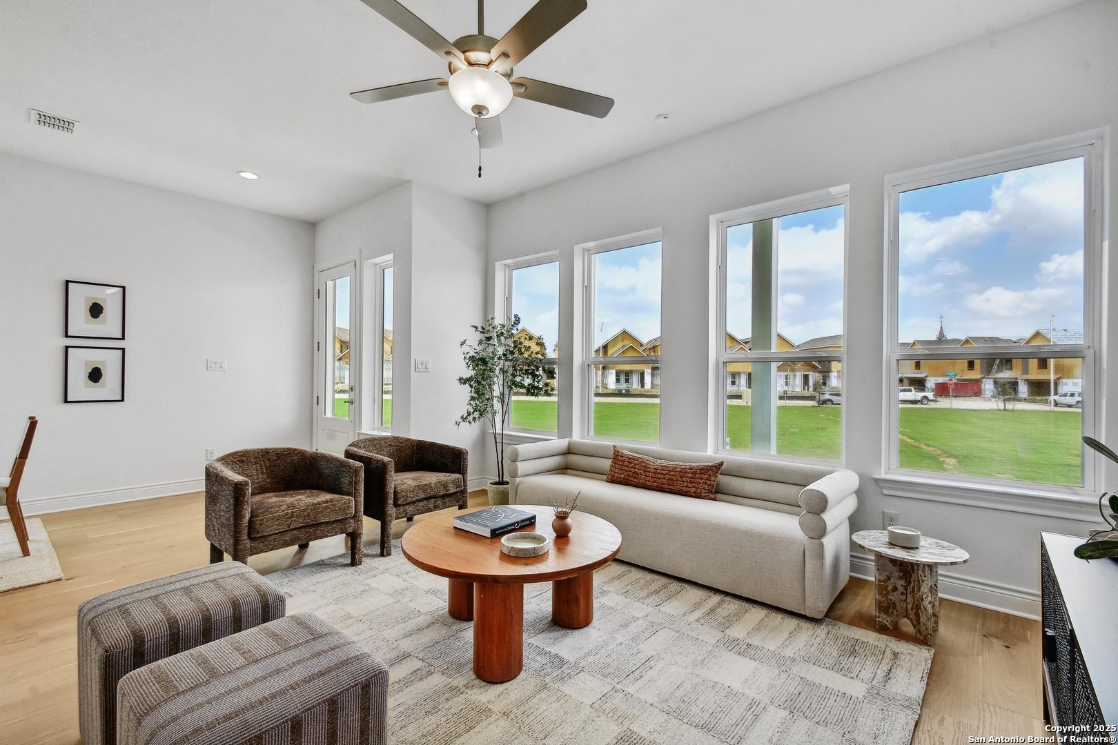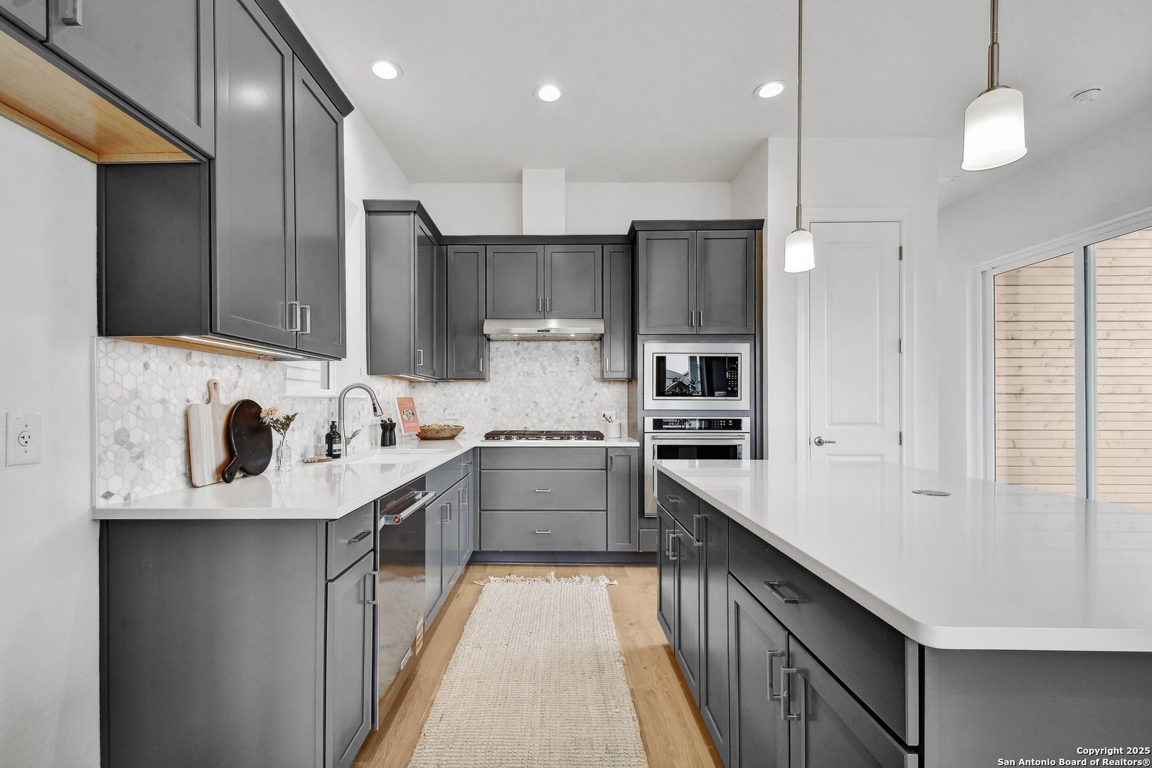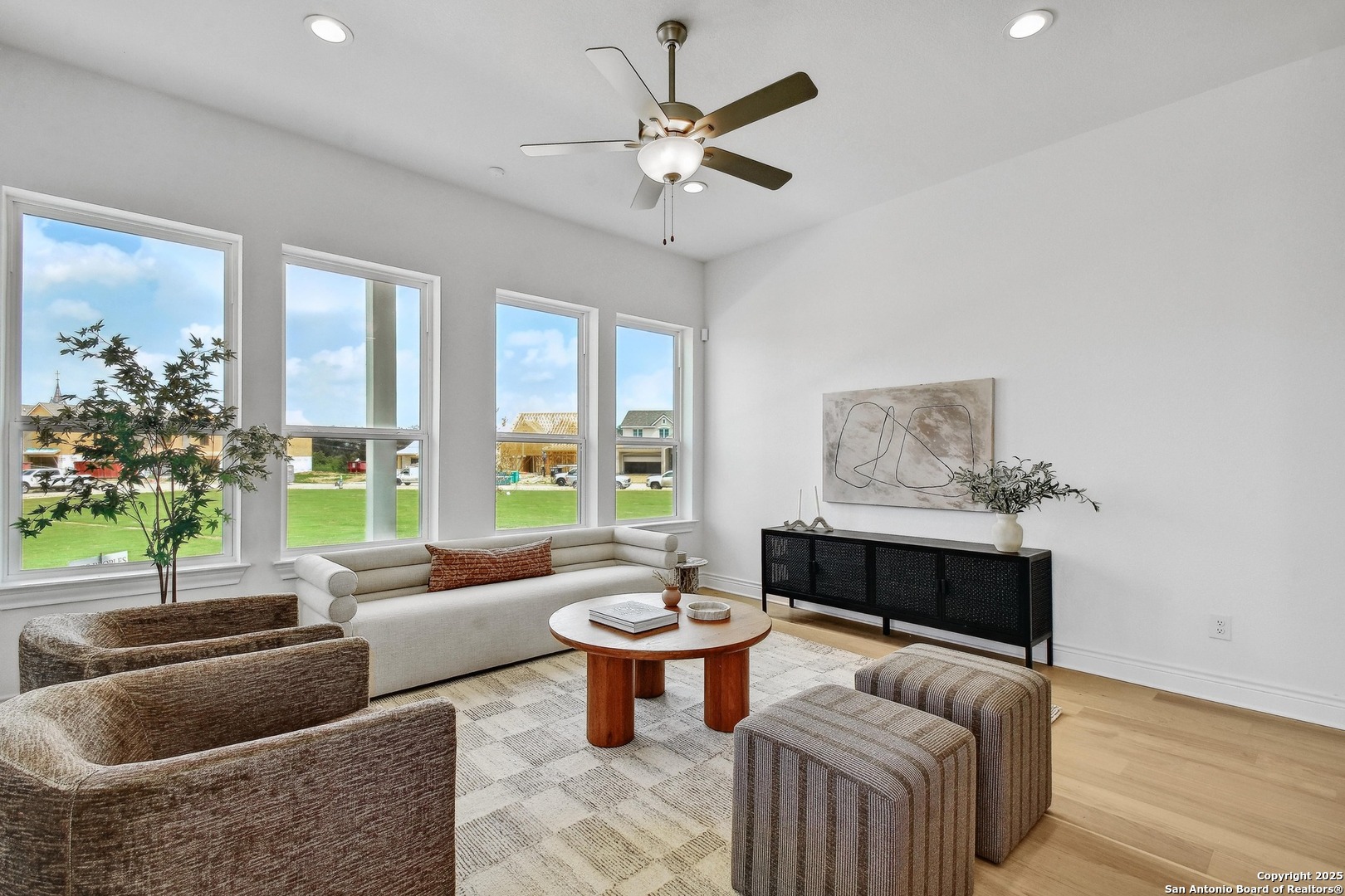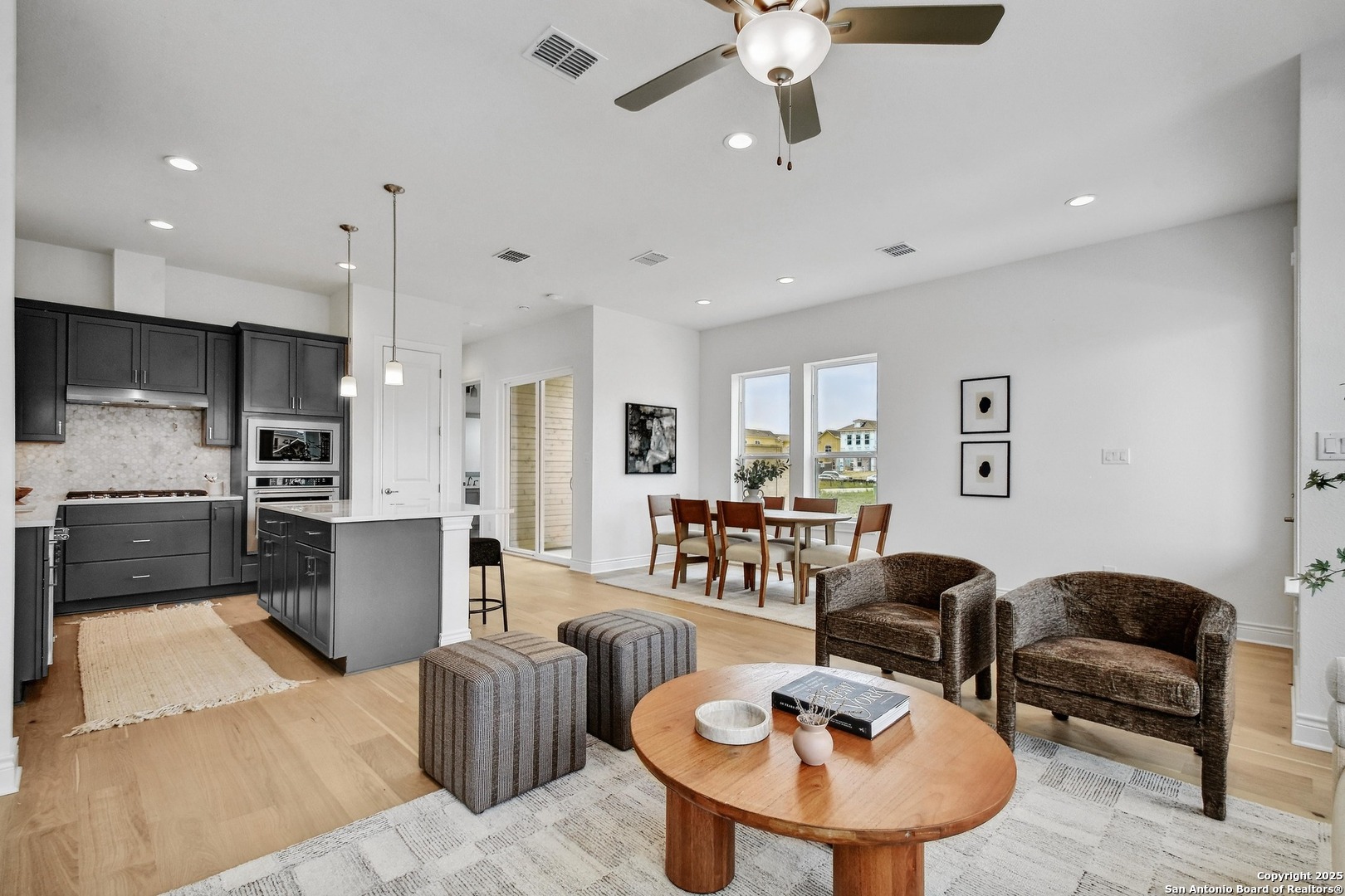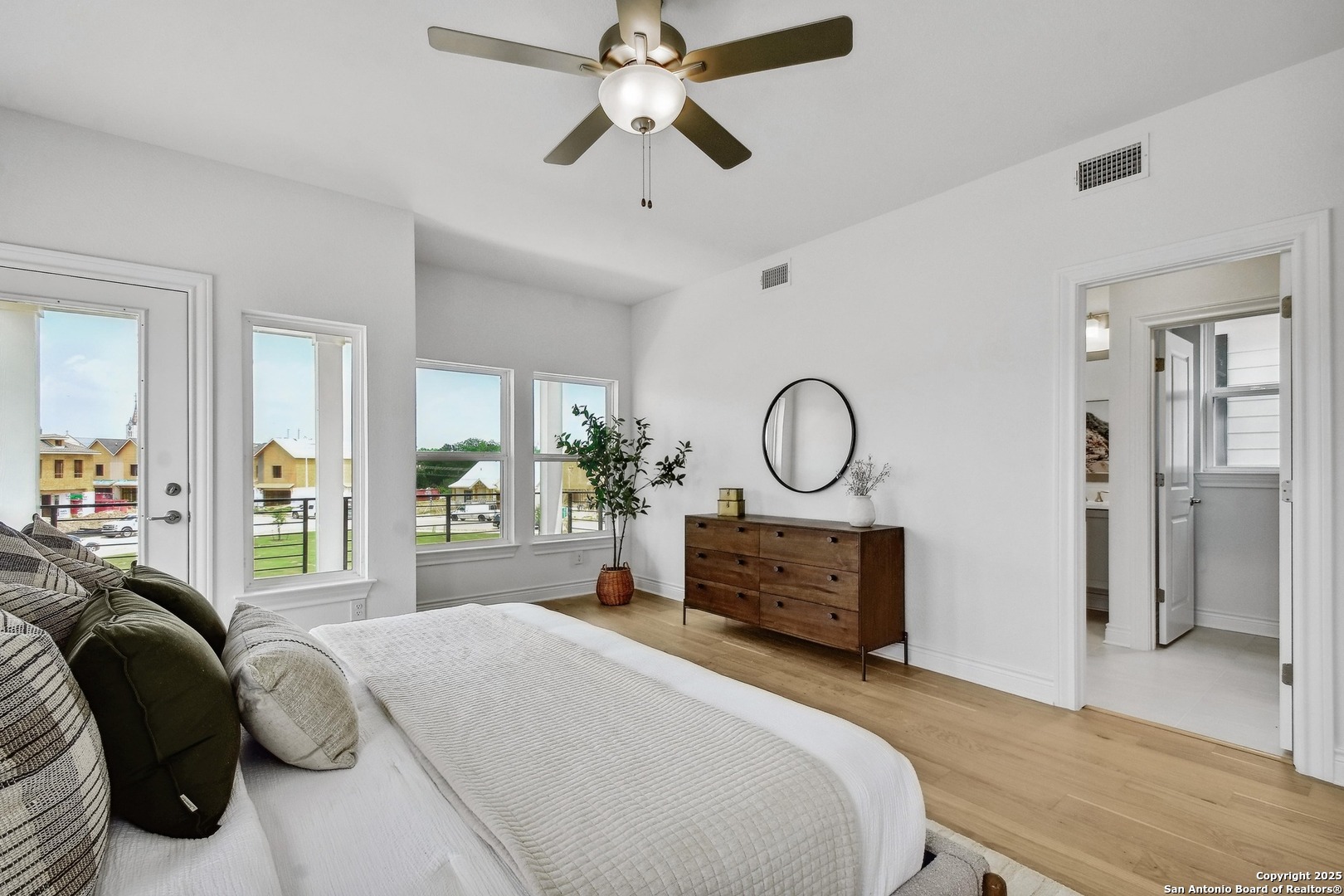 *THE ENTERTAINER'S DREAM HOME * DOWNTOWN NEW BRAUNFELS VIEWS * Swing on by and take a look at this 3-story stunner from Wes Peoples' Homes! Park and City views from the master bedroom balcony and third level living area with outdoor living space in the sought after Town Creek subdivision! Set beneath the bell tower and walking distance to shops and restaurants, Town Creek has become the hottest neighborhood in New Braunfels, TX with close proximity to everything! The well-appointed 3 bedroom, 2 full-bath, and 2 half-bath home boasts soaring ceilings and stunning wood floors throughout the spacious downstairs. At the heart of the home and open to the palatial and over-sized dining and living space is the chef's kitchen with gas cooking, built-in microwave and oven, and quartz center island with convenient counter bar seating for all your entertaining needs. Custom dark grey shaker cabinets and designer backsplash complete the luxurious yet simple design. Don't get lost in the walk-in pantry! The half-bath with quartz counters, under-cabinet lighting, and decorator tile is just off of the kitchen near the two-car garage for ease of use. At the top of the wood staircase are two secondary bedrooms with shared bath styled with quartz countertops and floating cabinets, as well as an over-sized laundry room with built-in custom cabinets and washing sink. The HUGE primary suite is a sanctuary-like space with a view from the covered balcony of the old Comal Water Plant stacks and Panther Canyon that line the nearby Comal River. Escape to the en-suite spa bathroom with large mud-set glass surround shower, double vanities with quartz counters, and HUGE walk-in closet, Luxury in Living at its Best! From the third level living/office space with spacious. covered outdoor living area you feel as though you are watching the world quietly from your own private perch with the vibrant goings on of neighbors bicycling and walking to their favorite coffee shop or strolling down to the gym to get in a work-out. The New Settlers in Town Creek revel in a lifestyle much like living on vacation! Quality craftmanship and classic design at every touch. Everything that "in town" living affords is right outside your front door. Come on by and take a look before this beacon of urban lifestyle is gone!