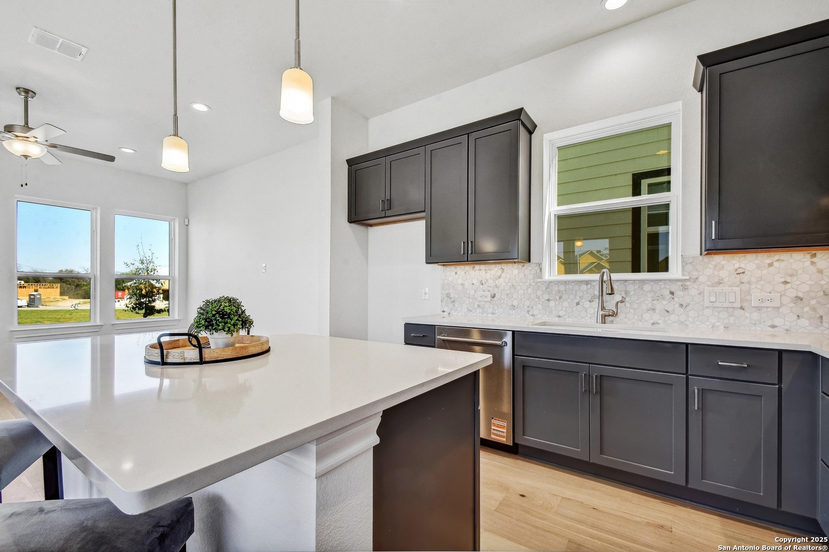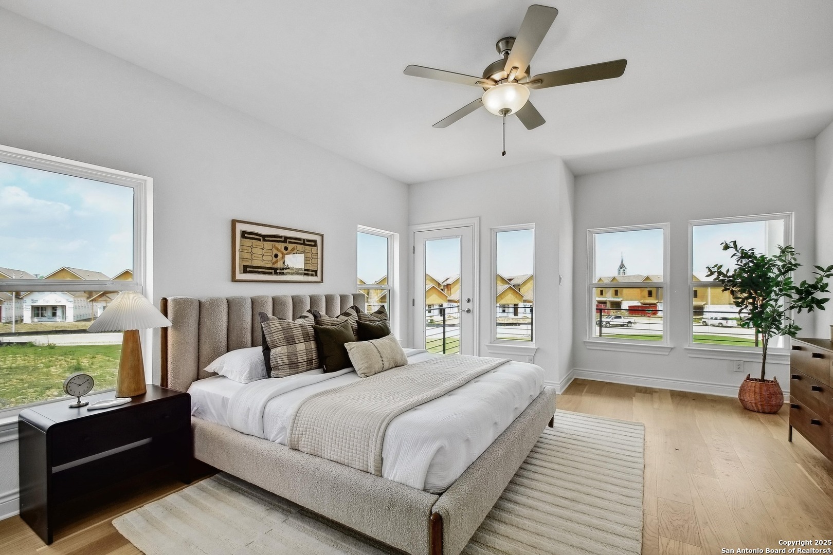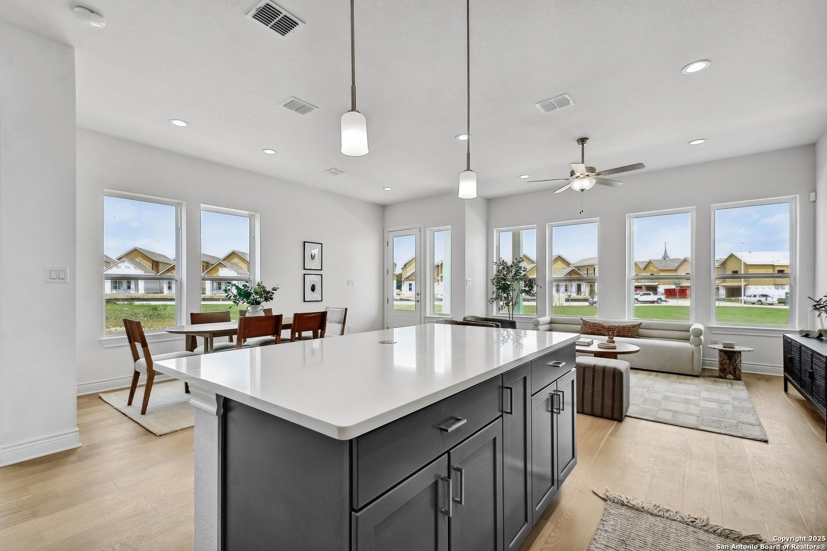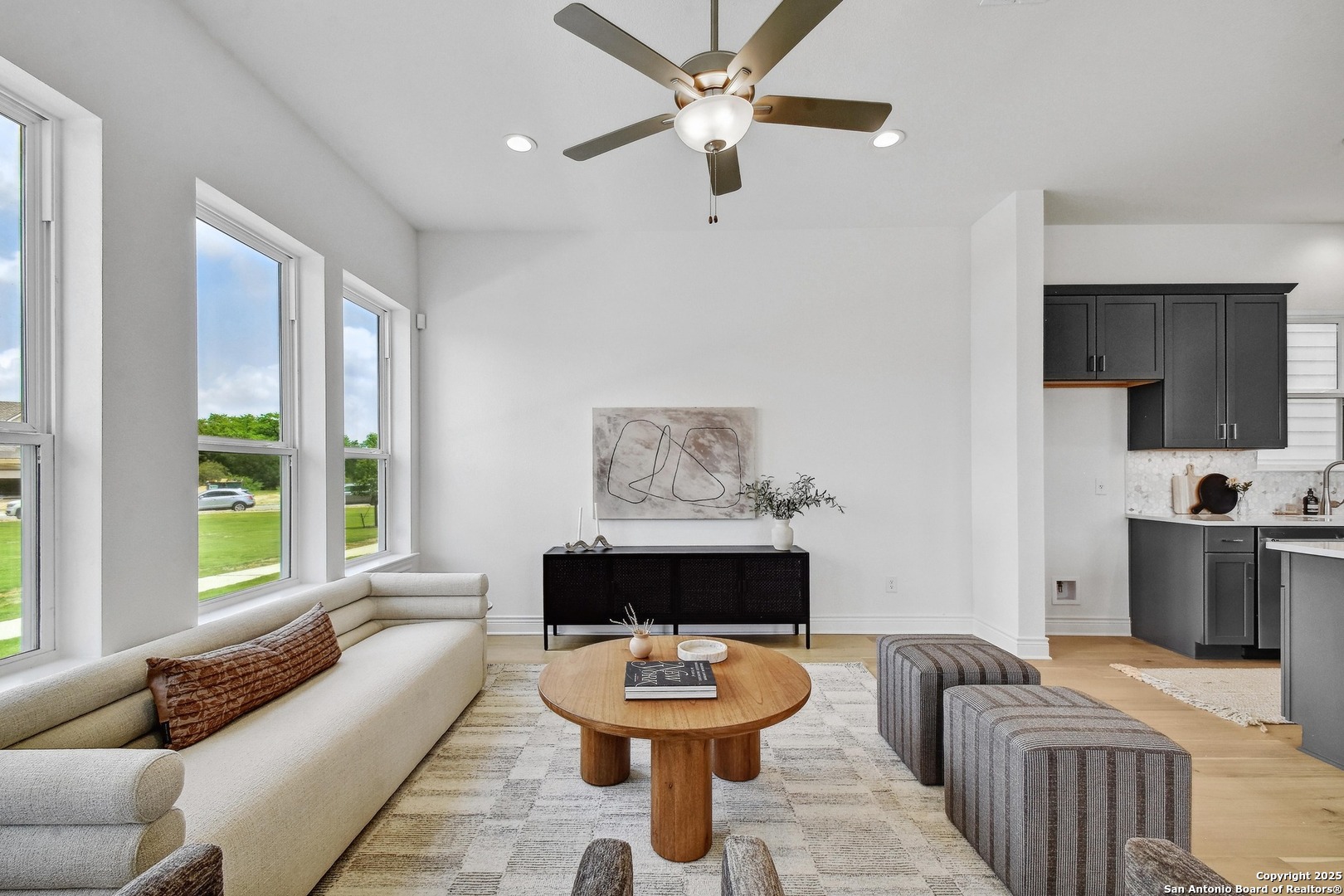 *THE ENTERTAINER'S DREAM HOME * DOWNTOWN NEW BRAUNFELS VIEWS * Swing on by and take a look at this 3-story stunner from Wes Peoples' Homes! Park and City views from the master bedroom balcony and third level living area with outdoor living space in the sought after Town Creek subdivision! Set beneath the bell tower and walking distance to shops and restaurants, Town Creek has become the hottest neighborhood in New Braunfels, TX with close proximity to everything! The well-appointed 3 bedroom, 2 full-bath, and 2 half-bath home boasts soaring ceilings and stunning wood floors throughout the spacious downstairs. At the heart of the home and open to the palatial and over-sized dining and living space is the chef's kitchen with gas cooking, built-in microwave and oven, and quartz center island with convenient counter bar seating for all your entertaining needs. Custom dark grey shaker cabinets and designer backsplash complete the luxurious yet simple design. Don't get lost in the walk-in pantry! The half-bath with quartz counters, under-cabinet lighting, and decorator tile is just off of the kitchen near the two-car garage for ease of use. At the top of the wood staircase are two secondary bedrooms with shared bath styled with quartz countertops and floating cabinets, as well as an over-sized laundry room with built-in custom cabinets and washing sink. The HUGE primary suite is a sanctuary-like space with a view from the covered balcony of the old Comal Water Plant stacks and Panther Canyon that line the nearby Comal River. Escape to the en-suite spa bathroom with large mud-set glass surround shower, double vanities with quartz counters, and HUGE walk-in closet, Luxury in Living at its Best! From the third level living/office space with spacious. covered outdoor living area you feel as though you are watching the world quietly from your own private perch with the vibrant goings on of neighbors bicycling and walking to their favorite coffee shop or strolling down to the gym to get in a work-out. The New Settlers in Town Creek revel in a lifestyle much like living on vacation! Quality craftmanship and classic design at every touch. Everything that "in town" living affords is right outside your front door. Come on by and take a look before this beacon of urban lifestyle is gone!