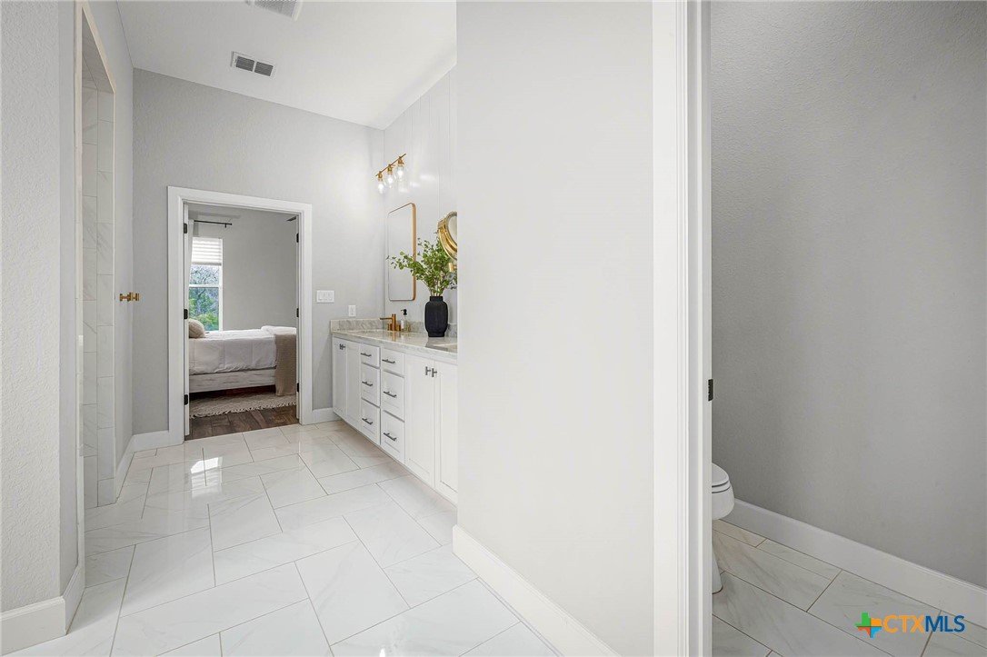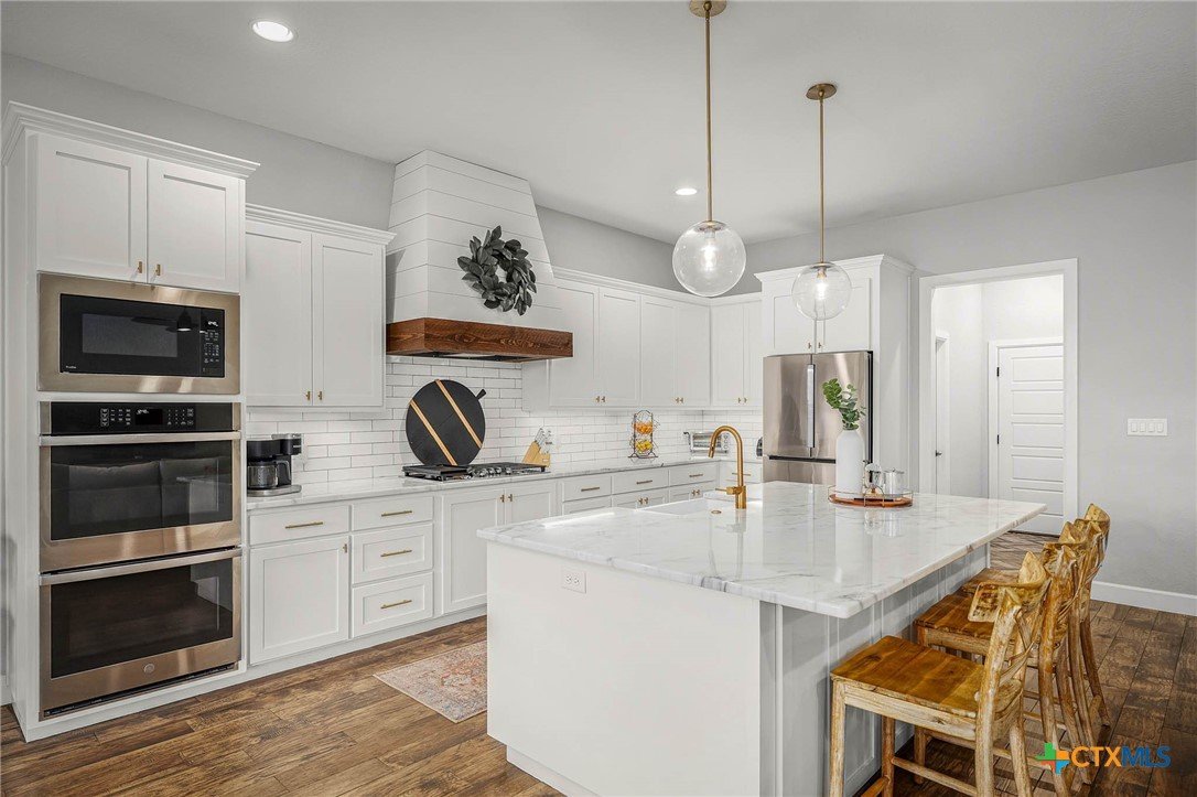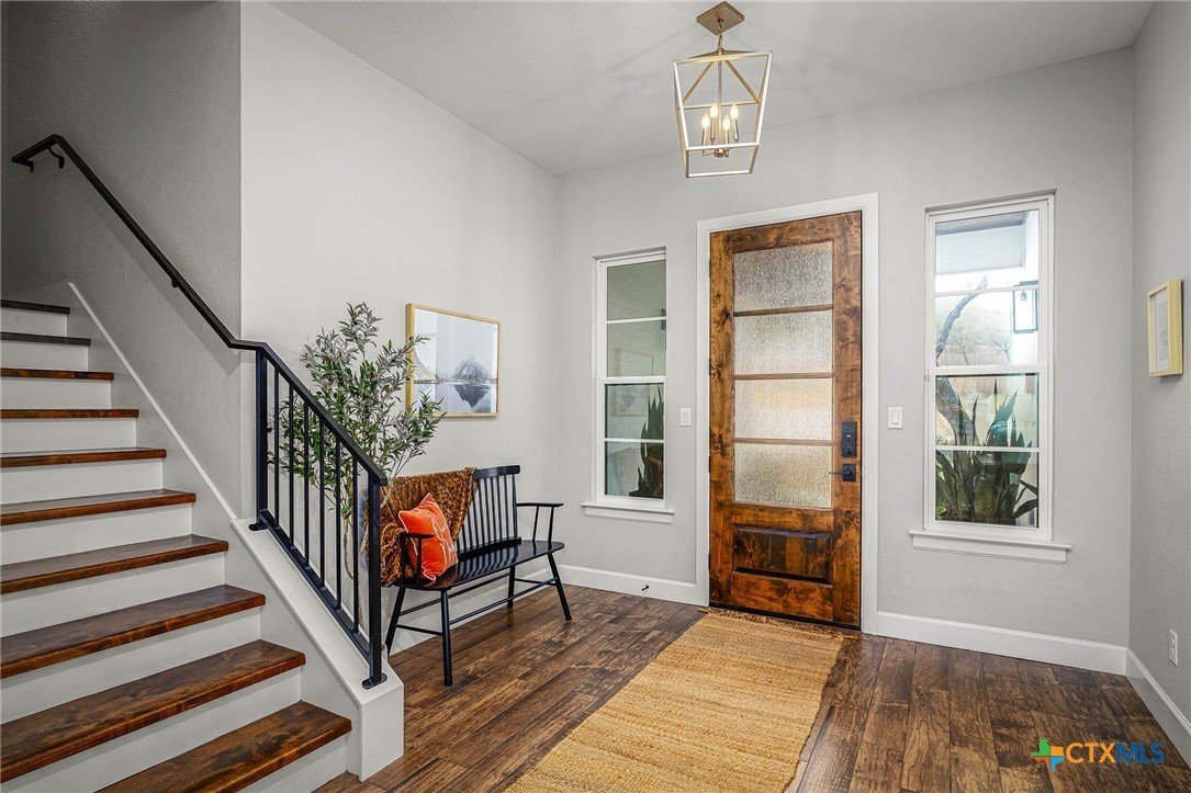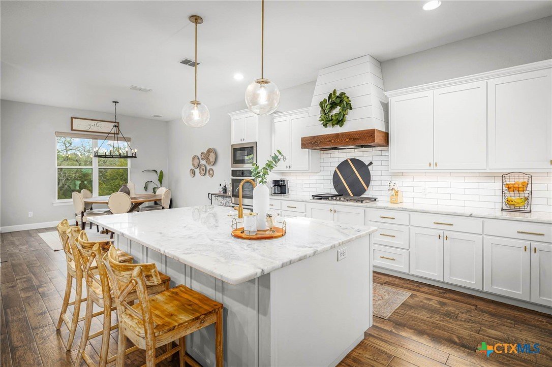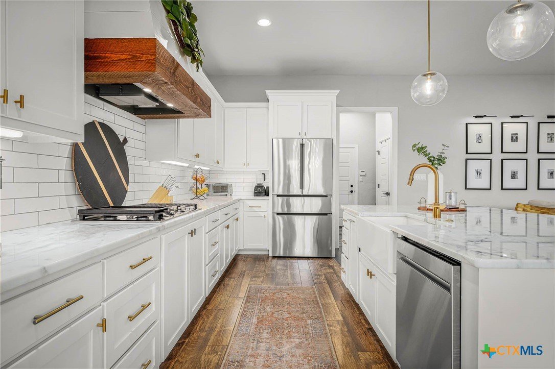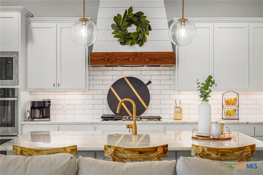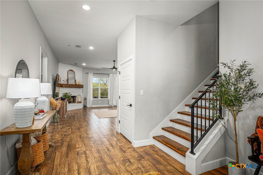 Now Offering $8000 Closing Cost Assistance!! Welcome to 635 Williams Way, a beautifully designed home built in 2021 by Meyer Brandt Custom Homes, with ideal location on the Hill in the heart of New Braunfels. Nestled among mature trees with peaceful greenbelt views, this home blends timeless style with modern comforts. The crisp white brick exterior sets the tone for the warm and inviting interior, where wood-look tile flooring flows throughout the main living areas. The open-concept kitchen is a chef’s dream, featuring clean white cabinetry, quartz countertops, a gas range, double ovens, and a custom wooden accent vent hood. The living room is anchored by a striking wooden mantle fireplace, creating the perfect ambiance for cozy evenings. The primary suite is privately situated on the main floor and boasts a spa-like en suite bath with dual vanities, a separate tub, and a walk-in shower. A downstairs guest suite with an adjacent full bath offers comfort and convenience. Upstairs, two additional bedrooms share a well-appointed full bath. With thoughtful design, and stylish finishes, this home is move in ready! No renovation necessary! Enjoy close proximity to Landa Park, Downtown New Braunfels, Gruene, Schlitterbahn, Landa Park Golf Course, and so much more!