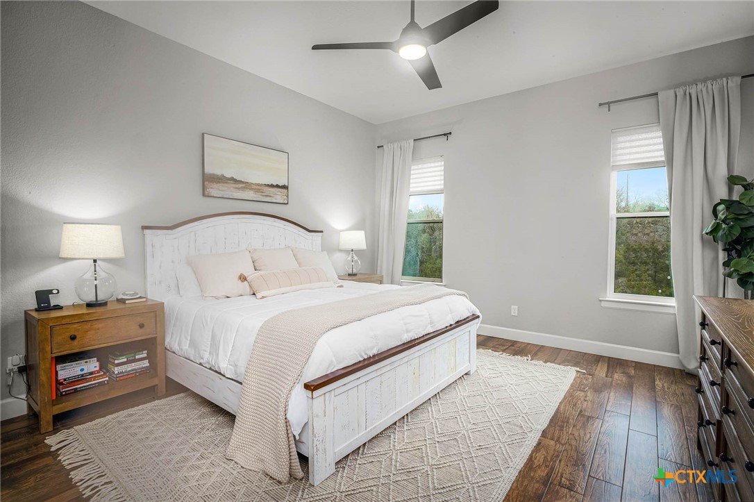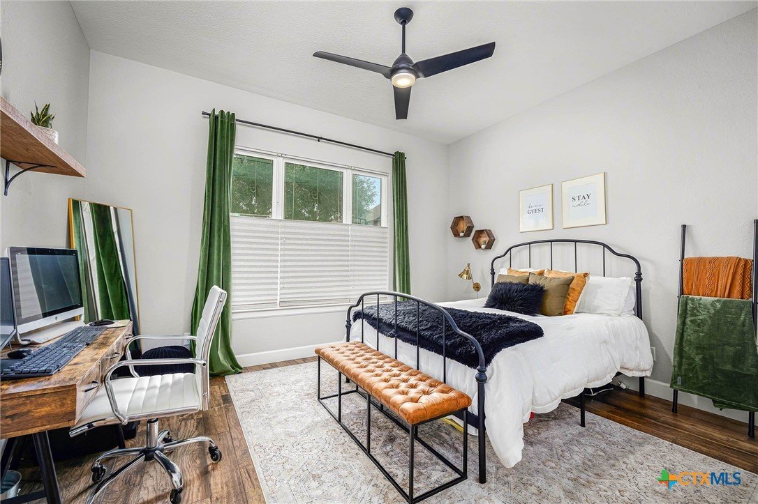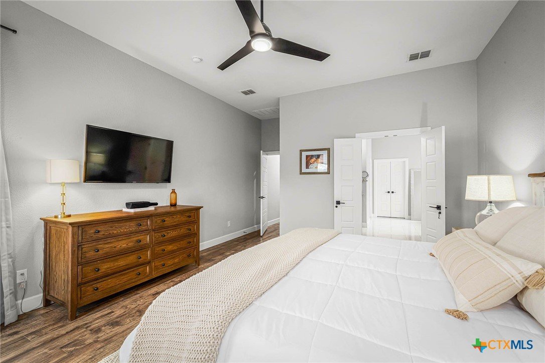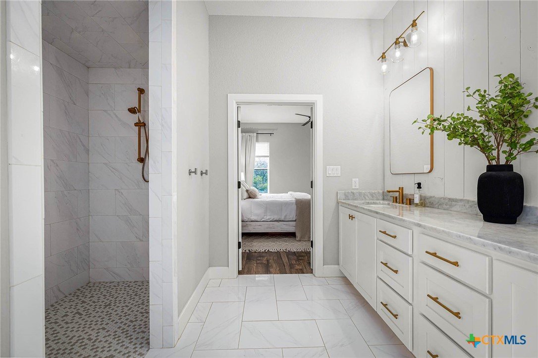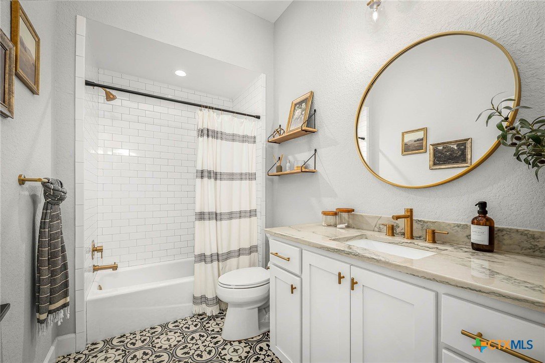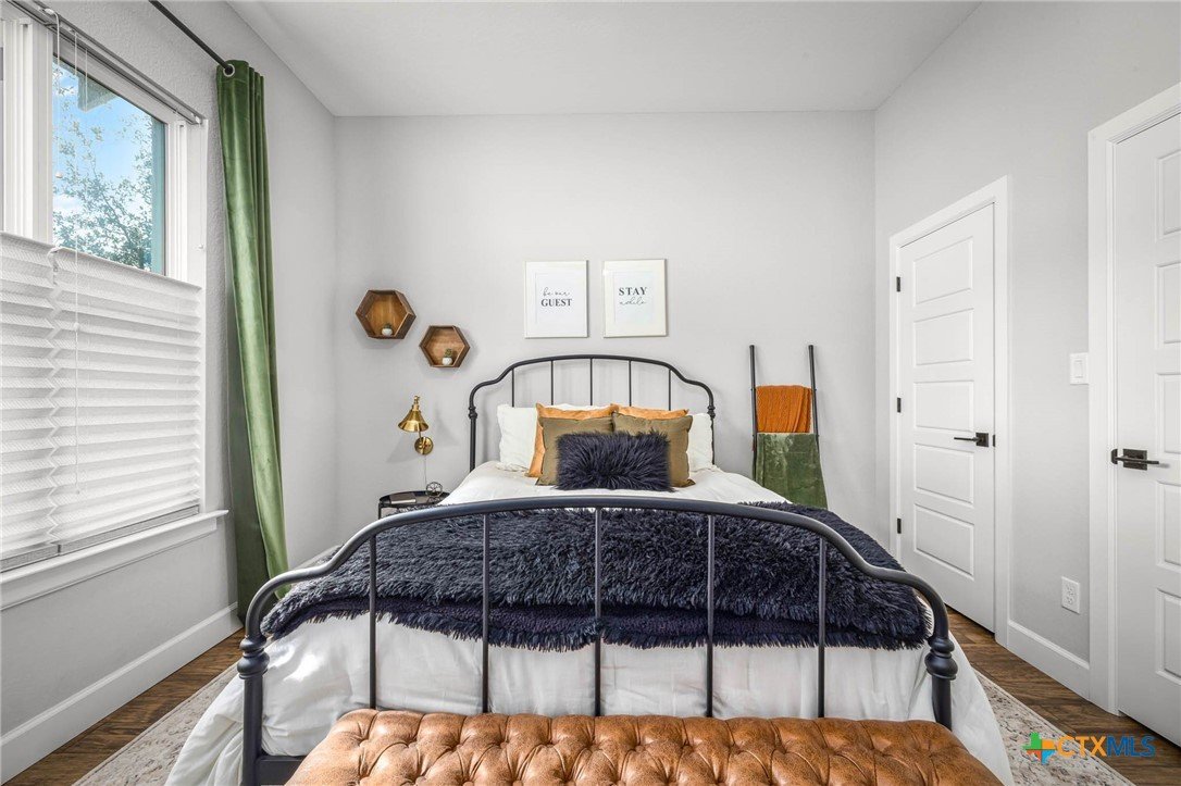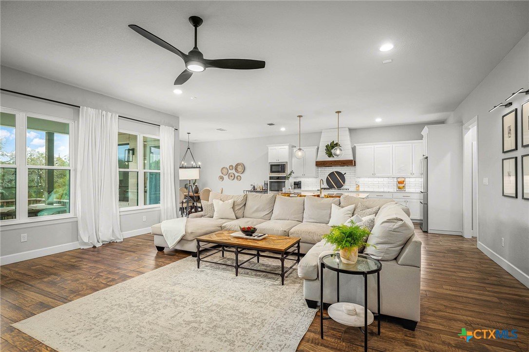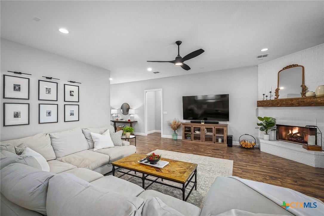 Now Offering $8000 Closing Cost Assistance!! Welcome to 635 Williams Way, a beautifully designed home built in 2021 by Meyer Brandt Custom Homes, with ideal location on the Hill in the heart of New Braunfels. Nestled among mature trees with peaceful greenbelt views, this home blends timeless style with modern comforts. The crisp white brick exterior sets the tone for the warm and inviting interior, where wood-look tile flooring flows throughout the main living areas. The open-concept kitchen is a chef’s dream, featuring clean white cabinetry, quartz countertops, a gas range, double ovens, and a custom wooden accent vent hood. The living room is anchored by a striking wooden mantle fireplace, creating the perfect ambiance for cozy evenings. The primary suite is privately situated on the main floor and boasts a spa-like en suite bath with dual vanities, a separate tub, and a walk-in shower. A downstairs guest suite with an adjacent full bath offers comfort and convenience. Upstairs, two additional bedrooms share a well-appointed full bath. With thoughtful design, and stylish finishes, this home is move in ready! No renovation necessary! Enjoy close proximity to Landa Park, Downtown New Braunfels, Gruene, Schlitterbahn, Landa Park Golf Course, and so much more!
