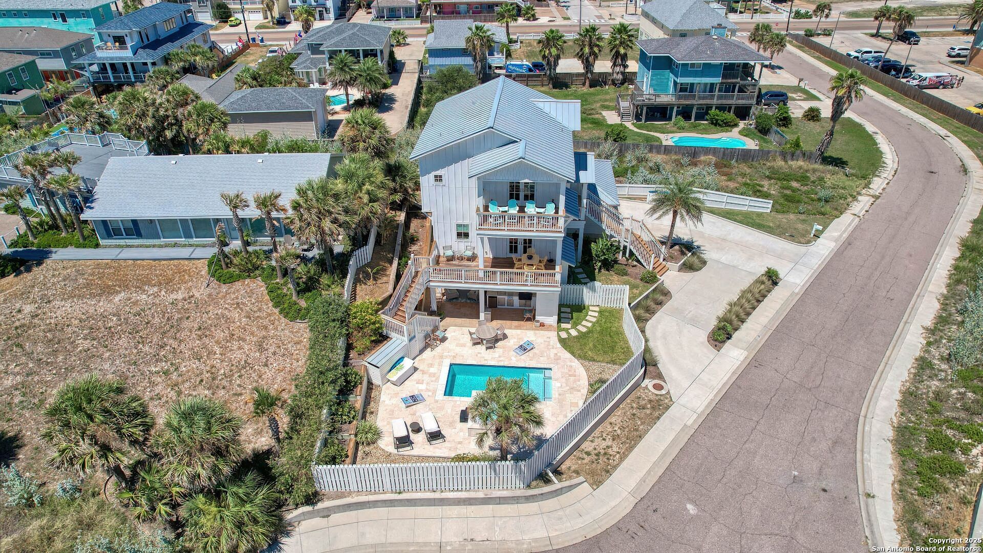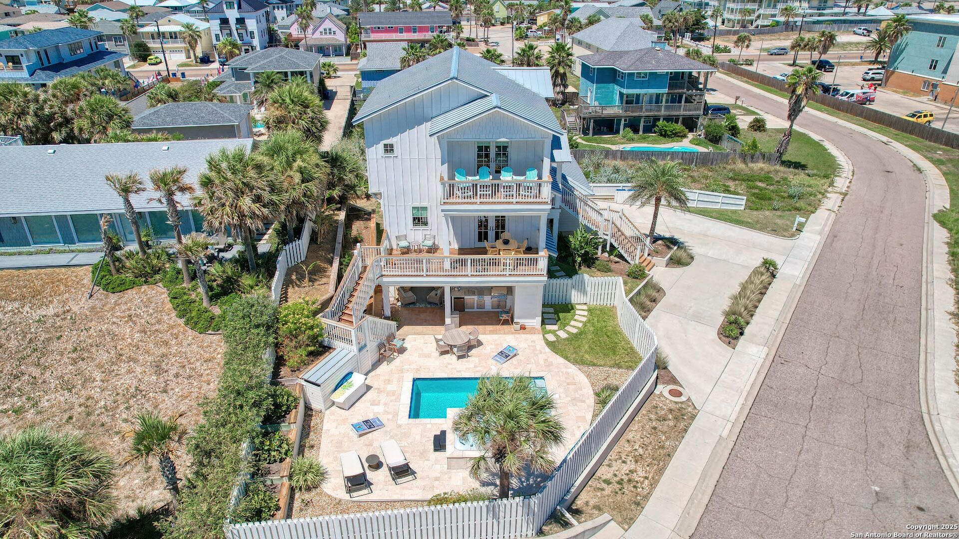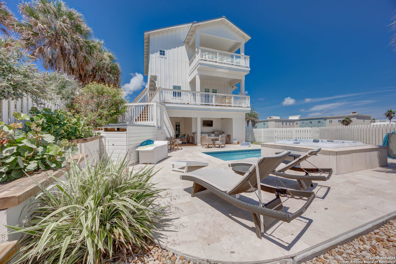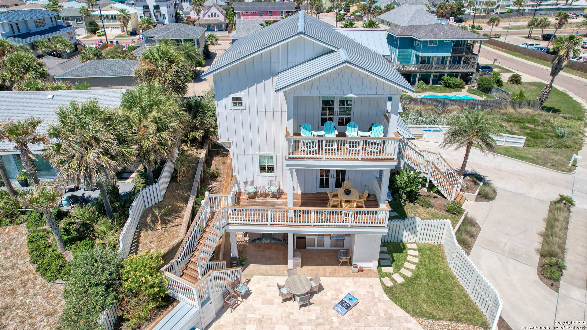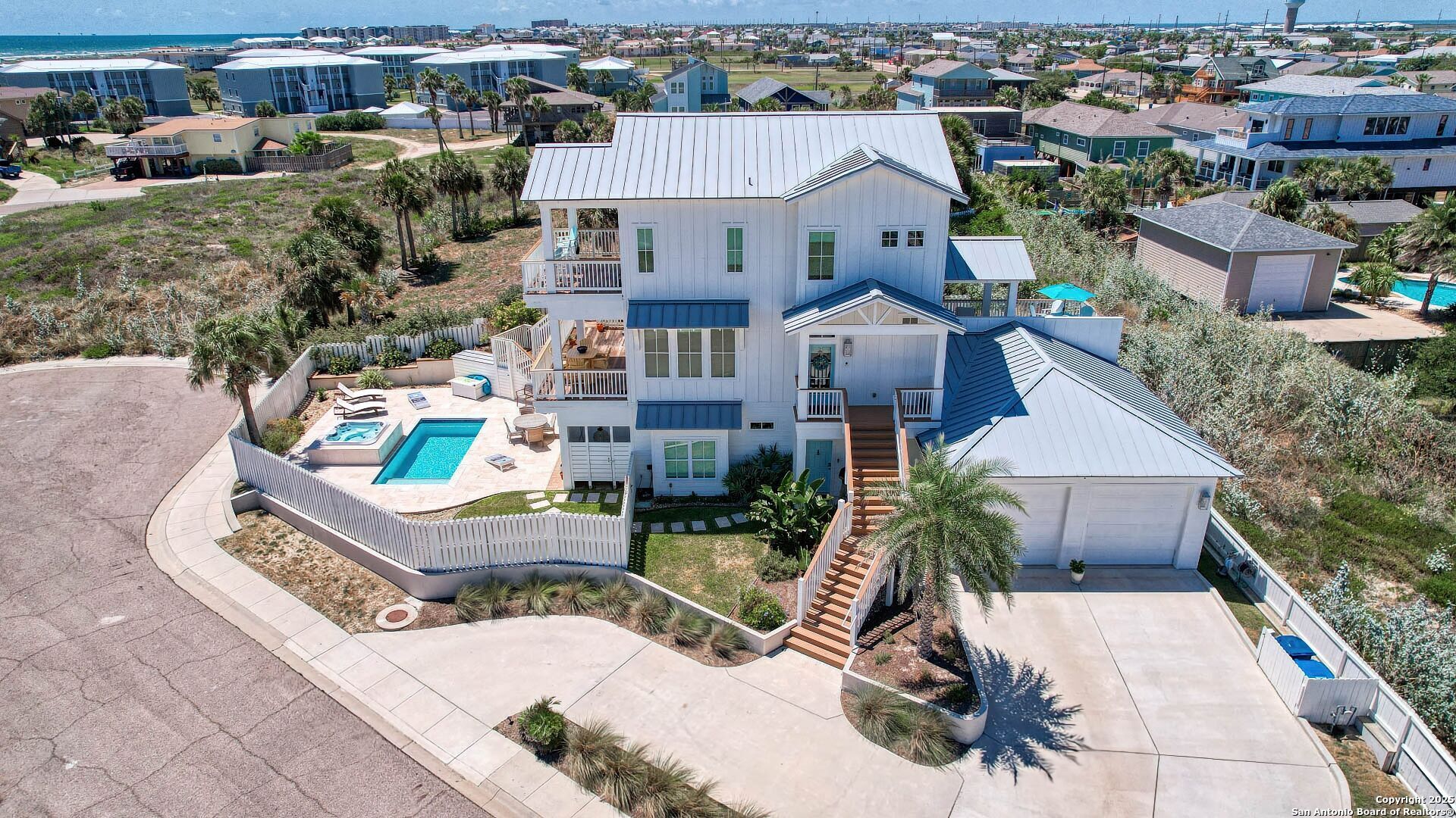 Coastal Luxury with Panoramic Views in Port Aransas Welcome to this stunning 2021 custom-built Coastal Retreat, offering 2,313 sq. ft. of thoughtfully designed space, 360 views of Port Aransas and the Gulf, and every modern comfort. This 3-bedroom, 4.5-bathroom home is perfect for both relaxation and entertaining. The main middle floor boasts an open-concept design with engineered hardwood floors, a cozy gas fireplace, and surround sound. The gourmet kitchen features a six-burner gas cooktop, electric oven, farmhouse sink, quartz countertops, island, auto drawer microwave, and premium KitchenAid appliances. A wine fridge, icemaker, and bar area complete the space for hosting. Covered decks on both sides offer spectacular sunrise and sunset views. The third floor is dedicated to the luxurious primary suite with vaulted ceilings, a private covered deck, and a spa-like bathroom with dual vanities, quartz counters, a soaking tub, oversized walk-in shower, and custom finishes, balcony ocean view. This level also includes an office with views, a yoga/workout area, and a full-size laundry room. The lower level features two spacious guest bedrooms with en suite bathrooms and a second laundry area. Step outside to your private resort-style oasis: a heated and chilled salt pool, spa, travertine surround, outdoor kitchen with gas grill, sink, TV, and mini fridge-perfect for year-round entertaining. Additional highlights: Interior elevator, hurricane-rated windows, spray foam insulation, custom blinds, solid interior doors, three Nest-controlled AC units, exterior security cameras, doorbell camera, AC tackle room off oversized garage with epoxy floors, fully wheelchair-accessible design, 2 irrigation systems, instant hot water gas heater. The home sits at an elevated 18' with underground utilities for peace of mind. Furnished and turnkey. This is more than a home-it's a lifestyle. Experience coastal luxury at its finest in Port Aransas. "Come Live Your Beach Life."