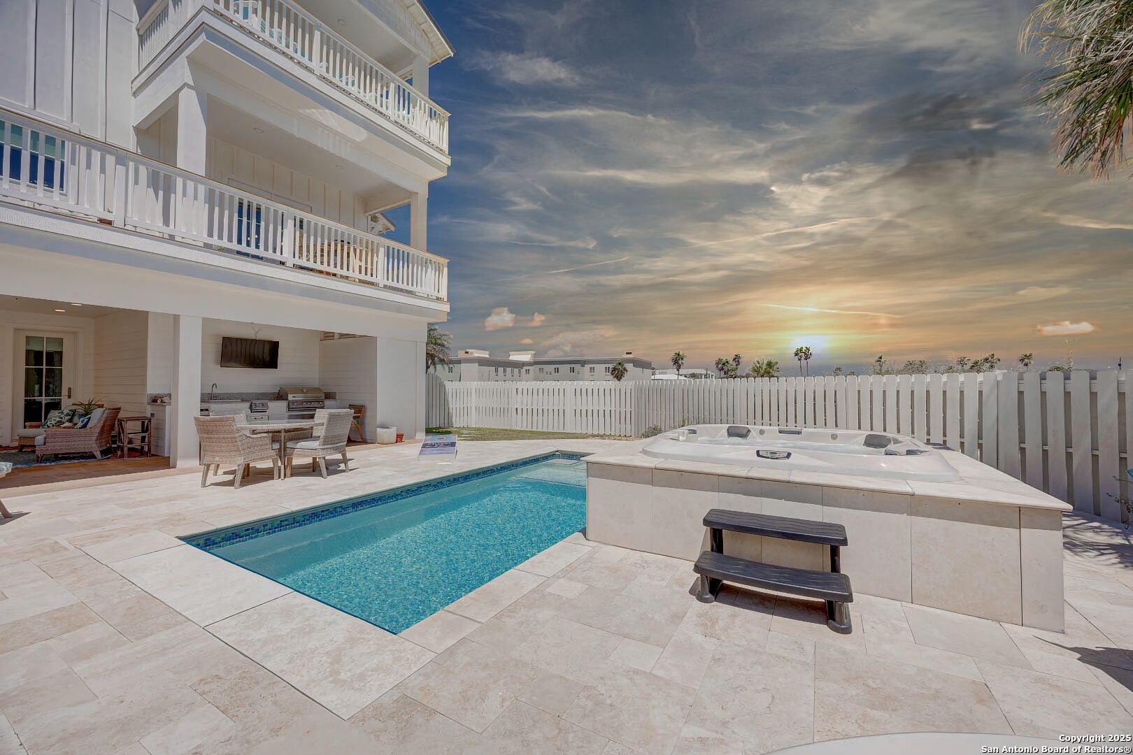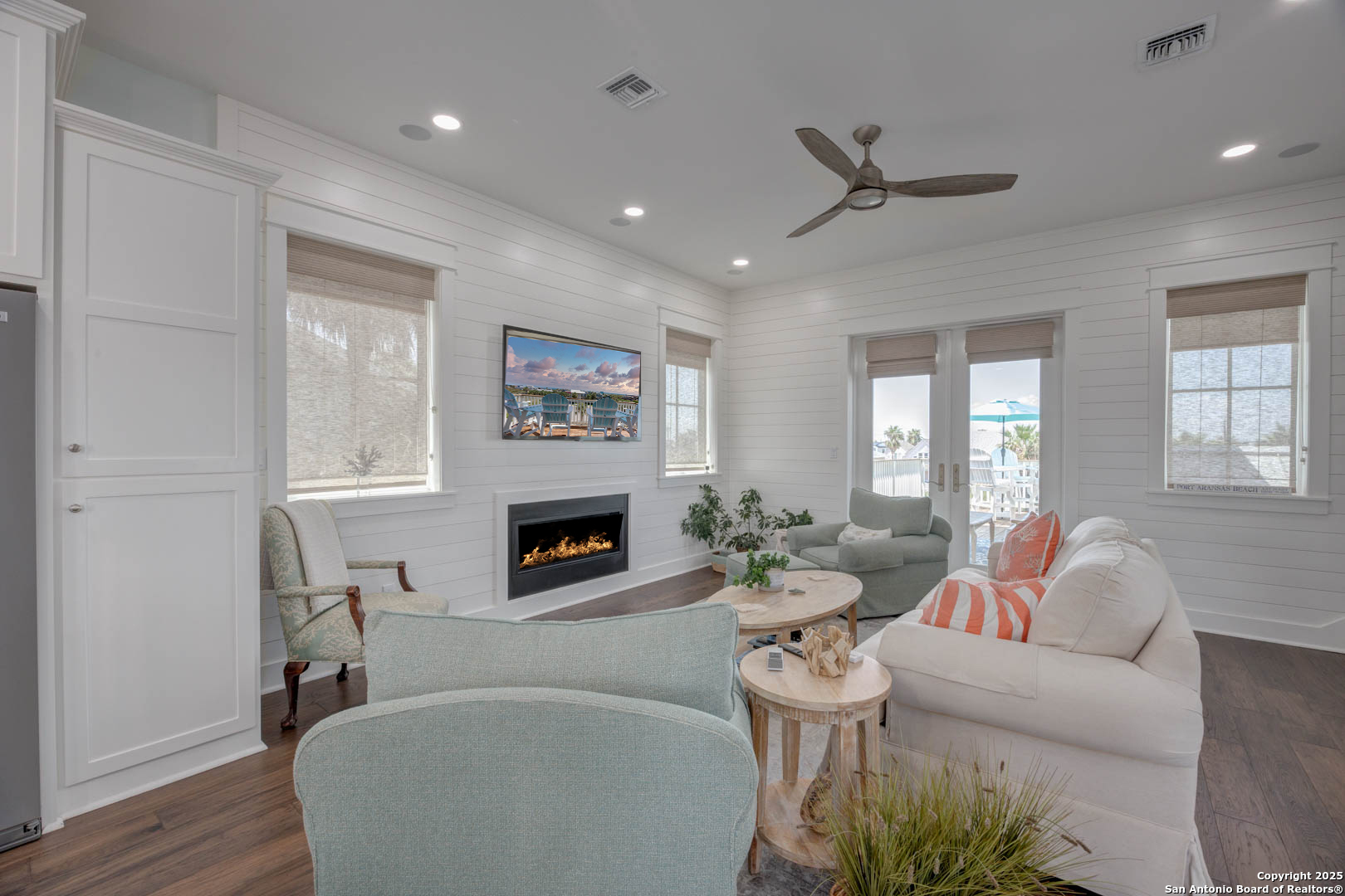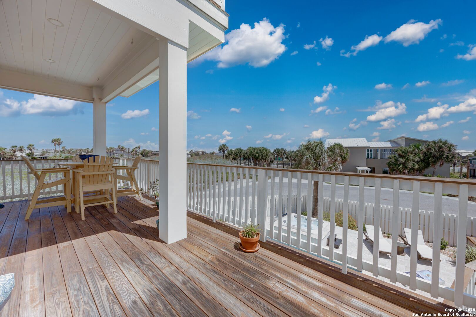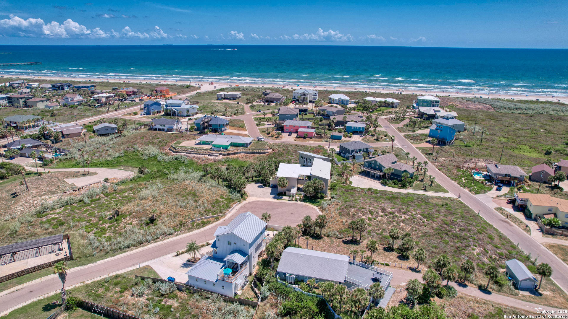 Coastal Luxury with Panoramic Views in Port Aransas Welcome to this stunning 2021 custom-built Coastal Retreat, offering 2,313 sq. ft. of thoughtfully designed space, 360 views of Port Aransas and the Gulf, and every modern comfort. This 3-bedroom, 4.5-bathroom home is perfect for both relaxation and entertaining. The main middle floor boasts an open-concept design with engineered hardwood floors, a cozy gas fireplace, and surround sound. The gourmet kitchen features a six-burner gas cooktop, electric oven, farmhouse sink, quartz countertops, island, auto drawer microwave, and premium KitchenAid appliances. A wine fridge, icemaker, and bar area complete the space for hosting. Covered decks on both sides offer spectacular sunrise and sunset views. The third floor is dedicated to the luxurious primary suite with vaulted ceilings, a private covered deck, and a spa-like bathroom with dual vanities, quartz counters, a soaking tub, oversized walk-in shower, and custom finishes, balcony ocean view. This level also includes an office with views, a yoga/workout area, and a full-size laundry room. The lower level features two spacious guest bedrooms with en suite bathrooms and a second laundry area. Step outside to your private resort-style oasis: a heated and chilled salt pool, spa, travertine surround, outdoor kitchen with gas grill, sink, TV, and mini fridge-perfect for year-round entertaining. Additional highlights: Interior elevator, hurricane-rated windows, spray foam insulation, custom blinds, solid interior doors, three Nest-controlled AC units, exterior security cameras, doorbell camera, AC tackle room off oversized garage with epoxy floors, fully wheelchair-accessible design, 2 irrigation systems, instant hot water gas heater. The home sits at an elevated 18' with underground utilities for peace of mind. Furnished and turnkey. This is more than a home-it's a lifestyle. Experience coastal luxury at its finest in Port Aransas. "Come Live Your Beach Life."