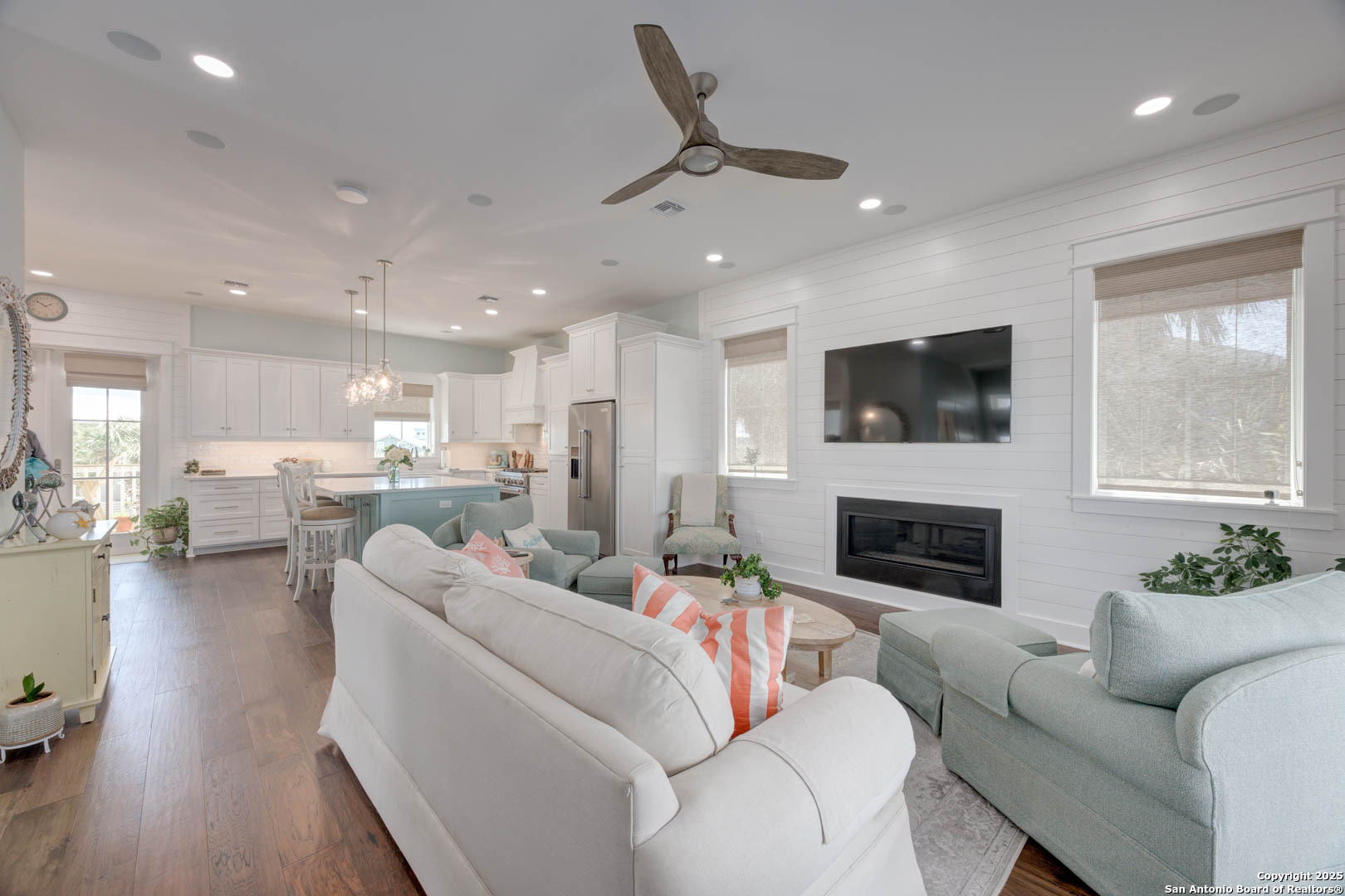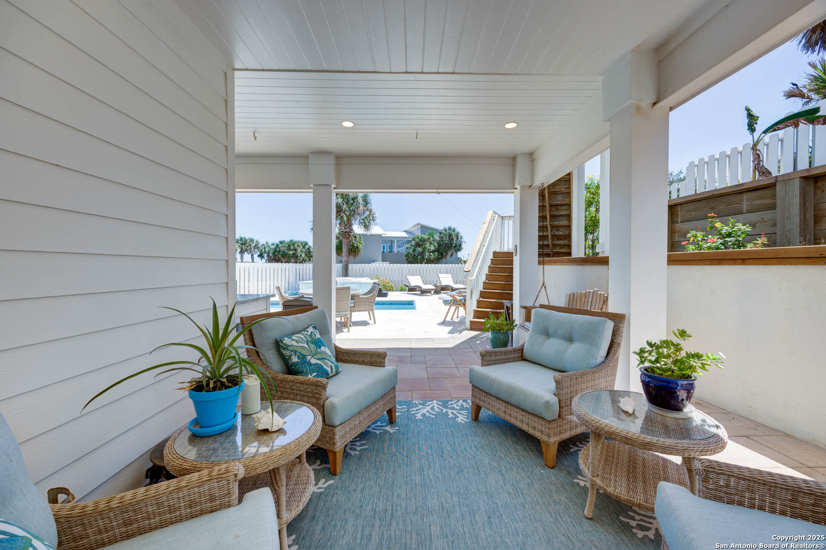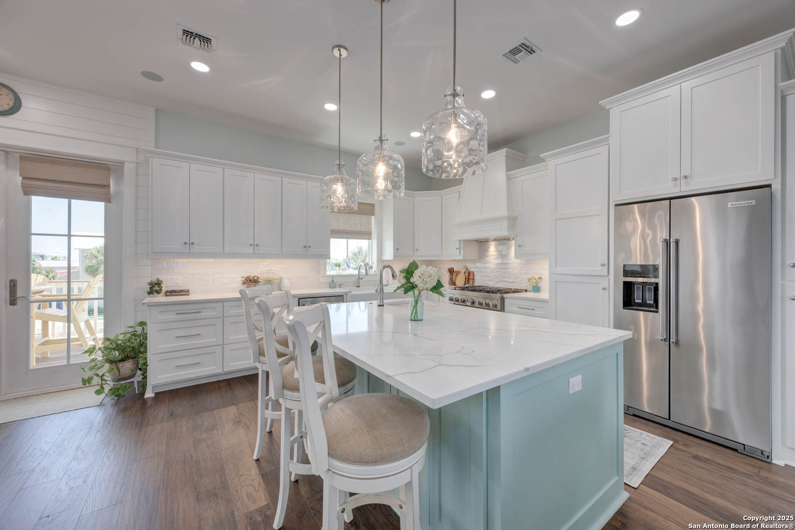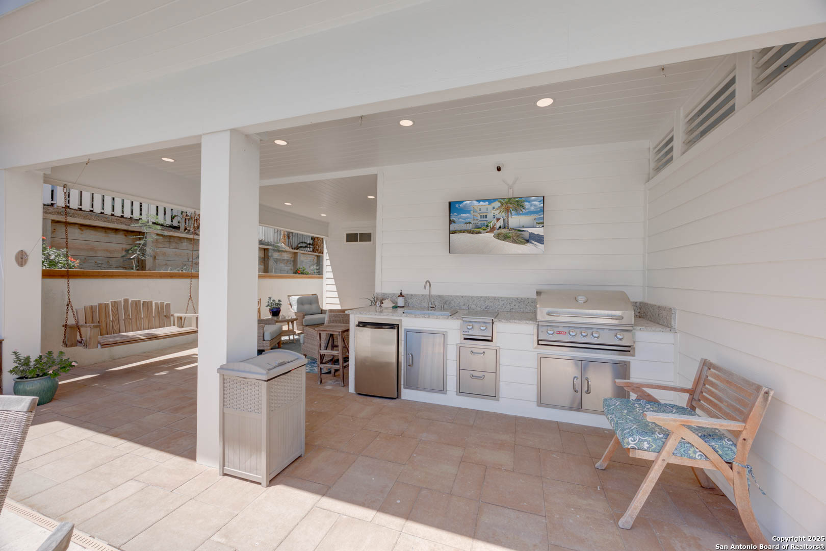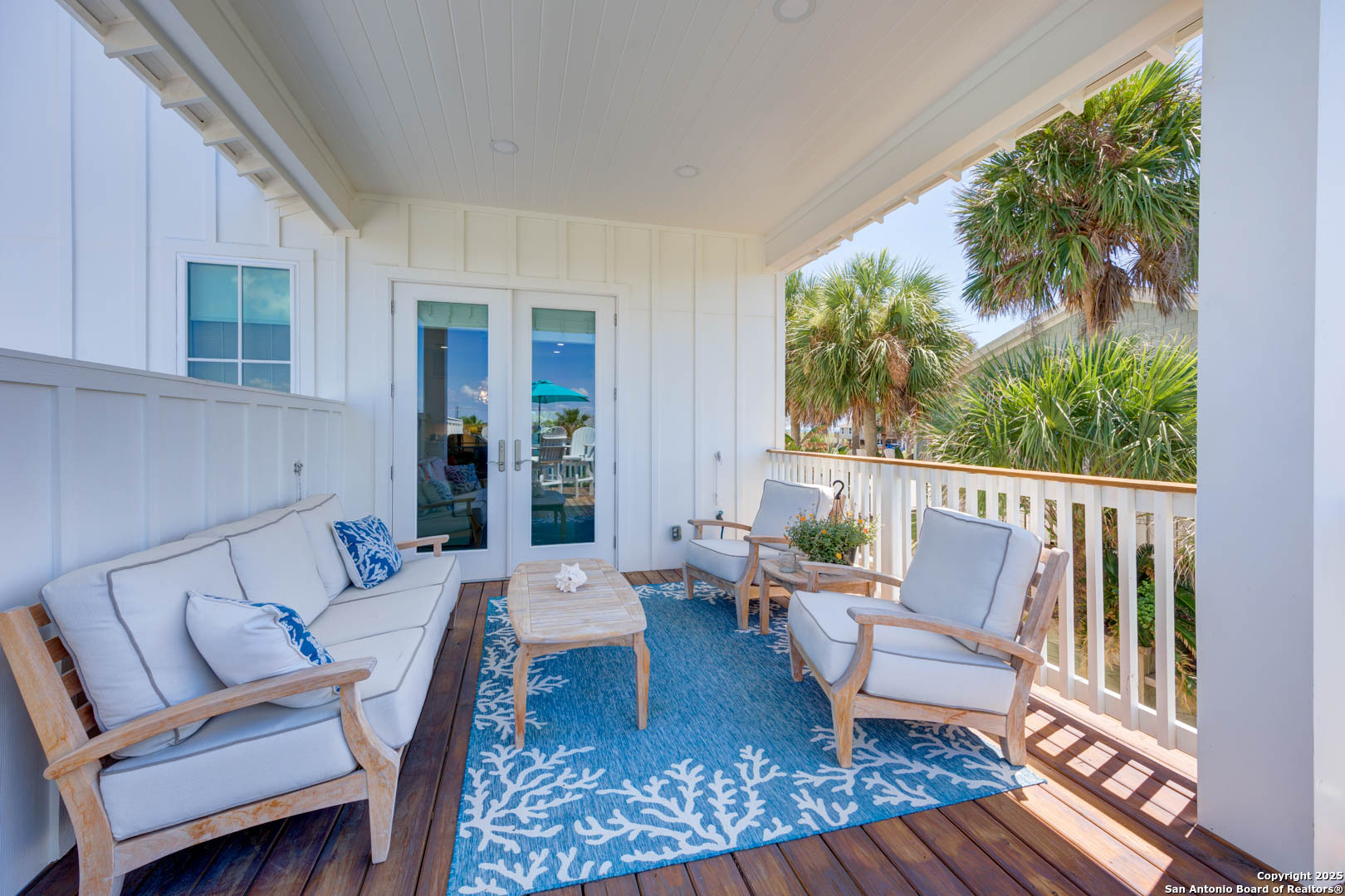 Coastal Luxury with Panoramic Views in Port Aransas Welcome to this stunning 2021 custom-built Coastal Retreat, offering 2,313 sq. ft. of thoughtfully designed space, 360 views of Port Aransas and the Gulf, and every modern comfort. This 3-bedroom, 4.5-bathroom home is perfect for both relaxation and entertaining. The main middle floor boasts an open-concept design with engineered hardwood floors, a cozy gas fireplace, and surround sound. The gourmet kitchen features a six-burner gas cooktop, electric oven, farmhouse sink, quartz countertops, island, auto drawer microwave, and premium KitchenAid appliances. A wine fridge, icemaker, and bar area complete the space for hosting. Covered decks on both sides offer spectacular sunrise and sunset views. The third floor is dedicated to the luxurious primary suite with vaulted ceilings, a private covered deck, and a spa-like bathroom with dual vanities, quartz counters, a soaking tub, oversized walk-in shower, and custom finishes, balcony ocean view. This level also includes an office with views, a yoga/workout area, and a full-size laundry room. The lower level features two spacious guest bedrooms with en suite bathrooms and a second laundry area. Step outside to your private resort-style oasis: a heated and chilled salt pool, spa, travertine surround, outdoor kitchen with gas grill, sink, TV, and mini fridge-perfect for year-round entertaining. Additional highlights: Interior elevator, hurricane-rated windows, spray foam insulation, custom blinds, solid interior doors, three Nest-controlled AC units, exterior security cameras, doorbell camera, AC tackle room off oversized garage with epoxy floors, fully wheelchair-accessible design, 2 irrigation systems, instant hot water gas heater. The home sits at an elevated 18' with underground utilities for peace of mind. Furnished and turnkey. This is more than a home-it's a lifestyle. Experience coastal luxury at its finest in Port Aransas. "Come Live Your Beach Life."