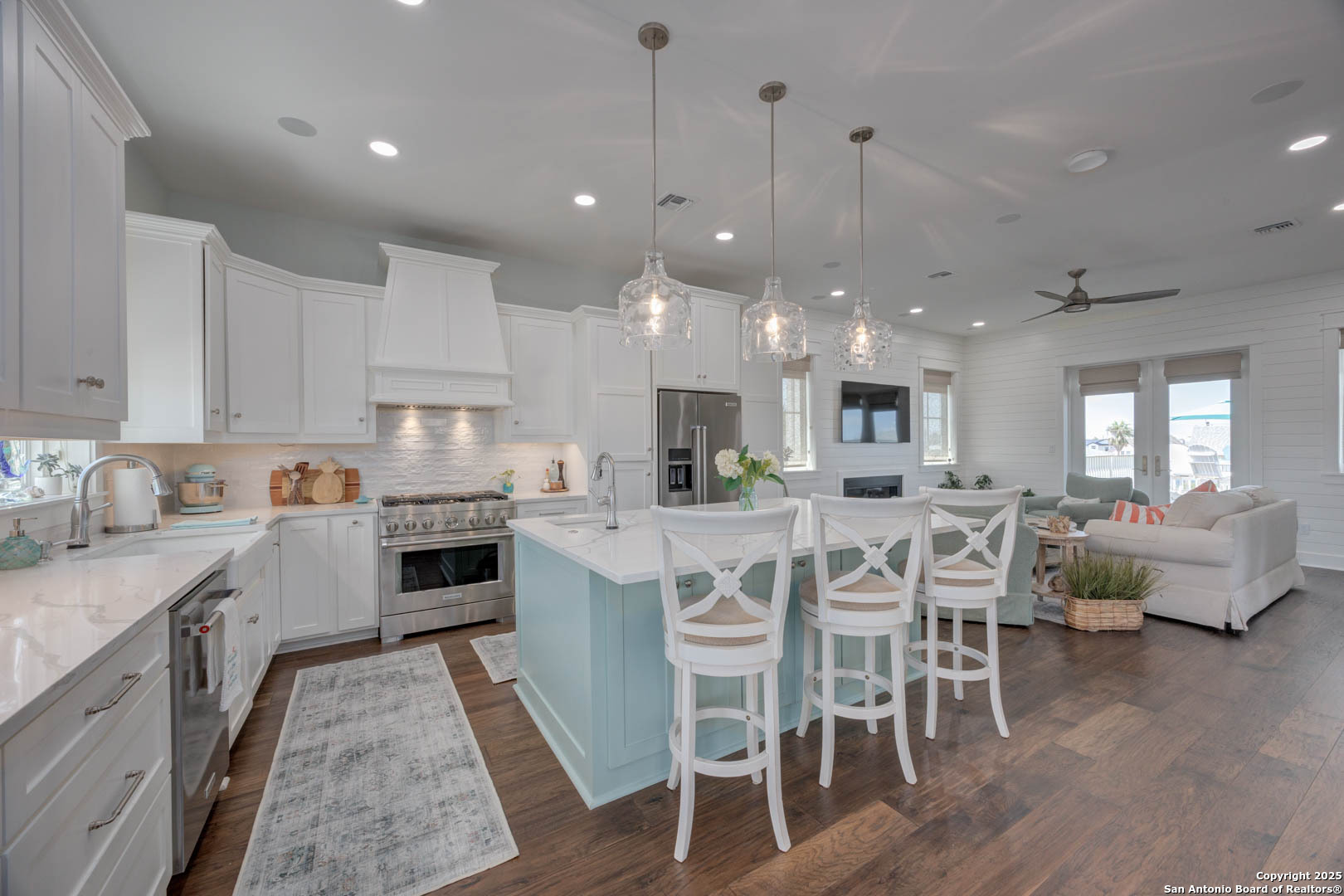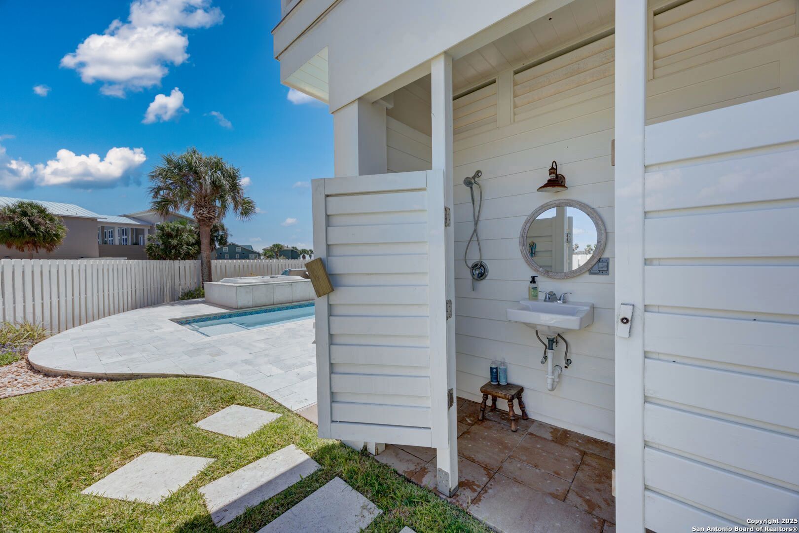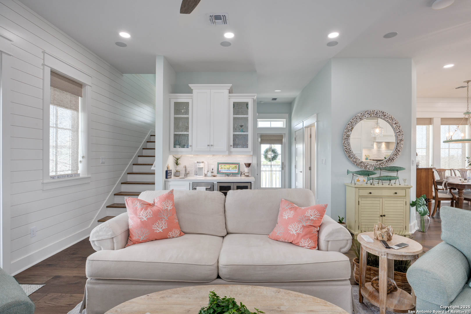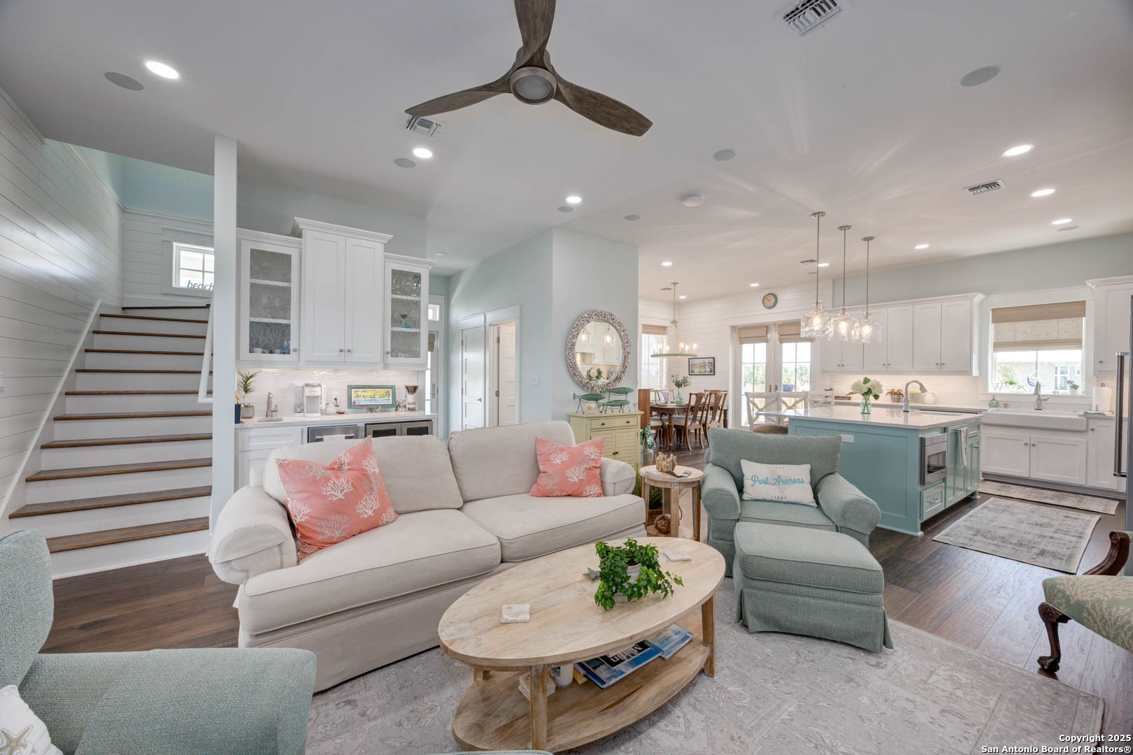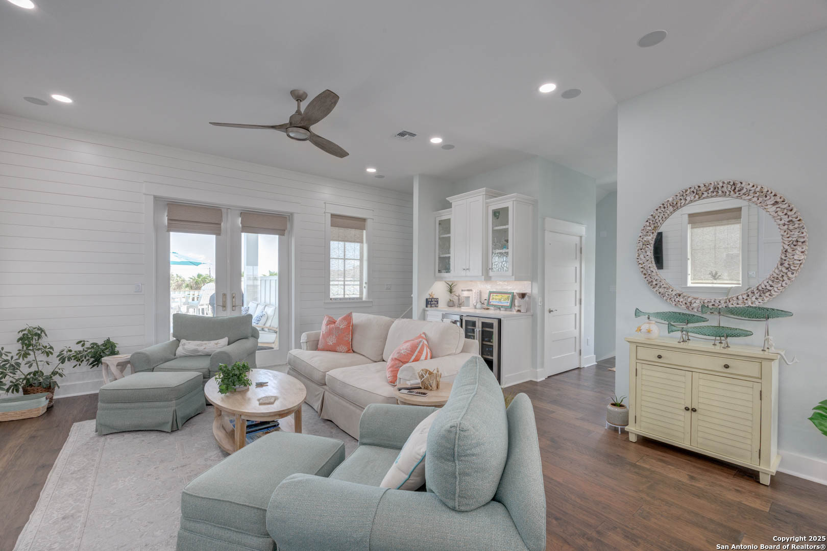 Coastal Luxury with Panoramic Views in Port Aransas Welcome to this stunning 2021 custom-built Coastal Retreat, offering 2,313 sq. ft. of thoughtfully designed space, 360 views of Port Aransas and the Gulf, and every modern comfort. This 3-bedroom, 4.5-bathroom home is perfect for both relaxation and entertaining. The main middle floor boasts an open-concept design with engineered hardwood floors, a cozy gas fireplace, and surround sound. The gourmet kitchen features a six-burner gas cooktop, electric oven, farmhouse sink, quartz countertops, island, auto drawer microwave, and premium KitchenAid appliances. A wine fridge, icemaker, and bar area complete the space for hosting. Covered decks on both sides offer spectacular sunrise and sunset views. The third floor is dedicated to the luxurious primary suite with vaulted ceilings, a private covered deck, and a spa-like bathroom with dual vanities, quartz counters, a soaking tub, oversized walk-in shower, and custom finishes, balcony ocean view. This level also includes an office with views, a yoga/workout area, and a full-size laundry room. The lower level features two spacious guest bedrooms with en suite bathrooms and a second laundry area. Step outside to your private resort-style oasis: a heated and chilled salt pool, spa, travertine surround, outdoor kitchen with gas grill, sink, TV, and mini fridge-perfect for year-round entertaining. Additional highlights: Interior elevator, hurricane-rated windows, spray foam insulation, custom blinds, solid interior doors, three Nest-controlled AC units, exterior security cameras, doorbell camera, AC tackle room off oversized garage with epoxy floors, fully wheelchair-accessible design, 2 irrigation systems, instant hot water gas heater. The home sits at an elevated 18' with underground utilities for peace of mind. Furnished and turnkey. This is more than a home-it's a lifestyle. Experience coastal luxury at its finest in Port Aransas. "Come Live Your Beach Life."