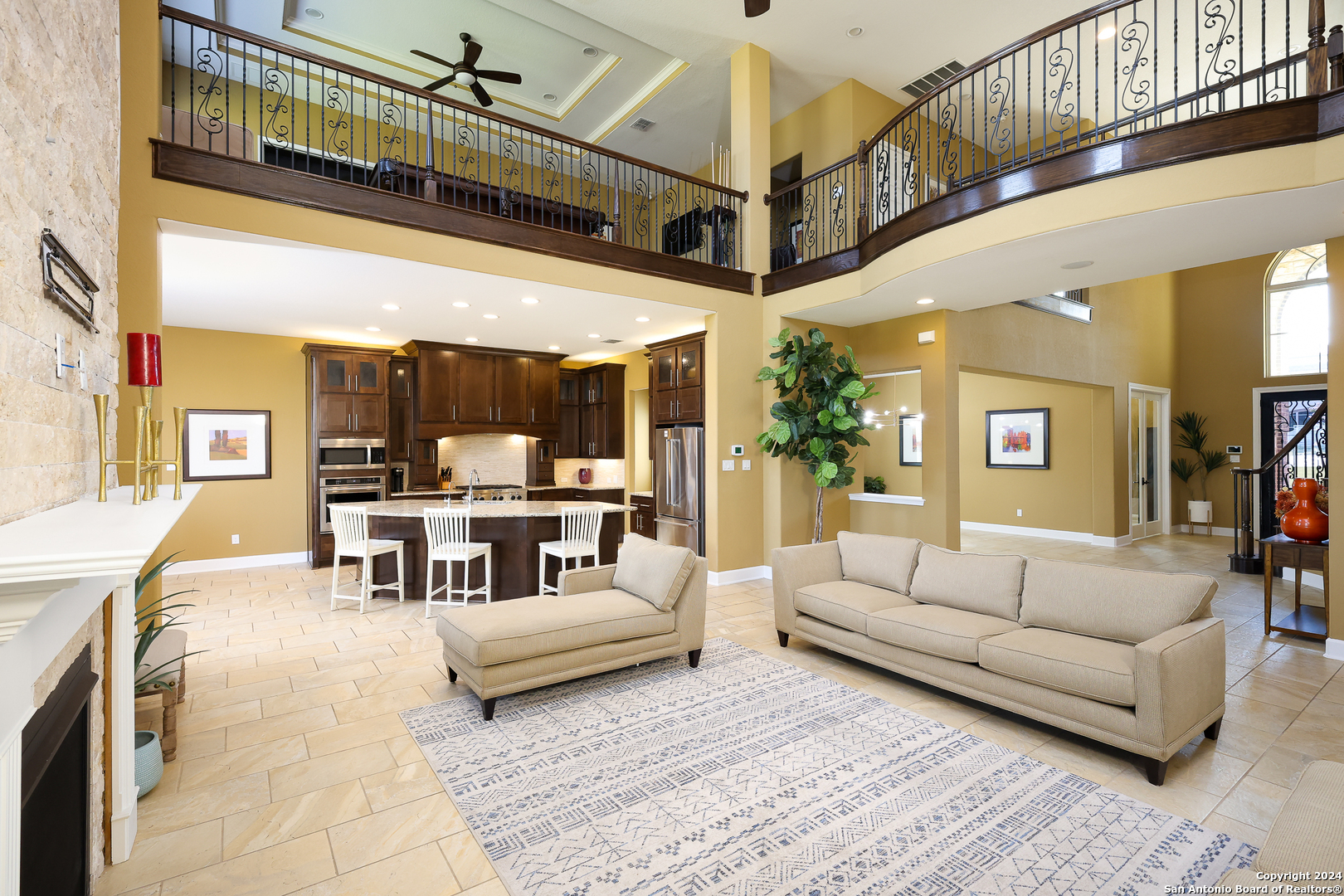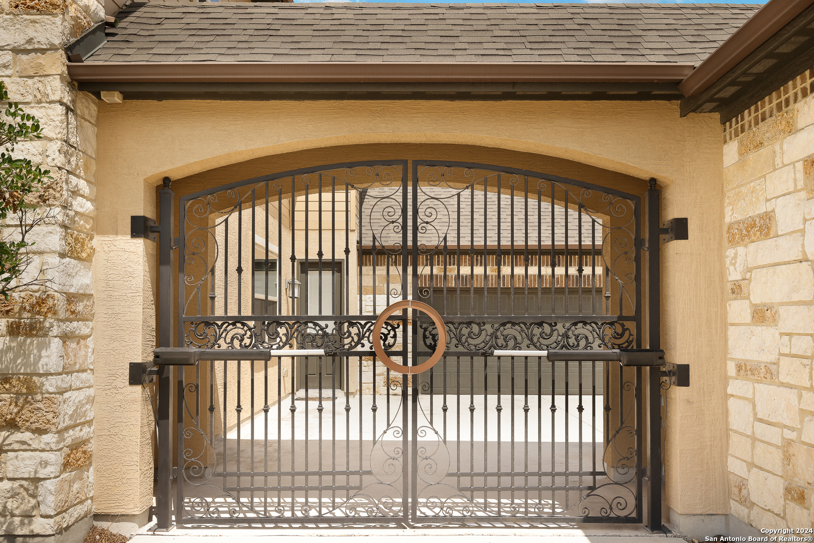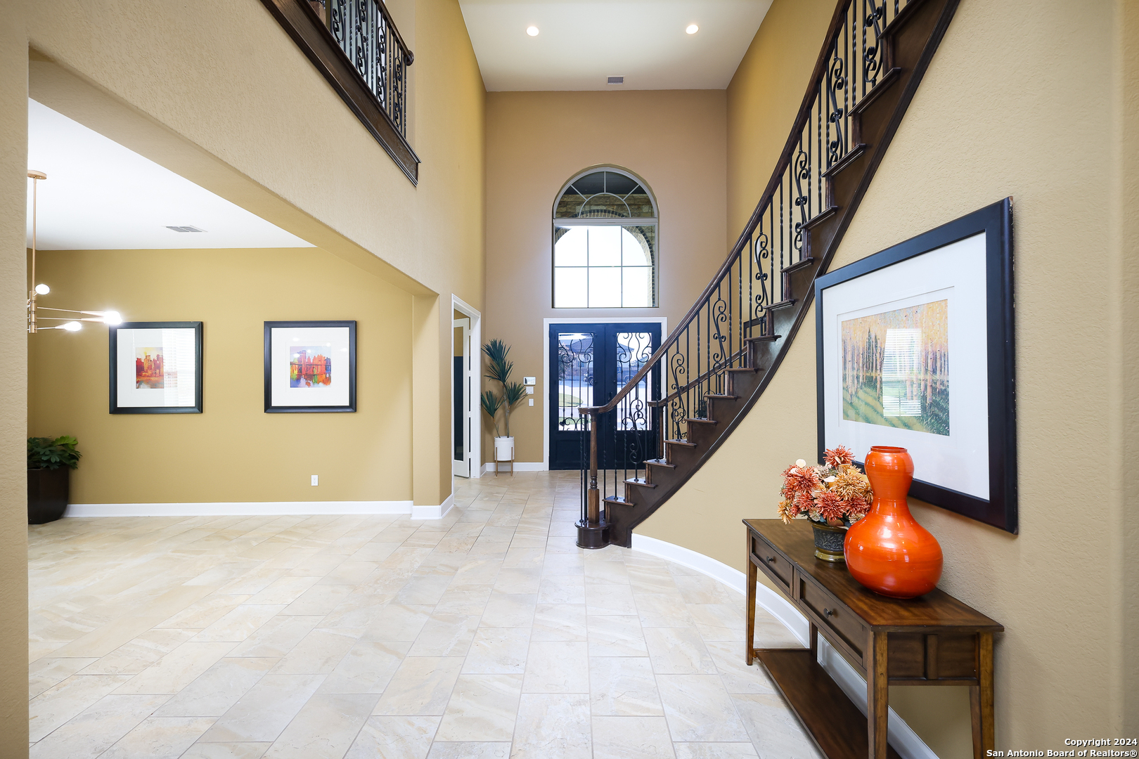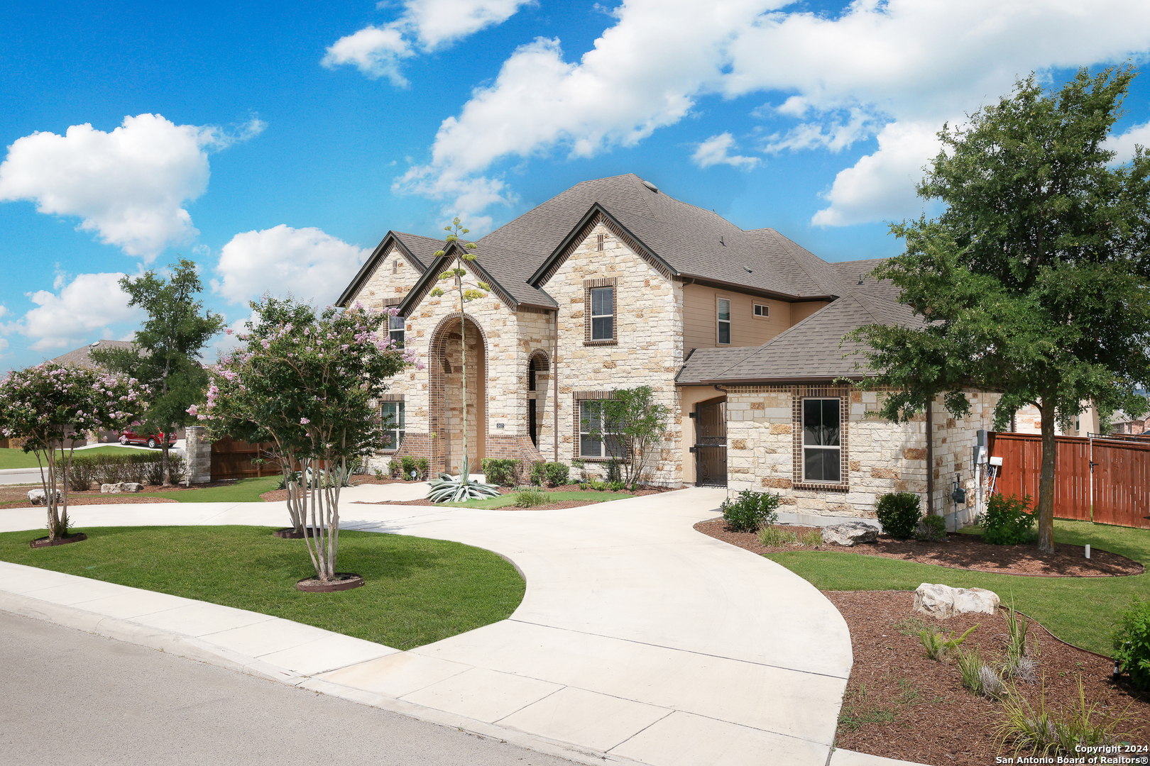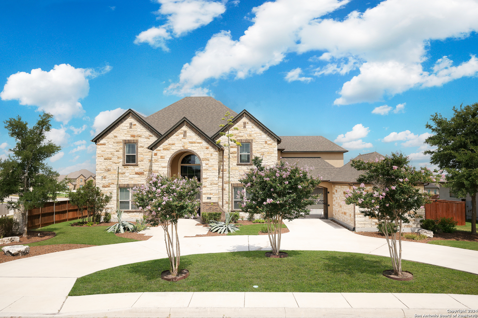 Stunning French Country Home in Pristine Community! Welcome to your dream home, a former model residence that epitomizes elegance and luxury. Nestled within a charming small community with exclusive entry and exit points, this gorgeous French Country-style estate offers unparalleled amenities and a prime location. This expansive home features 5 bedrooms, 4 full bathrooms, and 2 half bathrooms, designed to accommodate your lifestyle with grace and comfort. The study provides a quiet sanctuary for work or relaxation. As you step through the double entry doors, you are greeted by an open foyer boasting 21-foot ceilings and a magnificent curved iron staircase, setting the tone for the grandeur that awaits within. The heart of this home is its gourmet kitchen. Upgraded with high-end stainless steel KitchenAid appliances, including a 6-burner gas cooktop, it's designed for both everyday meals and culinary masterpieces. Custom cabinets provide ample storage, while granite countertops offer both beauty and functionality. The master bedroom is a haven of tranquility, featuring double tray ceilings with crown molding. The master bath offers separate vanities, a dedicated makeup area, an all-tile shower, and a luxurious 6-foot drop-in tub. This suite is designed to be your personal retreat. Enjoy countless hours of fun and entertainment in the dedicated game and media rooms. Whether it's game night or movie night, this home provides the perfect venue for making memories. Step outside to your large covered patio, complete with recessed lighting and pre-plumbed for gas, making it ideal for outdoor cooking and entertaining. The huge yard, over half an acre in size, features a sprinkler system and offers endless possibilities for gardening, play, or simply enjoying the outdoors. Situated close to Randolph AFB, BAMC, and Downtown, this home offers convenience for both work and play. The small, gated community ensures a peaceful environment with added security and privacy. Hardwood and Tile Floors: Elegant and durable flooring throughout the home. 3-Car Garage: Ample space for vehicles and storage completed with a minisplit, epoxied floors and its own 1/2 bath. Porte-cochere: Adds a touch of sophistication and provides additional covered parking guarded by an electric iron gate. Don't miss the opportunity to own this exquisite property that combines luxury living with practical convenience. Schedule your exclusive viewing today and step into a world where every detail reflects quality and craftsmanship.
