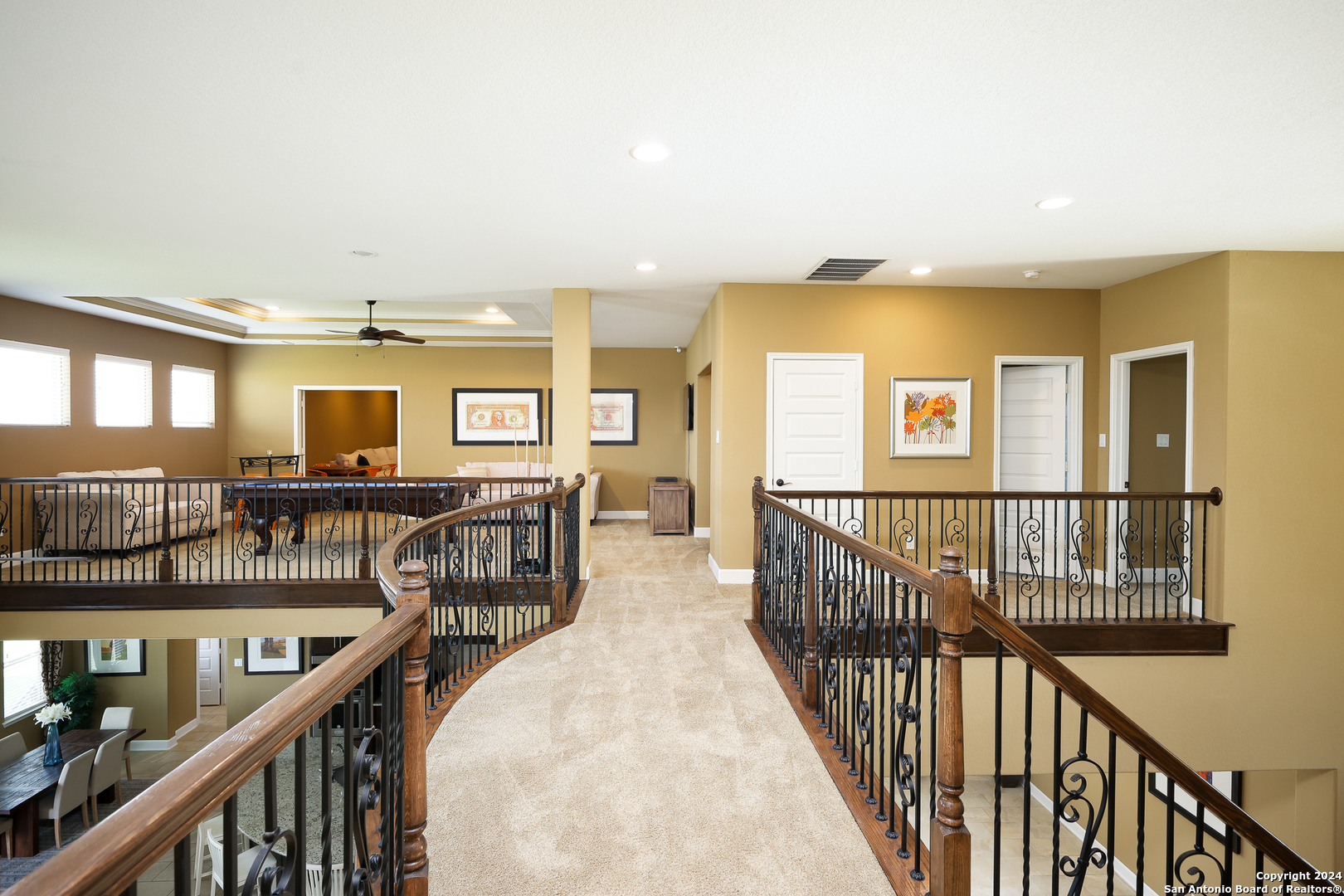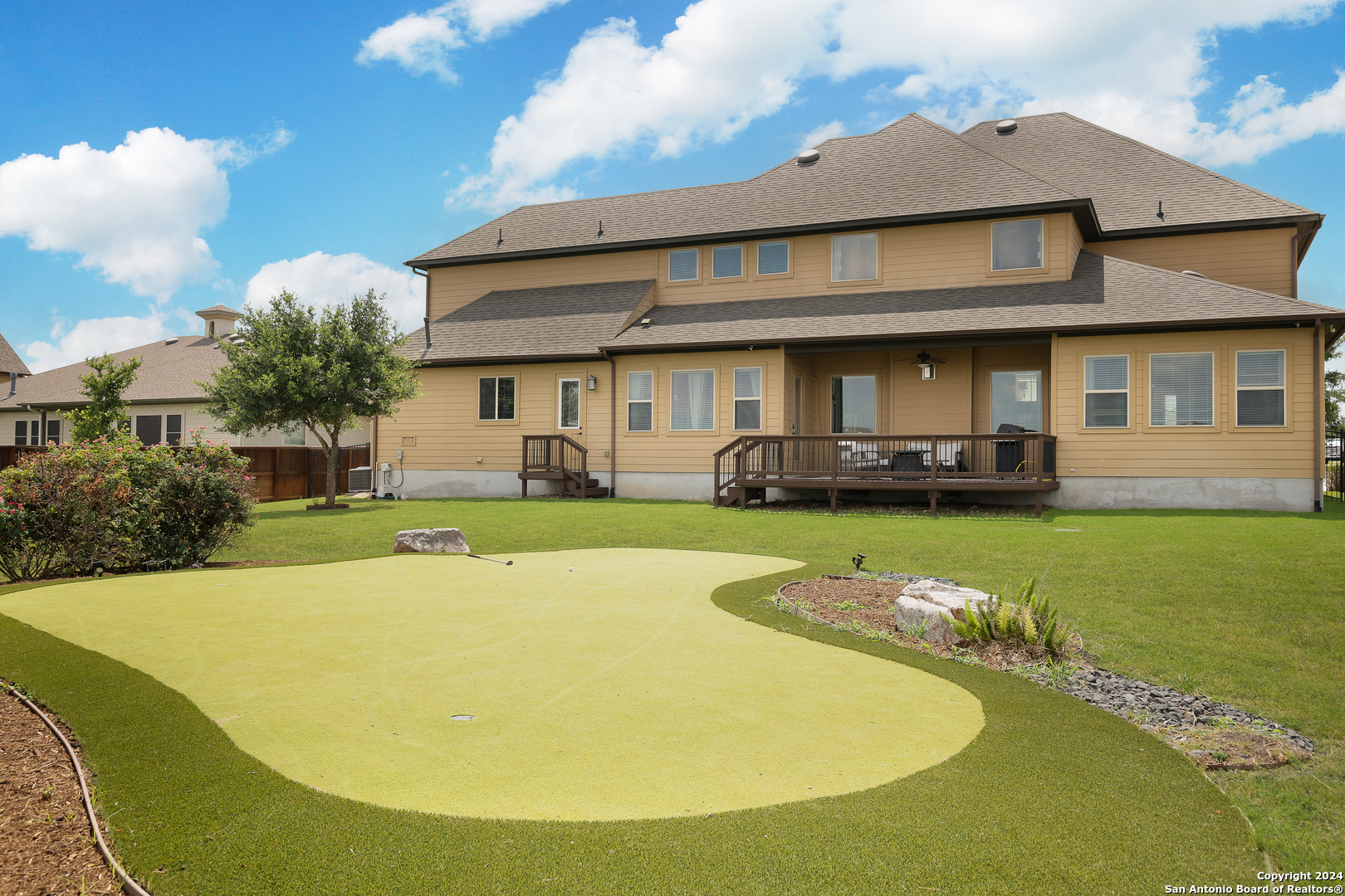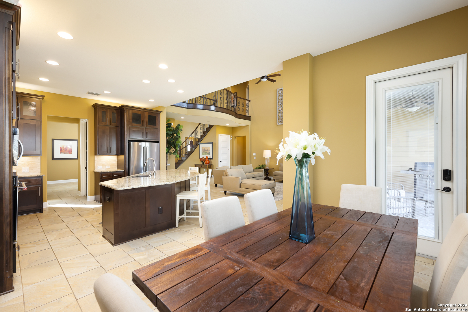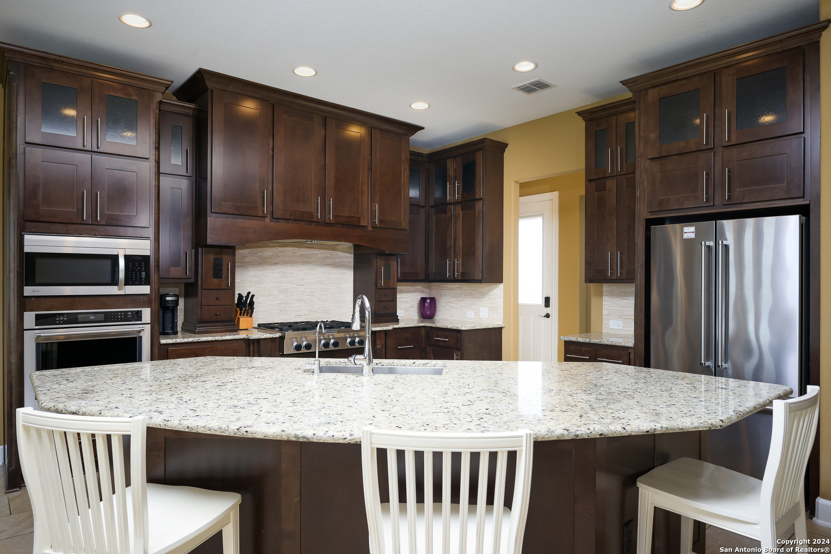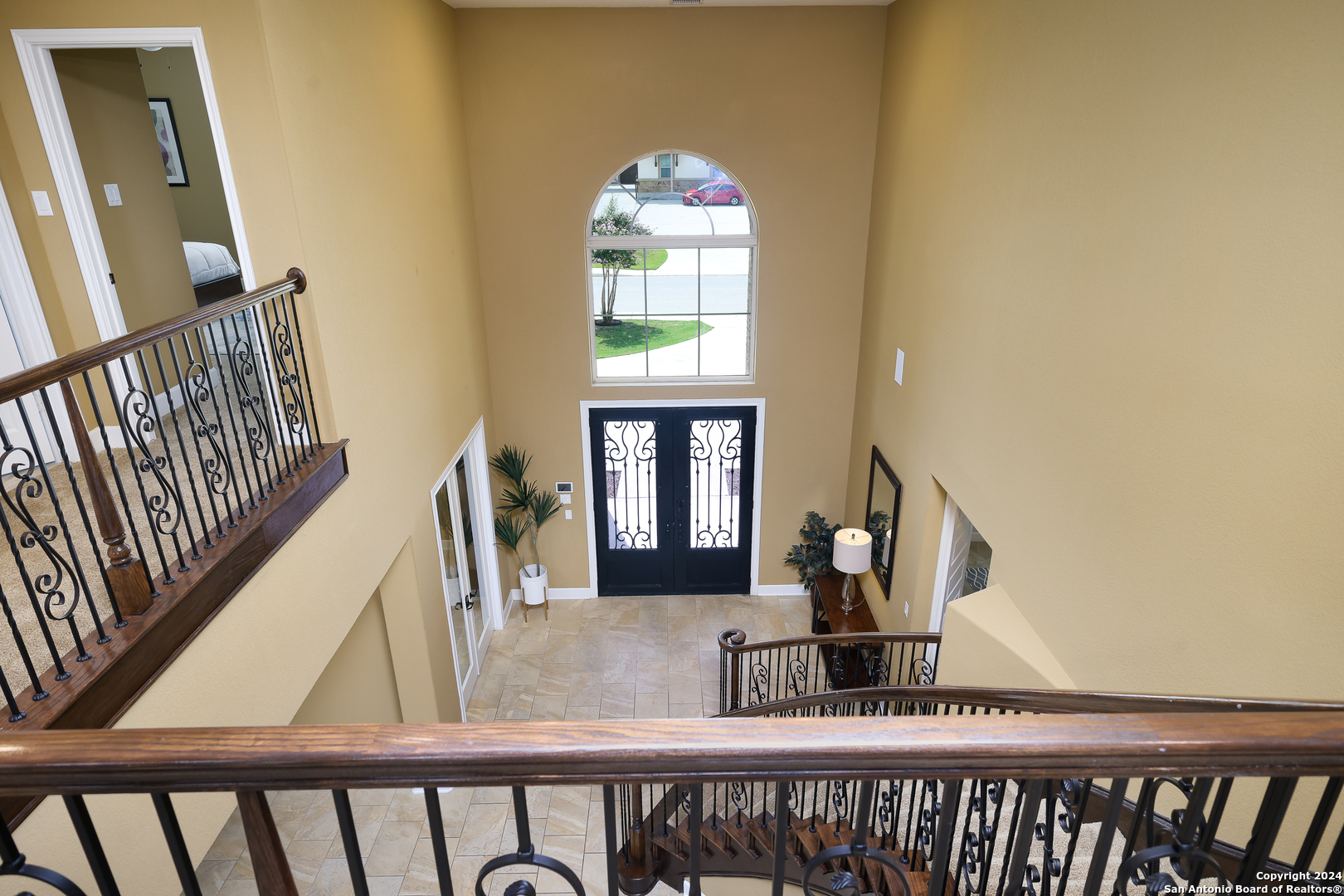 Stunning French Country Home in Pristine Community! Welcome to your dream home, a former model residence that epitomizes elegance and luxury. Nestled within a charming small community with exclusive entry and exit points, this gorgeous French Country-style estate offers unparalleled amenities and a prime location. This expansive home features 5 bedrooms, 4 full bathrooms, and 2 half bathrooms, designed to accommodate your lifestyle with grace and comfort. The study provides a quiet sanctuary for work or relaxation. As you step through the double entry doors, you are greeted by an open foyer boasting 21-foot ceilings and a magnificent curved iron staircase, setting the tone for the grandeur that awaits within. The heart of this home is its gourmet kitchen. Upgraded with high-end stainless steel KitchenAid appliances, including a 6-burner gas cooktop, it's designed for both everyday meals and culinary masterpieces. Custom cabinets provide ample storage, while granite countertops offer both beauty and functionality. The master bedroom is a haven of tranquility, featuring double tray ceilings with crown molding. The master bath offers separate vanities, a dedicated makeup area, an all-tile shower, and a luxurious 6-foot drop-in tub. This suite is designed to be your personal retreat. Enjoy countless hours of fun and entertainment in the dedicated game and media rooms. Whether it's game night or movie night, this home provides the perfect venue for making memories. Step outside to your large covered patio, complete with recessed lighting and pre-plumbed for gas, making it ideal for outdoor cooking and entertaining. The huge yard, over half an acre in size, features a sprinkler system and offers endless possibilities for gardening, play, or simply enjoying the outdoors. Situated close to Randolph AFB, BAMC, and Downtown, this home offers convenience for both work and play. The small, gated community ensures a peaceful environment with added security and privacy. Hardwood and Tile Floors: Elegant and durable flooring throughout the home. 3-Car Garage: Ample space for vehicles and storage completed with a minisplit, epoxied floors and its own 1/2 bath. Porte-cochere: Adds a touch of sophistication and provides additional covered parking guarded by an electric iron gate. Don't miss the opportunity to own this exquisite property that combines luxury living with practical convenience. Schedule your exclusive viewing today and step into a world where every detail reflects quality and craftsmanship.