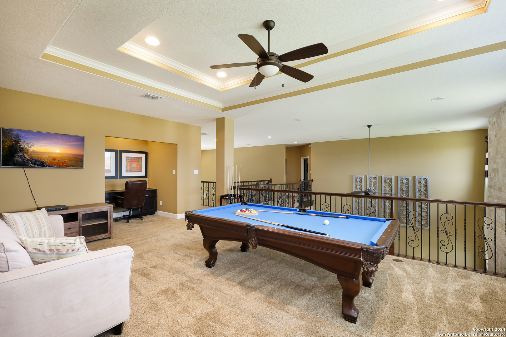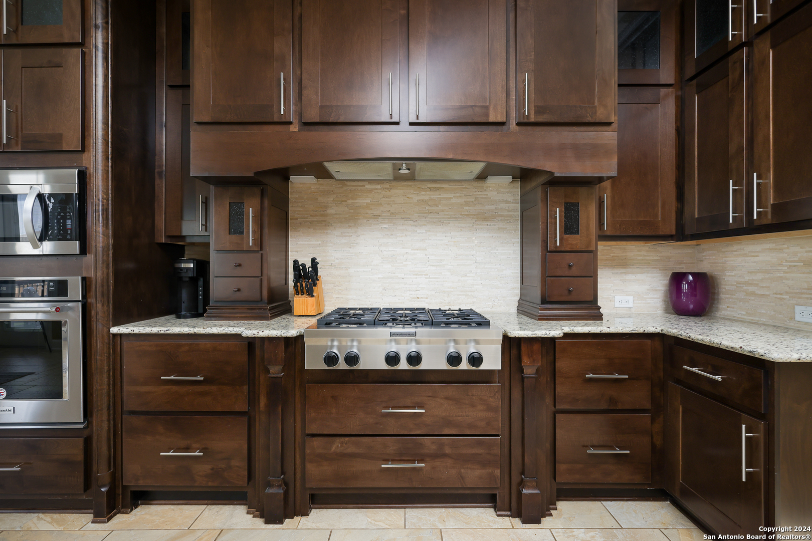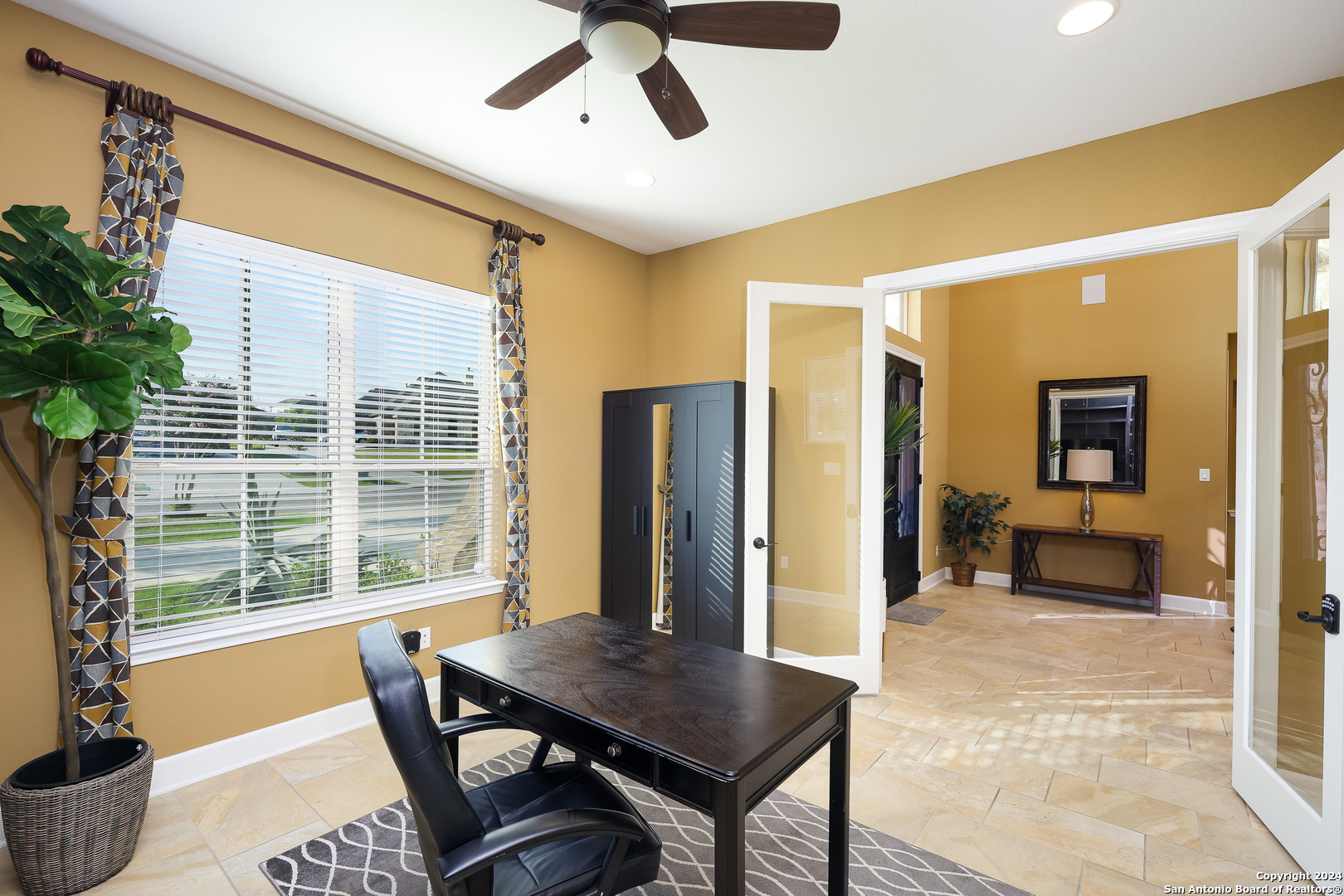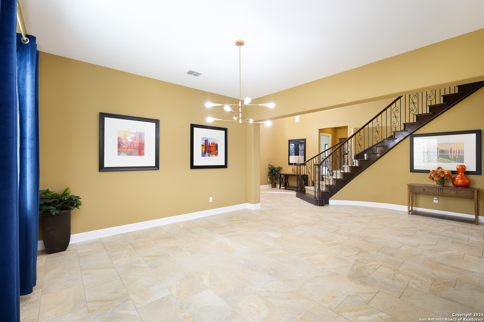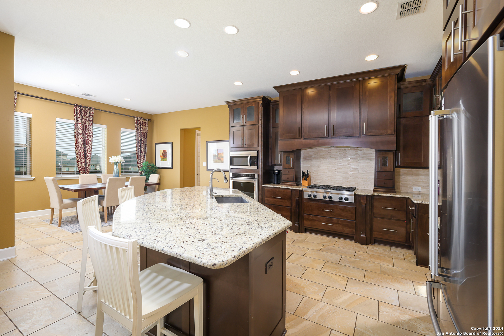 Stunning French Country Home in Pristine Community! Welcome to your dream home, a former model residence that epitomizes elegance and luxury. Nestled within a charming small community with exclusive entry and exit points, this gorgeous French Country-style estate offers unparalleled amenities and a prime location. This expansive home features 5 bedrooms, 4 full bathrooms, and 2 half bathrooms, designed to accommodate your lifestyle with grace and comfort. The study provides a quiet sanctuary for work or relaxation. As you step through the double entry doors, you are greeted by an open foyer boasting 21-foot ceilings and a magnificent curved iron staircase, setting the tone for the grandeur that awaits within. The heart of this home is its gourmet kitchen. Upgraded with high-end stainless steel KitchenAid appliances, including a 6-burner gas cooktop, it's designed for both everyday meals and culinary masterpieces. Custom cabinets provide ample storage, while granite countertops offer both beauty and functionality. The master bedroom is a haven of tranquility, featuring double tray ceilings with crown molding. The master bath offers separate vanities, a dedicated makeup area, an all-tile shower, and a luxurious 6-foot drop-in tub. This suite is designed to be your personal retreat. Enjoy countless hours of fun and entertainment in the dedicated game and media rooms. Whether it's game night or movie night, this home provides the perfect venue for making memories. Step outside to your large covered patio, complete with recessed lighting and pre-plumbed for gas, making it ideal for outdoor cooking and entertaining. The huge yard, over half an acre in size, features a sprinkler system and offers endless possibilities for gardening, play, or simply enjoying the outdoors. Situated close to Randolph AFB, BAMC, and Downtown, this home offers convenience for both work and play. The small, gated community ensures a peaceful environment with added security and privacy. Hardwood and Tile Floors: Elegant and durable flooring throughout the home. 3-Car Garage: Ample space for vehicles and storage completed with a minisplit, epoxied floors and its own 1/2 bath. Porte-cochere: Adds a touch of sophistication and provides additional covered parking guarded by an electric iron gate. Don't miss the opportunity to own this exquisite property that combines luxury living with practical convenience. Schedule your exclusive viewing today and step into a world where every detail reflects quality and craftsmanship.