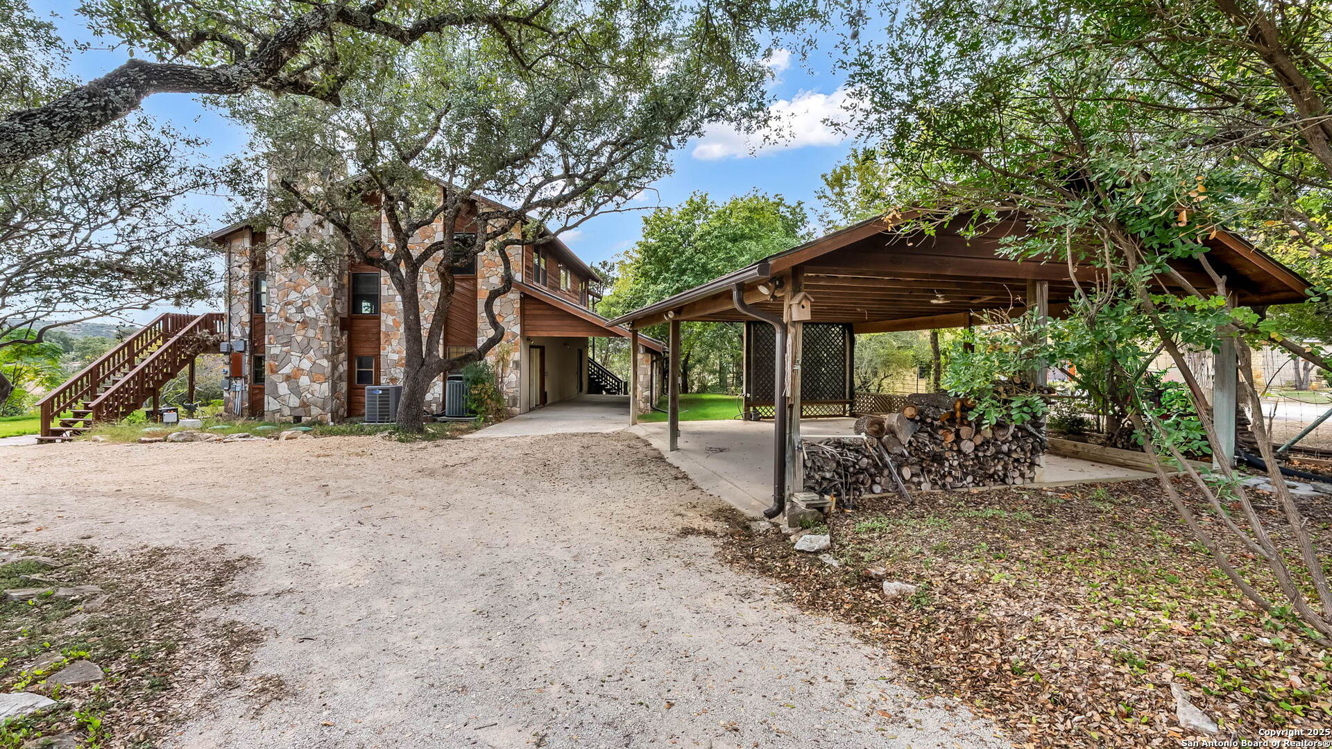 This charming multi-generational waterfront home on Canyon Lake is the ultimate Hill Country Escape where rustic charm meets modern comfort. With approx 210 ft of Canyon Lake shoreline, this property was designed for relaxed lakeside living and unforgettable views. The main home is approx 2100 sf and features a spacious open floor plan, 2 Bedrooms, 2 Bath plus a loft. The family room has a cozy rock fireplace, tongue and groove ceiling creating a warm and inviting atmosphere and gorgeous views of the lake and hill side. The primary suite takes up the entire 3rd level offering privacy with full bath, walk in closet, fireplace and outside access and more fabulous views. The guest quarters on the first floor has its own entrance not connected to Main House, full kitchen, living/bedroom combo, full bath and is approx 700 additional square footage, and makes it easy for hosting or provides the perfect setup for multi-generational living. Step outside to enjoy the wrap around deck, circular drive and 3 carports for plenty of covered parking, including one with RV hookups, and a 500 sf Shop. Private well with water softener, one HVAC replaced in 2024 and aerobic system replaced in 2025, Roof replaced in 2023. Whether you are looking for a full time residence or the perfect lake getaway, this Canyon Lake gem is ready for a new owner. See Feature Sheet for a list of upgrades and amenities. No Short Term Rentals allowed.