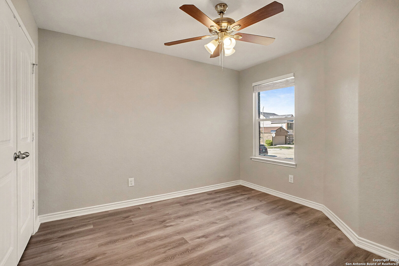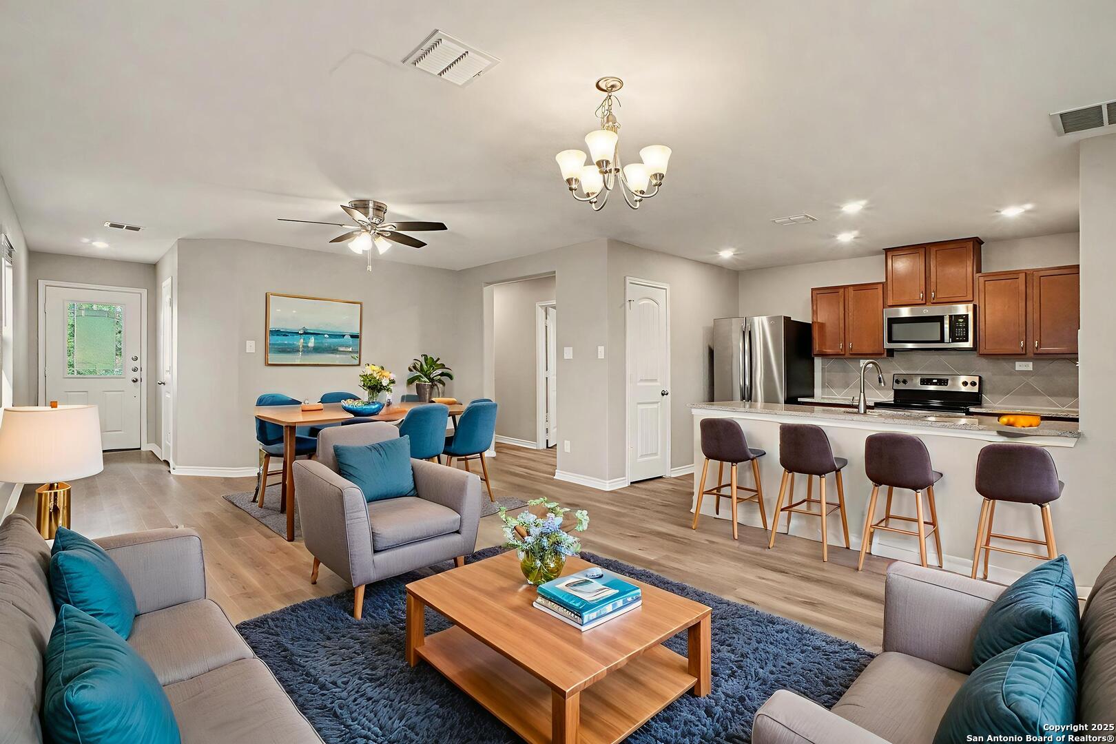 Adorable and well-maintained Miller Ranch home with 3 bedrooms, 2 baths, and a 2-car garage, plus a den which offers flexible use as an office or additional living space. Split floorplan with large primary bedroom, walk-in closet and ensuite bath with dual sinks. The kitchen features include granite countertops, stainless steel appliances and breakfast bar. Other upgrades include luxury vinyl flooring throughout, window coverings and ceiling fans in each room. Enjoy the private backyard with distant downtown San Antonio views. Easy highway access and quick commute to Randolph AFB and downtown. Hurry as this one won't be available long. Schedule your showing today!