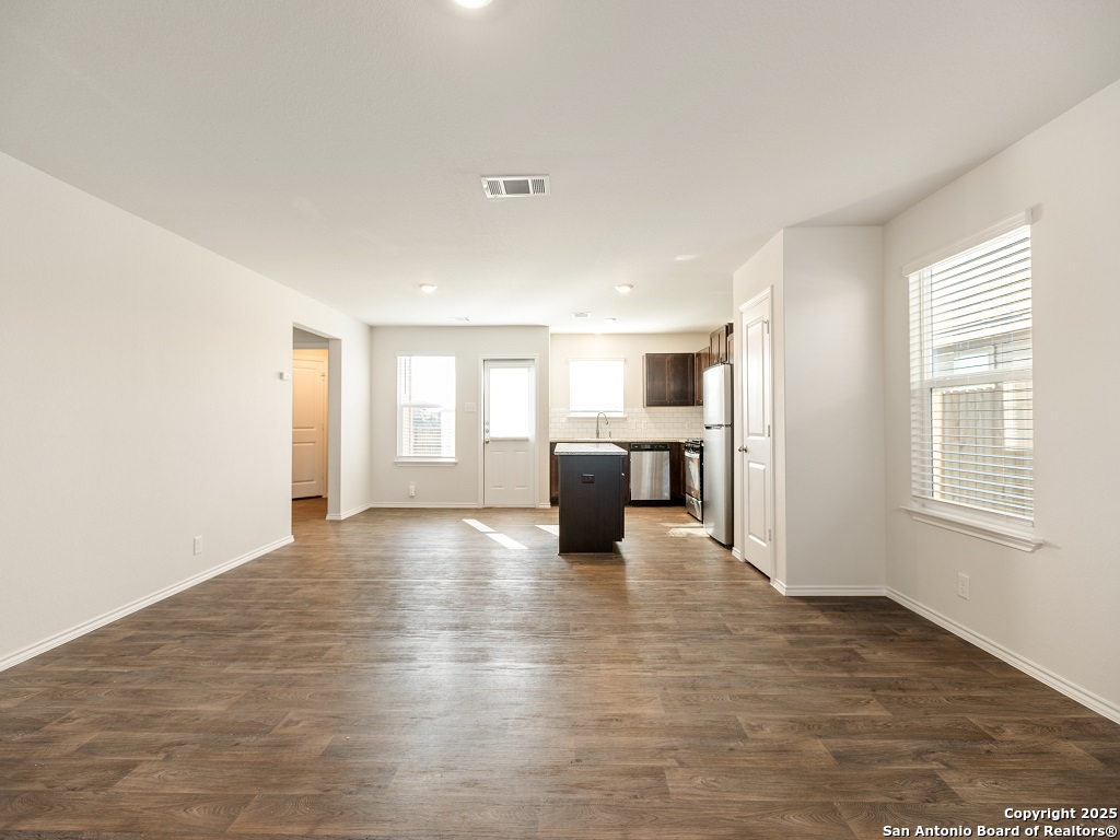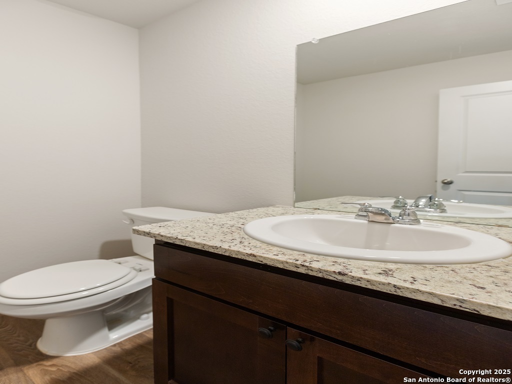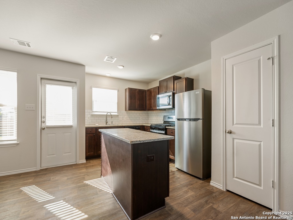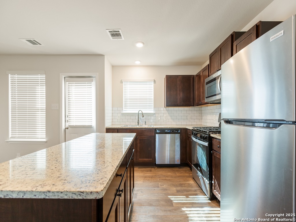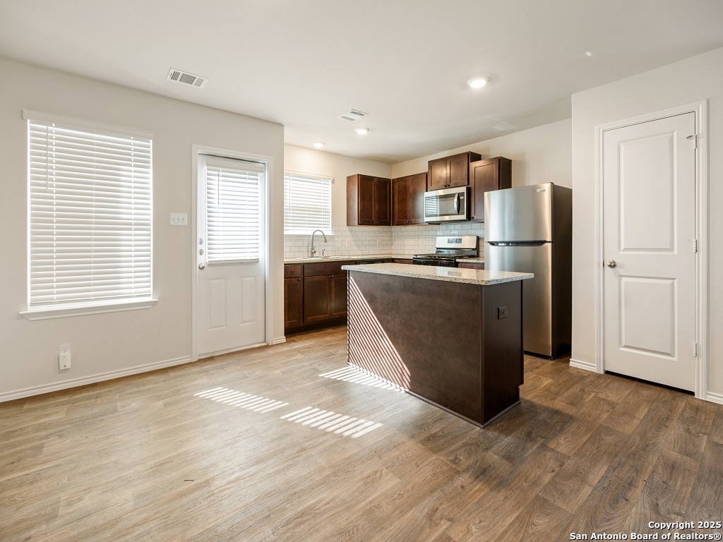 Welcome to your next home in the desirable Whisper Falls community, just minutes from Lackland Air Force Base! This charming two-story home offers 1,508 sq. ft. of thoughtfully designed living space with 3 bedrooms, 2.5 bathrooms, and a spacious open-concept layout perfect for comfortable everyday living and entertaining. The entry opens into a bright living area that flows seamlessly into the large kitchen and dining space, featuring granite countertops, black appliances, a refrigerator, and a central island perfect for gathering. Upstairs, you'll find the spacious bedroom 1 suite with a private bath and walk-in closet, along with two secondary bedrooms that each include walk-in closets and share a full bath. The first floor also includes a half bath and a utility room with a large additional storage closet. Stylish sheet vinyl flooring adds durability in the entry, living areas, and all wet spaces. Located in a vibrant community with amenities like a pool, playground, and fitness center, this property offers the perfect balance of comfort, convenience, and community.
