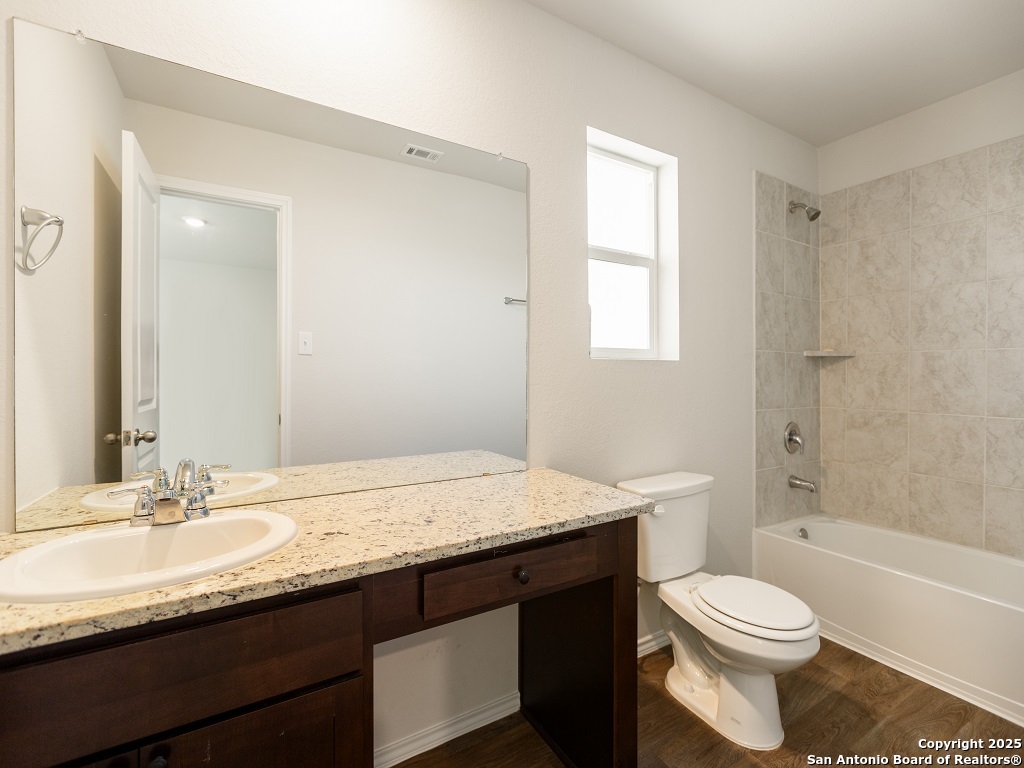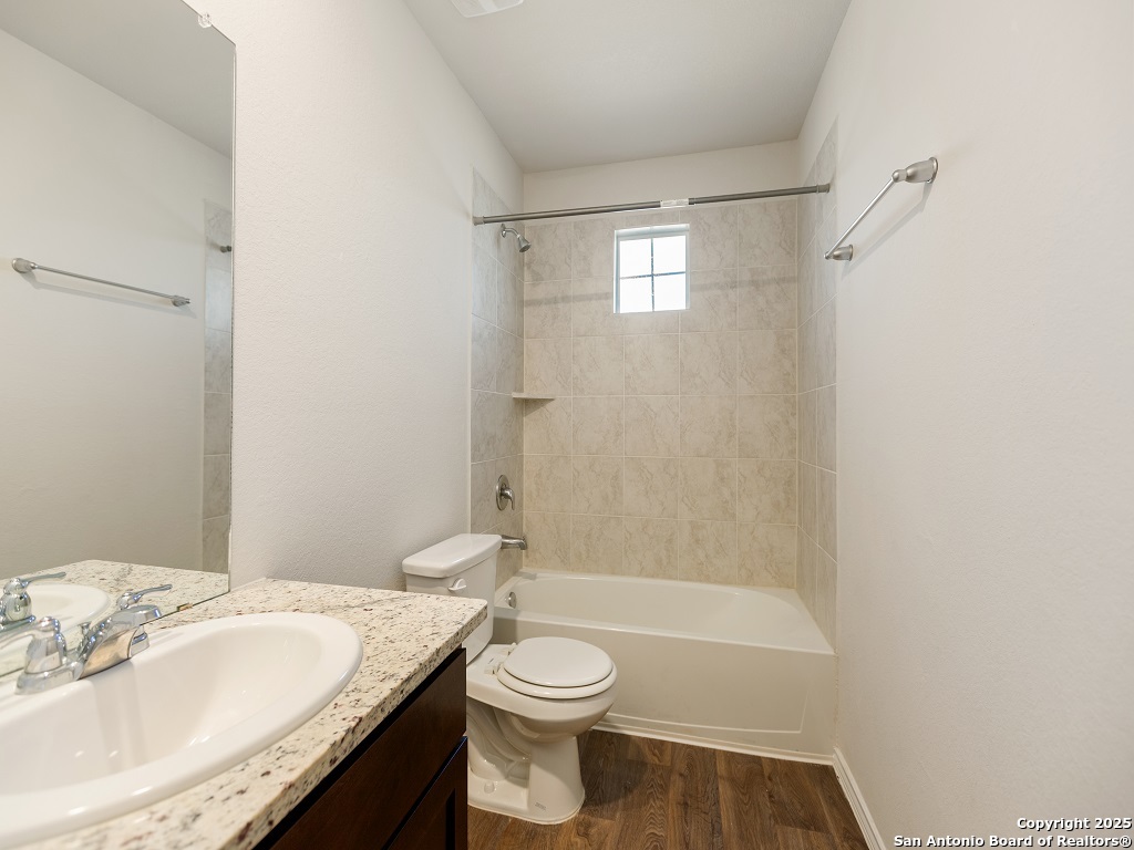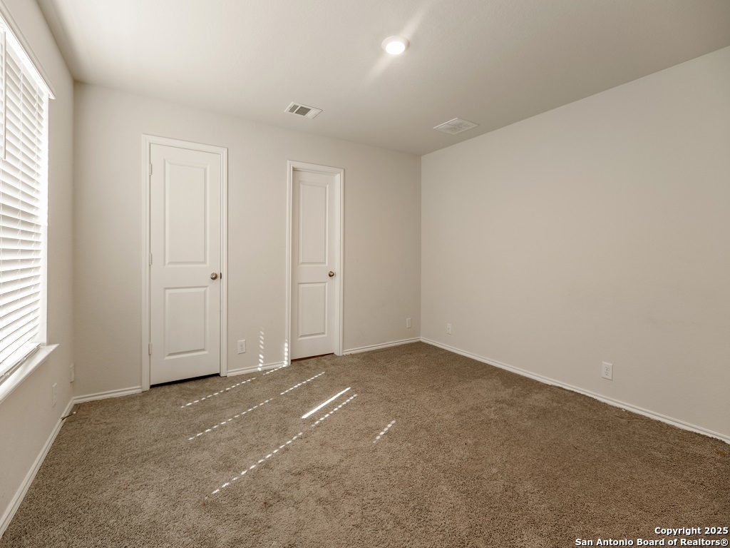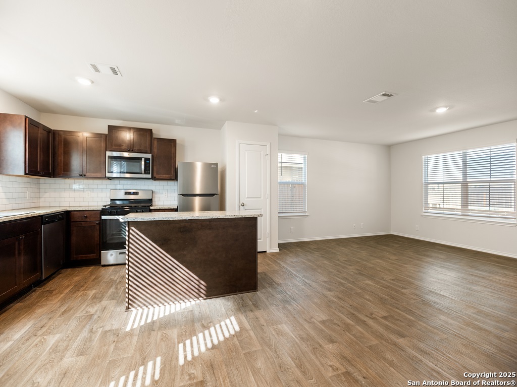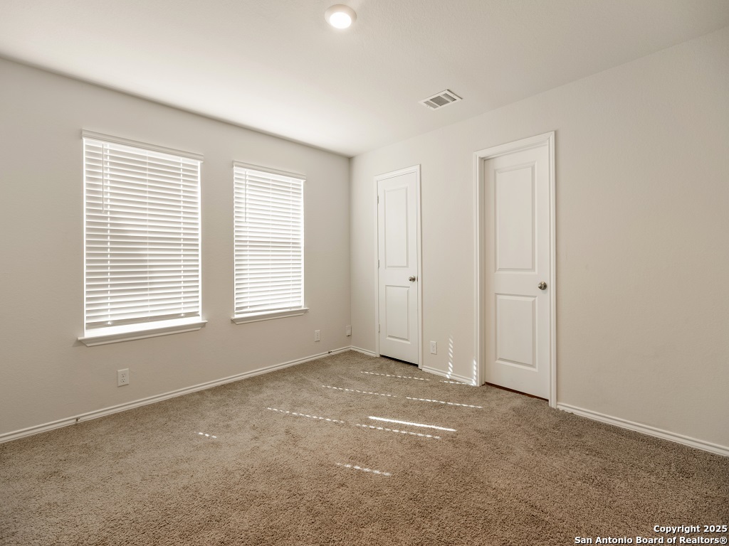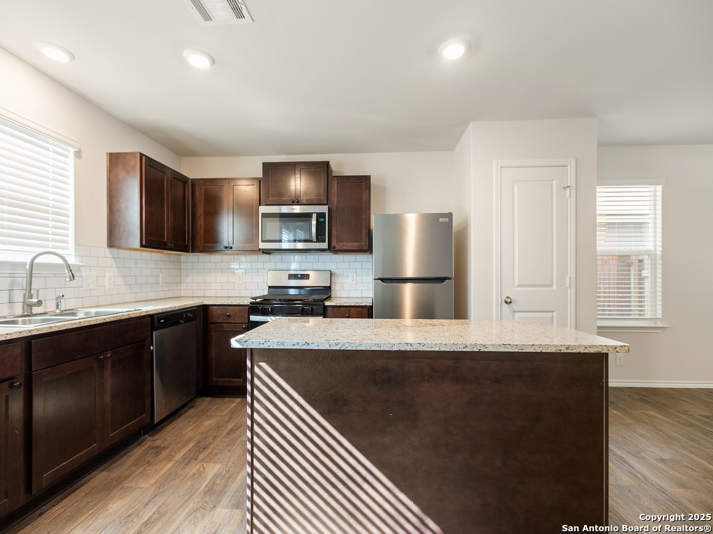 Welcome to your next home in the desirable Whisper Falls community, just minutes from Lackland Air Force Base! This charming two-story home offers 1,508 sq. ft. of thoughtfully designed living space with 3 bedrooms, 2.5 bathrooms, and a spacious open-concept layout perfect for comfortable everyday living and entertaining. The entry opens into a bright living area that flows seamlessly into the large kitchen and dining space, featuring granite countertops, black appliances, a refrigerator, and a central island perfect for gathering. Upstairs, you'll find the spacious bedroom 1 suite with a private bath and walk-in closet, along with two secondary bedrooms that each include walk-in closets and share a full bath. The first floor also includes a half bath and a utility room with a large additional storage closet. Stylish sheet vinyl flooring adds durability in the entry, living areas, and all wet spaces. Located in a vibrant community with amenities like a pool, playground, and fitness center, this property offers the perfect balance of comfort, convenience, and community.