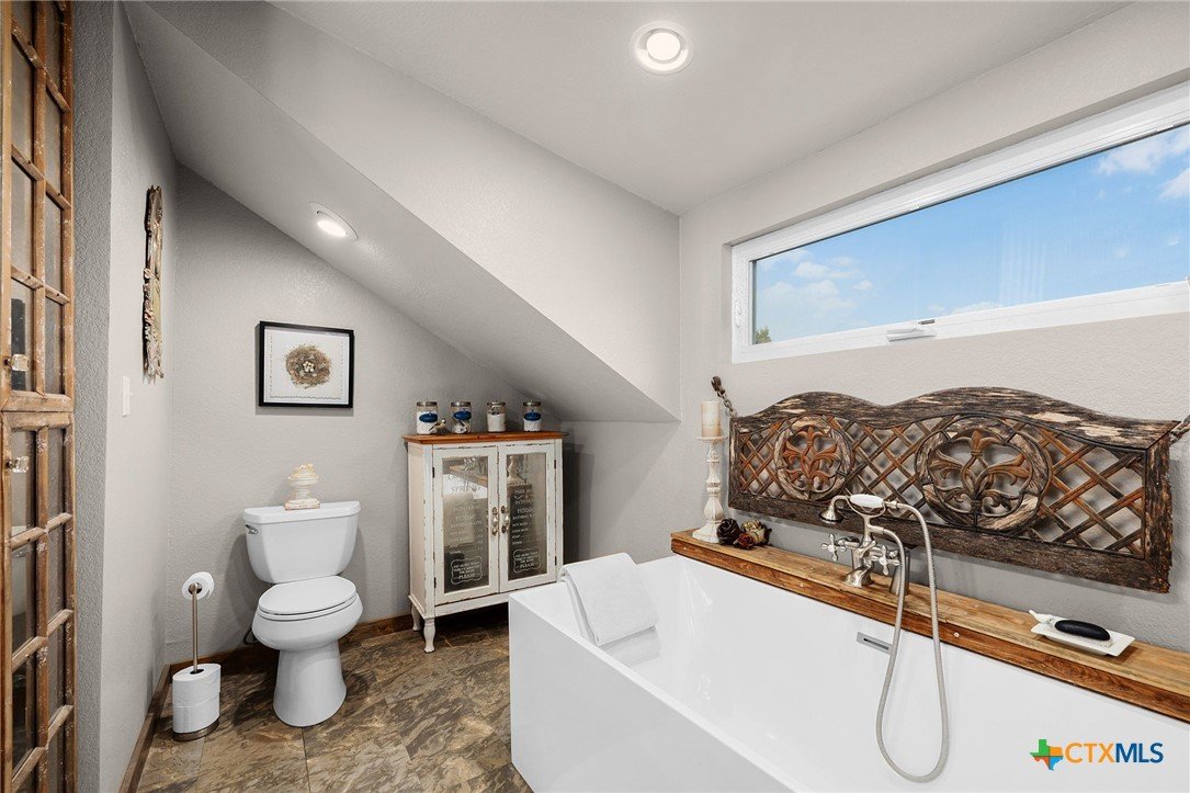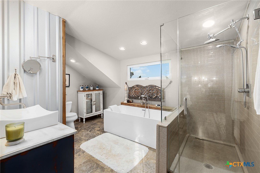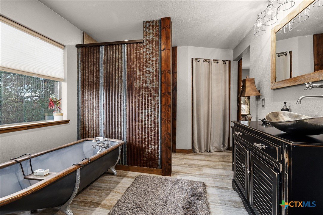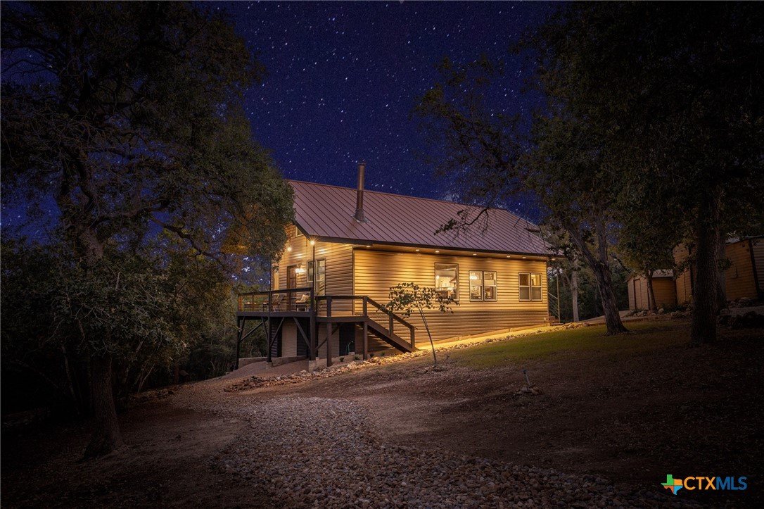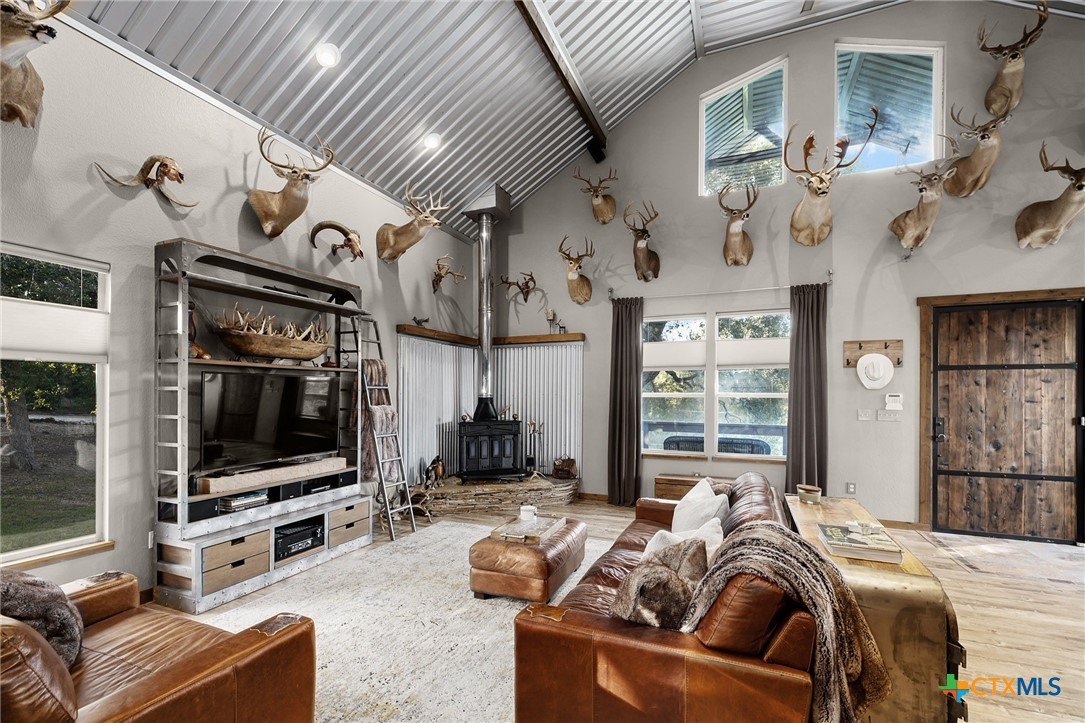 RARE FIND! Welcome to the Peace, Tranquility & Privacy of this Texas Hill Country Home Nestled on 4.68 Acrs. NO HOA-No Restrictions. Can be Used as Short Term Vacation Rental, as a Full Time Residence or Vacation Home. Custom Blt w/Many Unique High Quality Upgrades. Oversized Windows with Top Down/Bottom Up Shades Provide a Plethora of Natural Light. Interior Doors are 100 Yr Old Cypress. Custom Made Front/Back Doors are Solid Wood, Distressed & Banded w/Black Iron. Fabulous Kitchen Solid Wood Cabinets w/Deep Pull Out Drawers & Pull Out Spice Cabinet, Lrg Pantry w/Pull Out Drawers, SS Appl, Granite Counters, Breakfast Bar, Dishwasher & X-Lrg SS Farm Sink. Antique Refurbished Franklin Wood Stove (1800's). Soaring Galvanized Aluminum Vaulted Ceiling. Upgraded Lighting & Plumbing Fixtures T/O Home & Recessed Lighting. Baths have Soaking Tubs & Sep. Showers. Beautiful Refurbished Antique Cowboy Tin Tub w/Brushed Nickel Faucets in One & a Genesa Soaking Tub (for 2) in the other. Stunning Views from 3 Covered Patios Decked w/Sturdy TREX Material. Covered Deck Overlooks Pond, which has a New Pump & Liner. Babbling Creek from Private Well Fills the Pond. Convenient Outdoor Shower w/Hot & Cold Water. Sprinkler Sys Yard w/Manual Shut Off Valves, Water Softener (owned), Safe Room, Living Room & Patios Wired For Speakers, Wired for WiFi, Gated Entry, Concrete Driveway with/Outdoor LED Lighting, 5 Camera Ext. Security Sys w/Night Vision, 2 Wildlife Stands. 30 & 50 AMP Plug Ins for Camper/RV. Convenient Outdoor Shower w/HOT & COLD Water. Private Well, Spray Foam Insulation and Aerobic Septic Make for Low Utility Bills. Well is approx. 580' w/an 3000 Gallon Cistern. Cool 1260 SqFt Basement Provides Lots of Storage & Boat Storage. Garage is Currently Used as a Workshop. All Appliances Convey. Furnishings Avail & Nego. Owner needs Short-Term Leaseback. Prime Location! Minutes from Gruene, New Braunfels, Canyon Lake, Guadalupe River, Wimberley & San Marcos.
