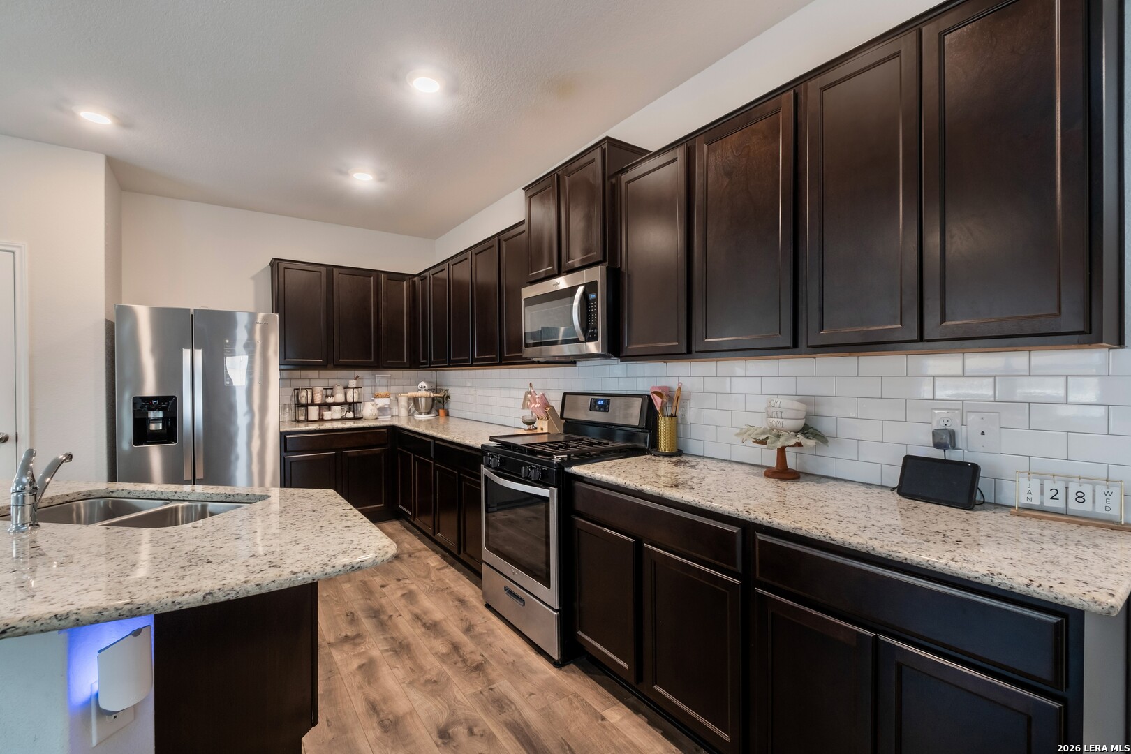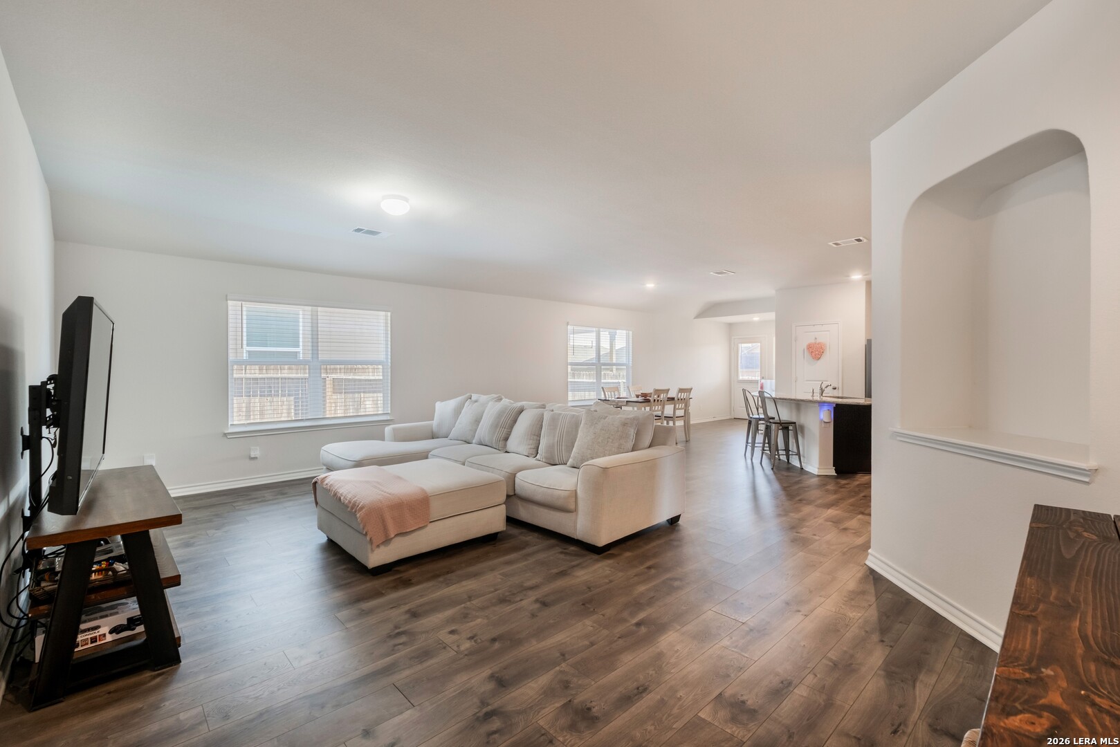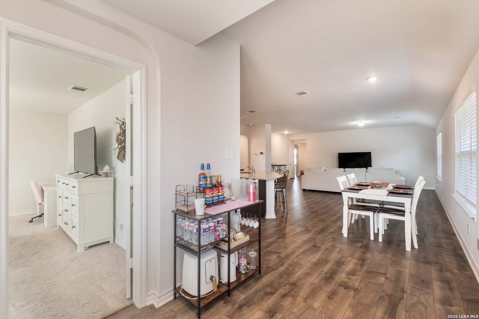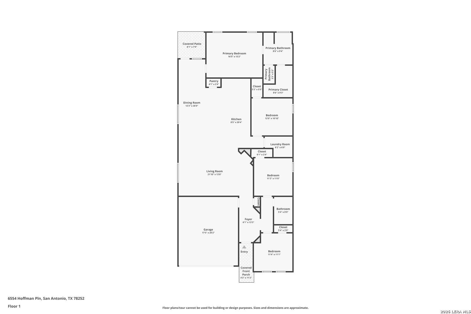 Situated on a desirable corner lot, this well-designed home welcomes you through a covered front porch into a defined foyer with direct access from the 2-car attached garage. The entry sets the stage for a functional layout that offers both comfort and flexibility. Just off the foyer is a front bedroom, ideal for guests, a home office, or a flex space. A full bathroom is conveniently located nearby, creating a practical front wing of the home. Moving toward the center of the home, the layout opens into an open-concept living area that seamlessly combines the living room, kitchen, and dining space. This expansive area is ideal for everyday living and entertaining. The kitchen features a central island with breakfast bar seating, granite countertops, ample cabinetry, and a pantry, all overlooking the main living space for easy flow and connection. Along the right side of the home, two additional secondary bedrooms and a dedicated laundry room provide functionality and privacy for family or guests. Tucked away at the back of the home, the spacious primary suite offers a private retreat. The primary bedroom is complemented by an ensuite bathroom with a dual vanity, garden tub, separate walk-in shower, and a walk-in closet. The dining area leads directly to a covered rear patio and a wooden-fenced backyard, extending the living space outdoors and creating an ideal setting for relaxing. Residents also enjoy access to community amenities that include a pool, clubhouse, and fitness gym, adding to the overall lifestyle appeal of this corner-lot home.