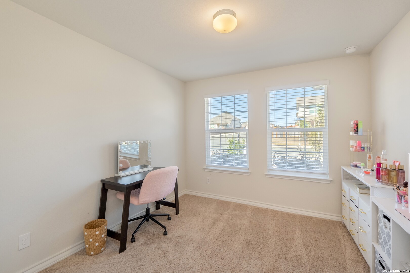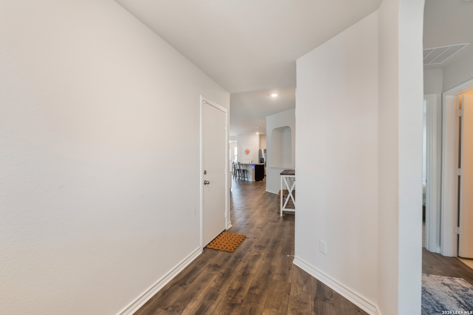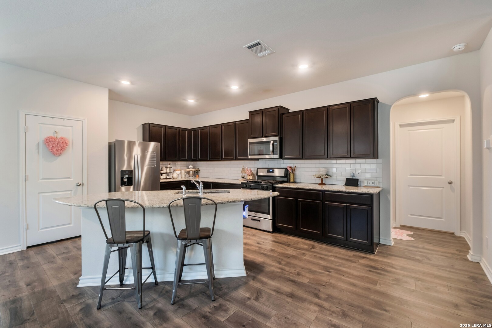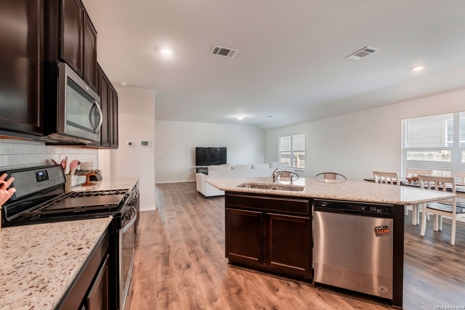 Situated on a desirable corner lot, this well-designed home welcomes you through a covered front porch into a defined foyer with direct access from the 2-car attached garage. The entry sets the stage for a functional layout that offers both comfort and flexibility. Just off the foyer is a front bedroom, ideal for guests, a home office, or a flex space. A full bathroom is conveniently located nearby, creating a practical front wing of the home. Moving toward the center of the home, the layout opens into an open-concept living area that seamlessly combines the living room, kitchen, and dining space. This expansive area is ideal for everyday living and entertaining. The kitchen features a central island with breakfast bar seating, granite countertops, ample cabinetry, and a pantry, all overlooking the main living space for easy flow and connection. Along the right side of the home, two additional secondary bedrooms and a dedicated laundry room provide functionality and privacy for family or guests. Tucked away at the back of the home, the spacious primary suite offers a private retreat. The primary bedroom is complemented by an ensuite bathroom with a dual vanity, garden tub, separate walk-in shower, and a walk-in closet. The dining area leads directly to a covered rear patio and a wooden-fenced backyard, extending the living space outdoors and creating an ideal setting for relaxing. Residents also enjoy access to community amenities that include a pool, clubhouse, and fitness gym, adding to the overall lifestyle appeal of this corner-lot home.