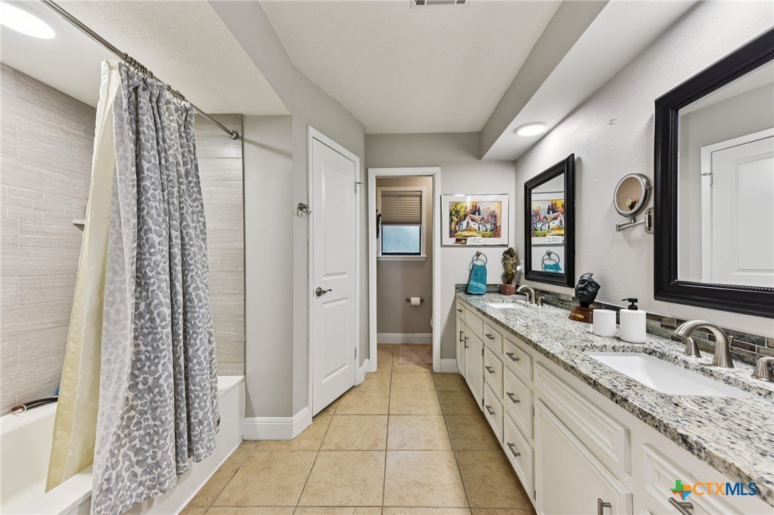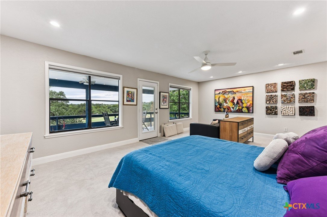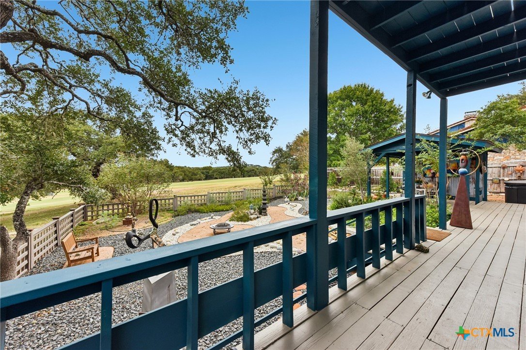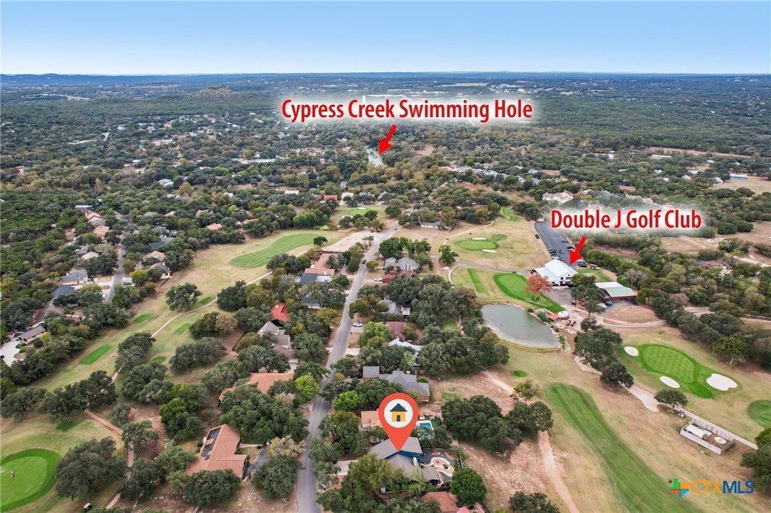 Owner Financing Available! This one-of-a-kind home, beautifully updated by nationally recognized artist Warren Cullar and his wife Kitty, captures incredible Hill Country views and timeless style. The perfect floorplan lives like a single story, with everything on the main level except a must-see upstairs primary suite. The spacious primary retreat offers panoramic Hill Country vistas and opens to a large, covered balcony overlooking the 1st tee of the Double J Golf Course. It features two walk-in closets and an additional 200 sq. ft. bonus room for extra flexibility. Downstairs, the stunning great room impresses with its soaring wood plank ceiling, skylights, and new picture windows framing the recently added electric fireplace and views of the decks and golf course. Many more recent updates including a new roof and gutters (2024), modern interior lighting, fresh exterior paint, outdoor lighting, and an incredible garage workshop with epoxy floors, an insulated door, split HVAC system, abundant cabinetry, countertops, and a utility sink. Designed for entertaining, the backyard features multiple decks overlooking professionally landscaped, low maintenance rock gardens and lush planting beds. Located in the heart of the Texas Hill Country, this exceptional property is just 5 minutes from downtown Wimberley’s shops, galleries, and restaurants, and only half a mile from the iconic Cypress Falls Swimming Hole.