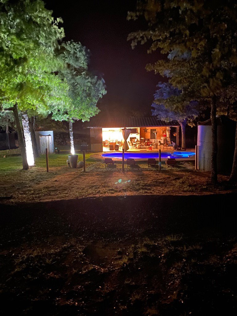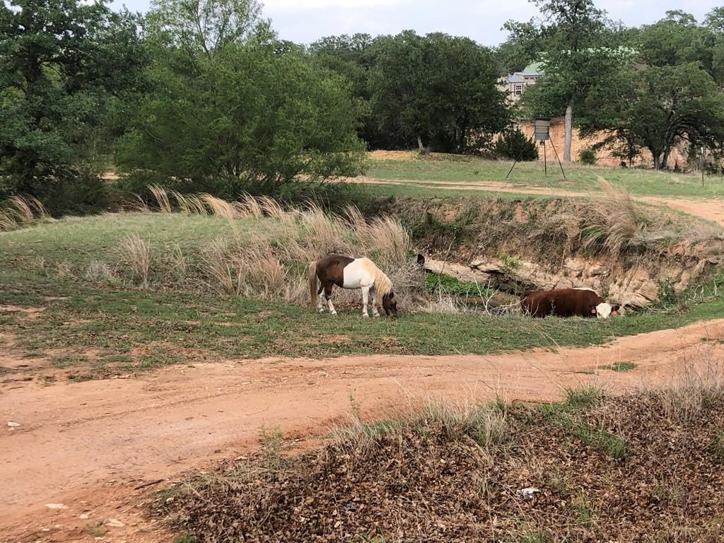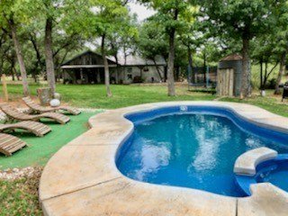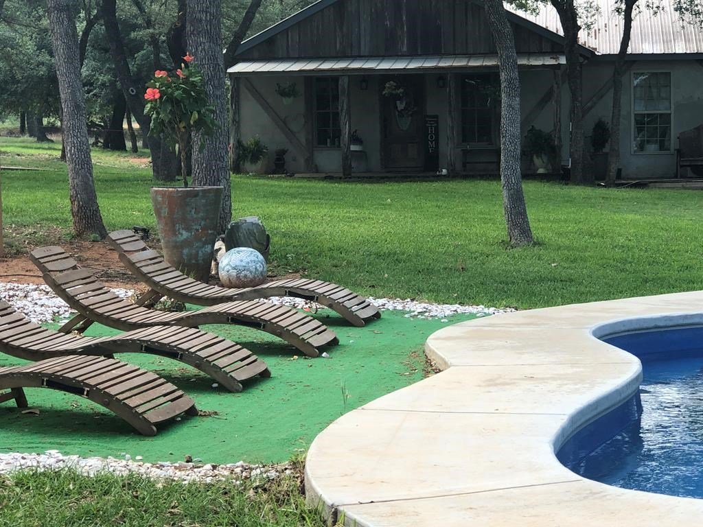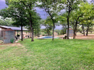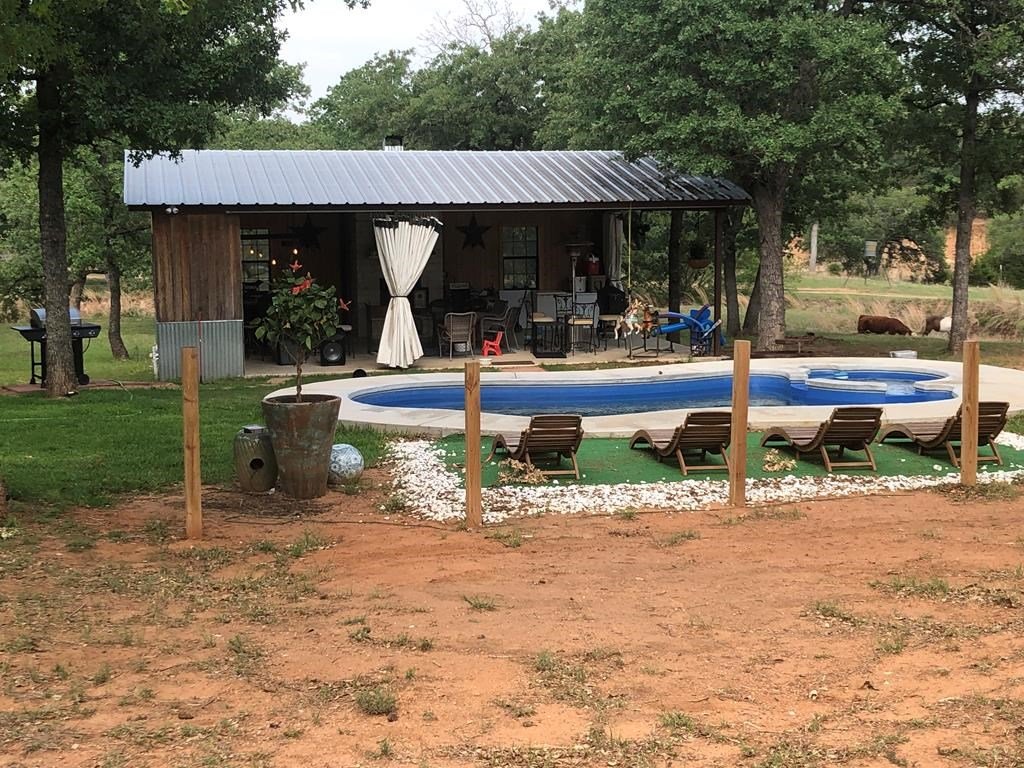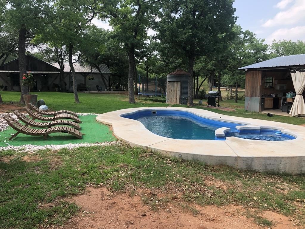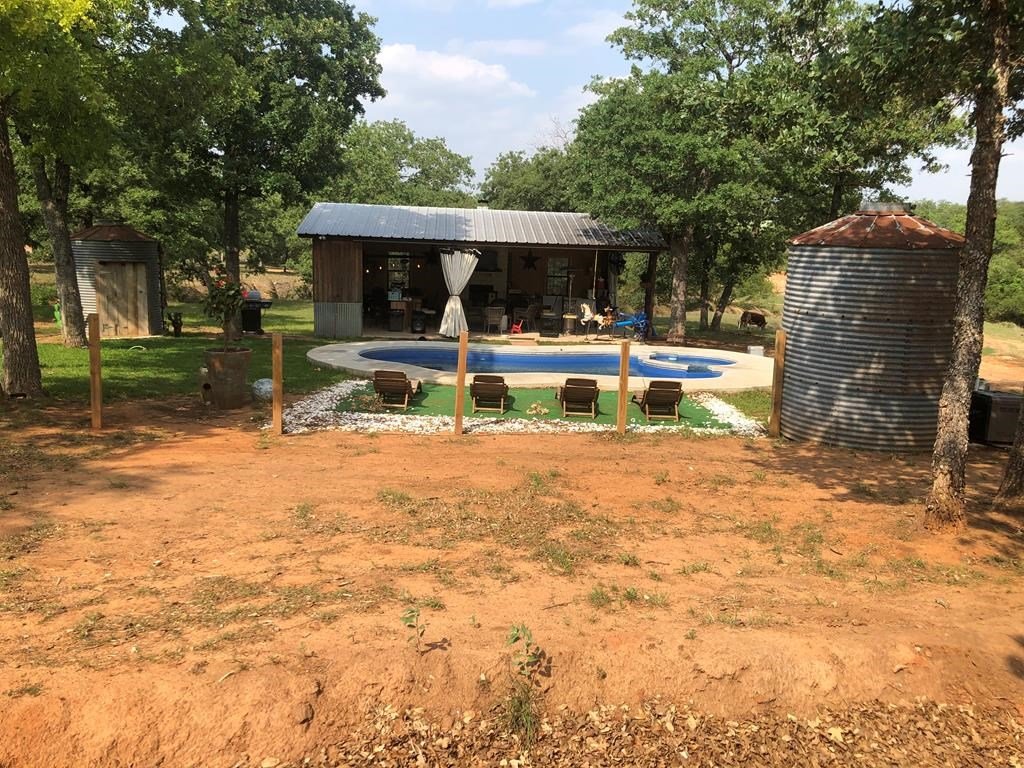 9.80 acres with post oak trees and sandy soil, creek/small pond, 2 BR, 2 Bath home with heated pool and hot tub, party barn with rock fireplace. Cabin 1 BR 1 Bath with sleeping loft, nice view of creek, cattle barns and pen, AG exempt, no restrictions, room for more cabins. This property is perfect for short-term rentals. Beautiful setting with creek and pool.
