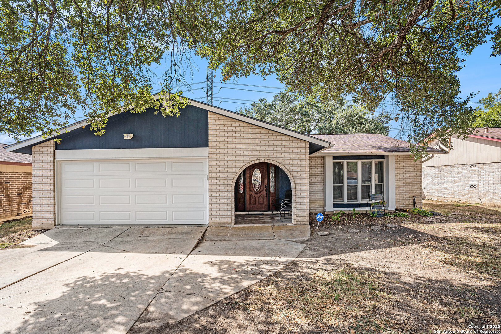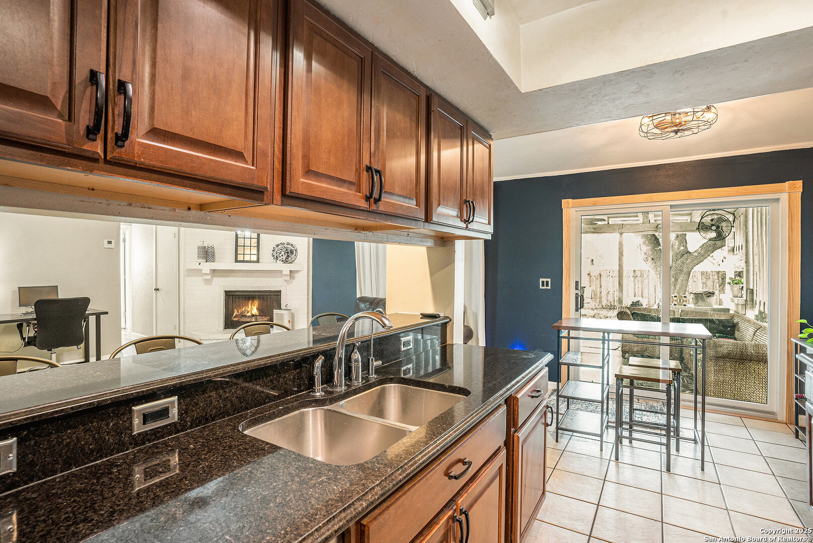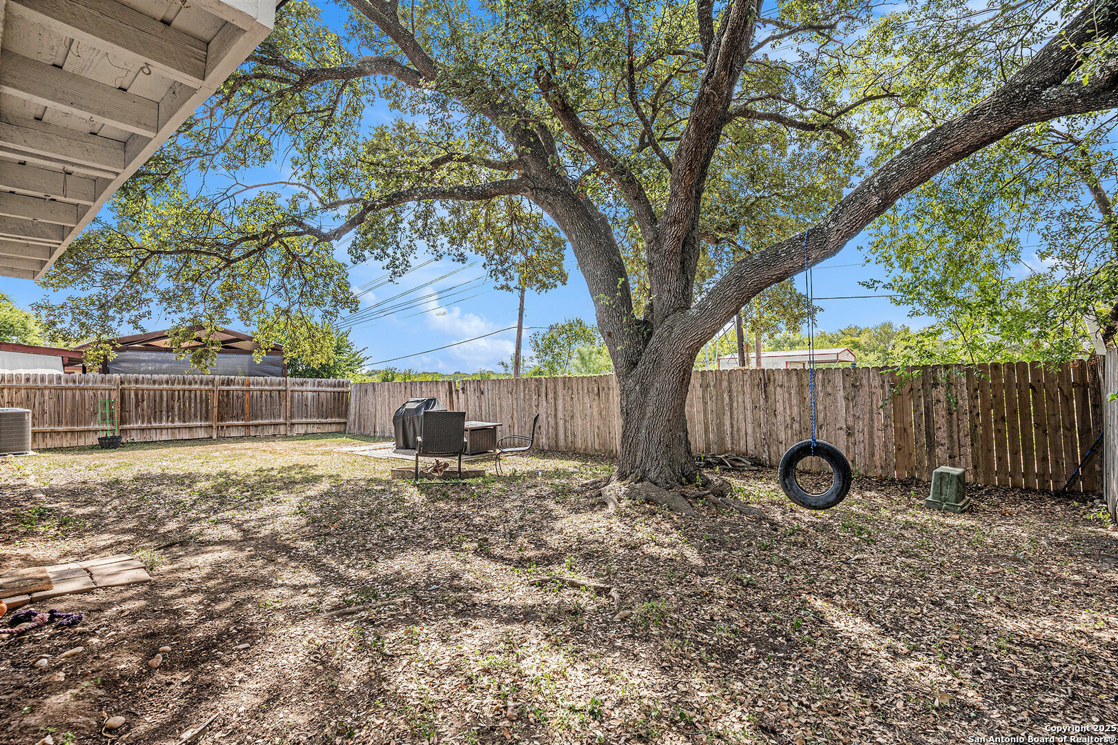 Welcome to this delightful single-story home offering comfort, versatility, and great outdoor living. The inviting front yard greets you with lush green grass and two beautiful mature trees, creating instant curb appeal. Step inside to a welcoming foyer that opens into a bright living area with a cozy fireplace, ideal for relaxing or entertaining. The kitchen features granite countertops, stainless steel appliances, and a breakfast bar that overlooks the living space, along with an eat-in dining area perfect for everyday meals. The primary suite is tucked away at the rear of the home for added privacy and includes a private bath with dual vanities and a walk-in shower. A flex room offers endless possibilities-use it as a home office, fourth bedroom, or formal dining room. The covered patio is perfect for outdoor dining or unwinding after a long day. The large backyard is fully fenced, has no back neighbors, and plenty of space to create your ideal outdoor retreat. Located just minutes from shopping, dining, and major highways, this home combines convenience with comfort-and best of all, no HOA! This home is also close to Lackland AFB and Fort Sam