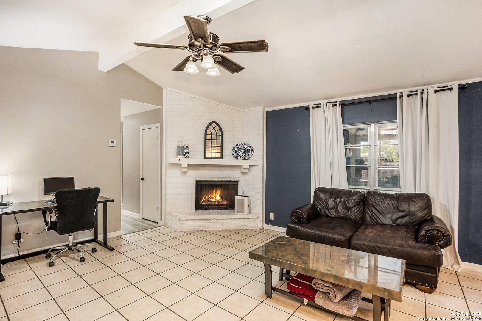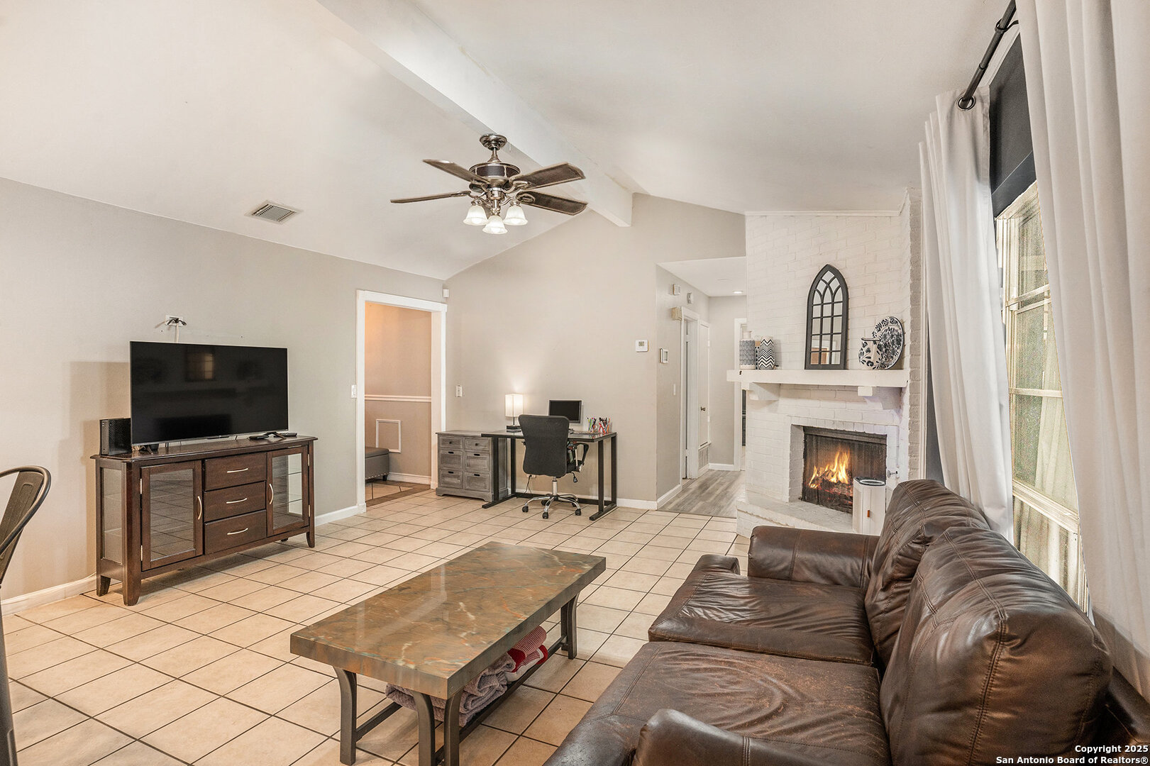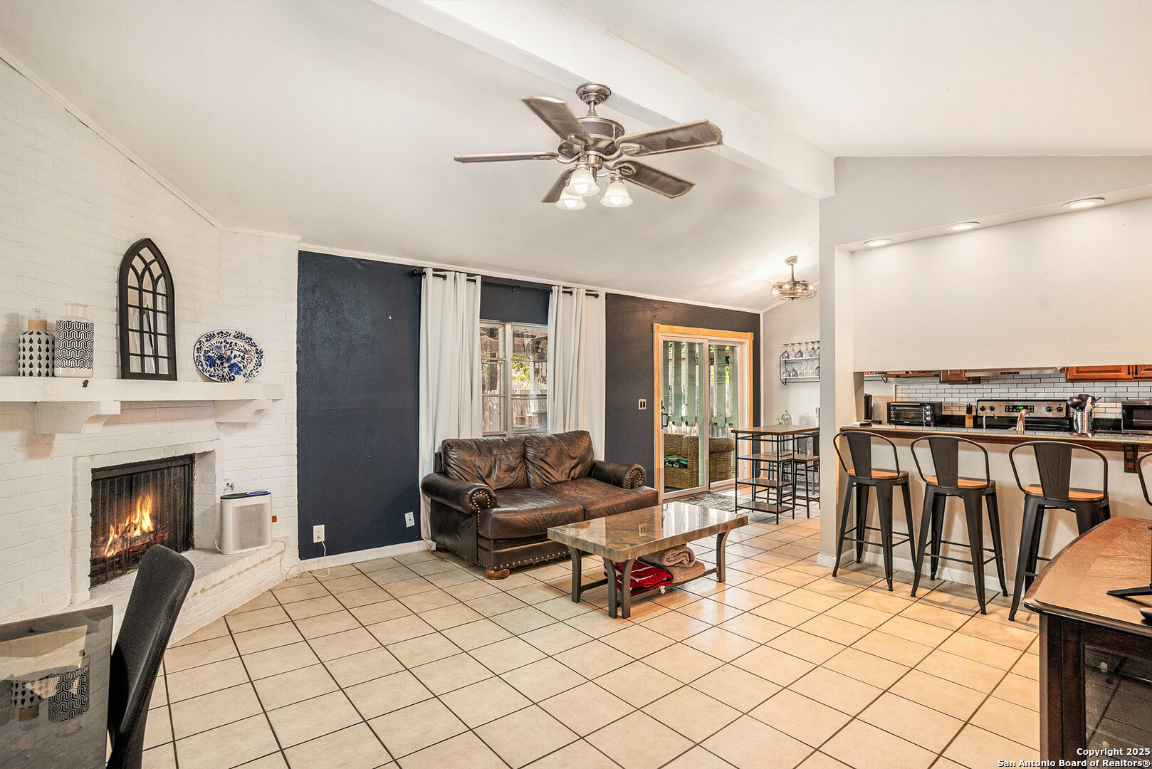 Welcome to this delightful single-story home offering comfort, versatility, and great outdoor living. The inviting front yard greets you with lush green grass and two beautiful mature trees, creating instant curb appeal. Step inside to a welcoming foyer that opens into a bright living area with a cozy fireplace, ideal for relaxing or entertaining. The kitchen features granite countertops, stainless steel appliances, and a breakfast bar that overlooks the living space, along with an eat-in dining area perfect for everyday meals. The primary suite is tucked away at the rear of the home for added privacy and includes a private bath with dual vanities and a walk-in shower. A flex room offers endless possibilities-use it as a home office, fourth bedroom, or formal dining room. The covered patio is perfect for outdoor dining or unwinding after a long day. The large backyard is fully fenced, has no back neighbors, and plenty of space to create your ideal outdoor retreat. Located just minutes from shopping, dining, and major highways, this home combines convenience with comfort-and best of all, no HOA! This home is also close to Lackland AFB and Fort Sam