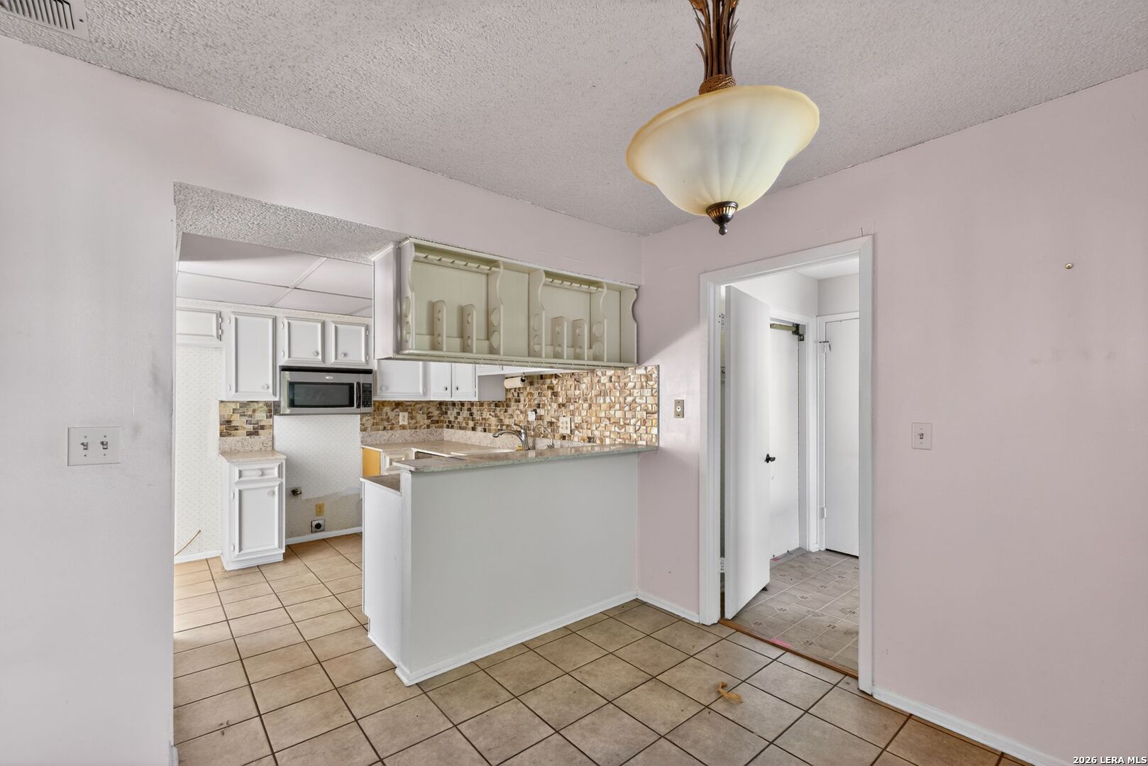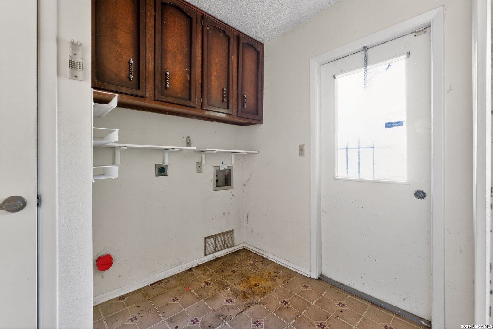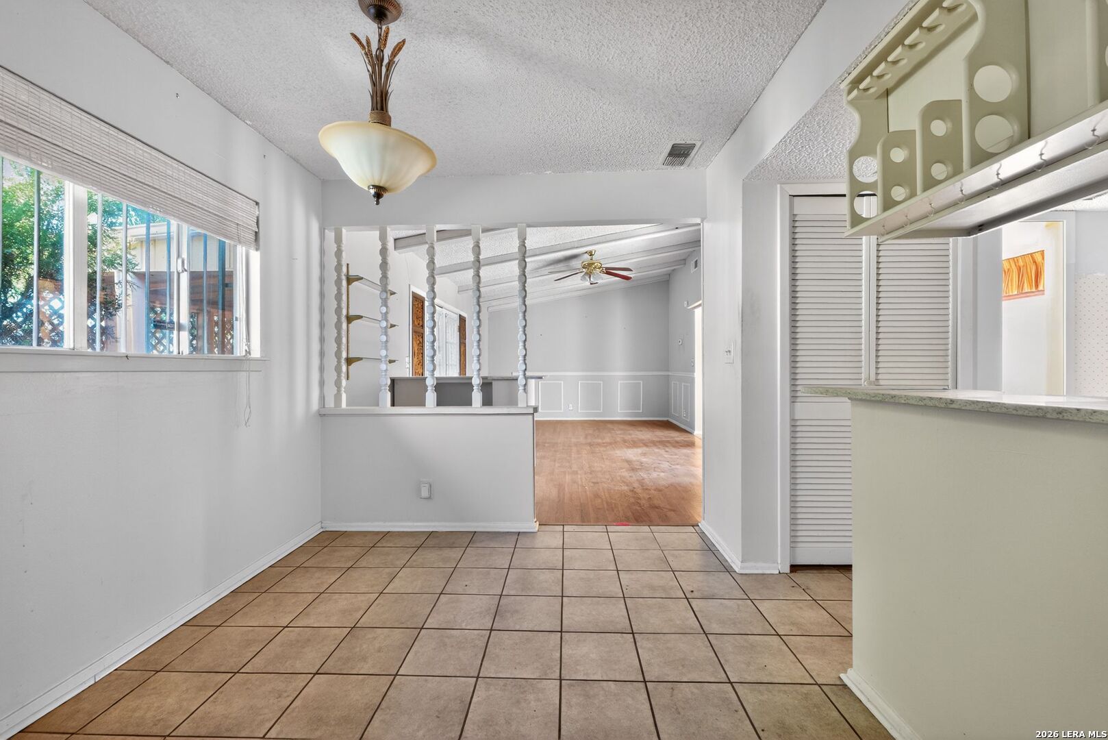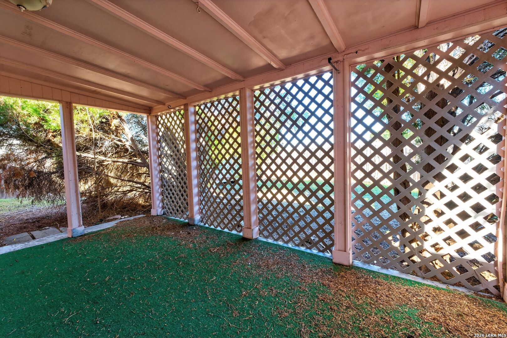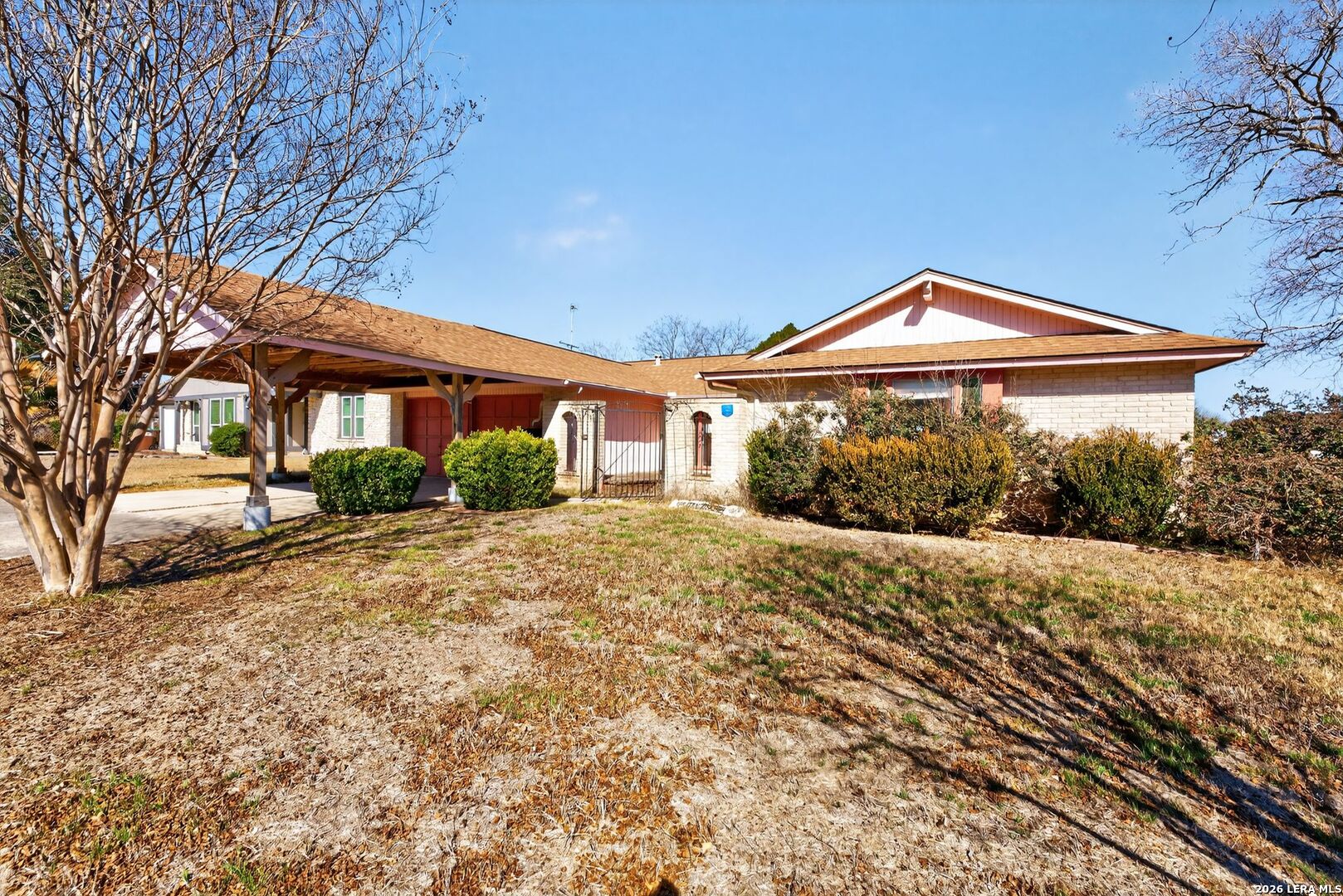 Charming ranch-style home on a spacious corner lot in the established Woodlake neighborhood! This property offers curb appeal and functionality with a two-car carport and a gated front porch with deck! Inside, you'll find vaulted ceilings in the living room, warm wood flooring, and an entertaining bar area. The home features both a formal dining room and an eat-in breakfast area, offering flexibility for everyday living and hosting. The kitchen stands out with granite countertops, designer backsplash, and stainless steel appliances. Built-in storage and shelving in the guest bedrooms add character and practical organization. A formal utility room on the main level for convenience. The partially converted garage includes a bonus office/flex space along with a wet bar workspace - ideal for a home office, hobby room, or creative studio. Step outside to enjoy the private fenced backyard complete with a covered back porch and storage shed. This HUD-owned property is being sold As-Is and may require repairs, including possible foundation stabilization. Excellent opportunity for buyers seeking value-add potential or renovation financing options. Conveniently located near Randolph AFB, major highways, shopping, and dining. Schedule your showing today and bring your vision!