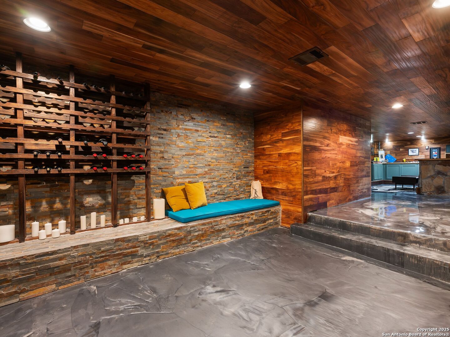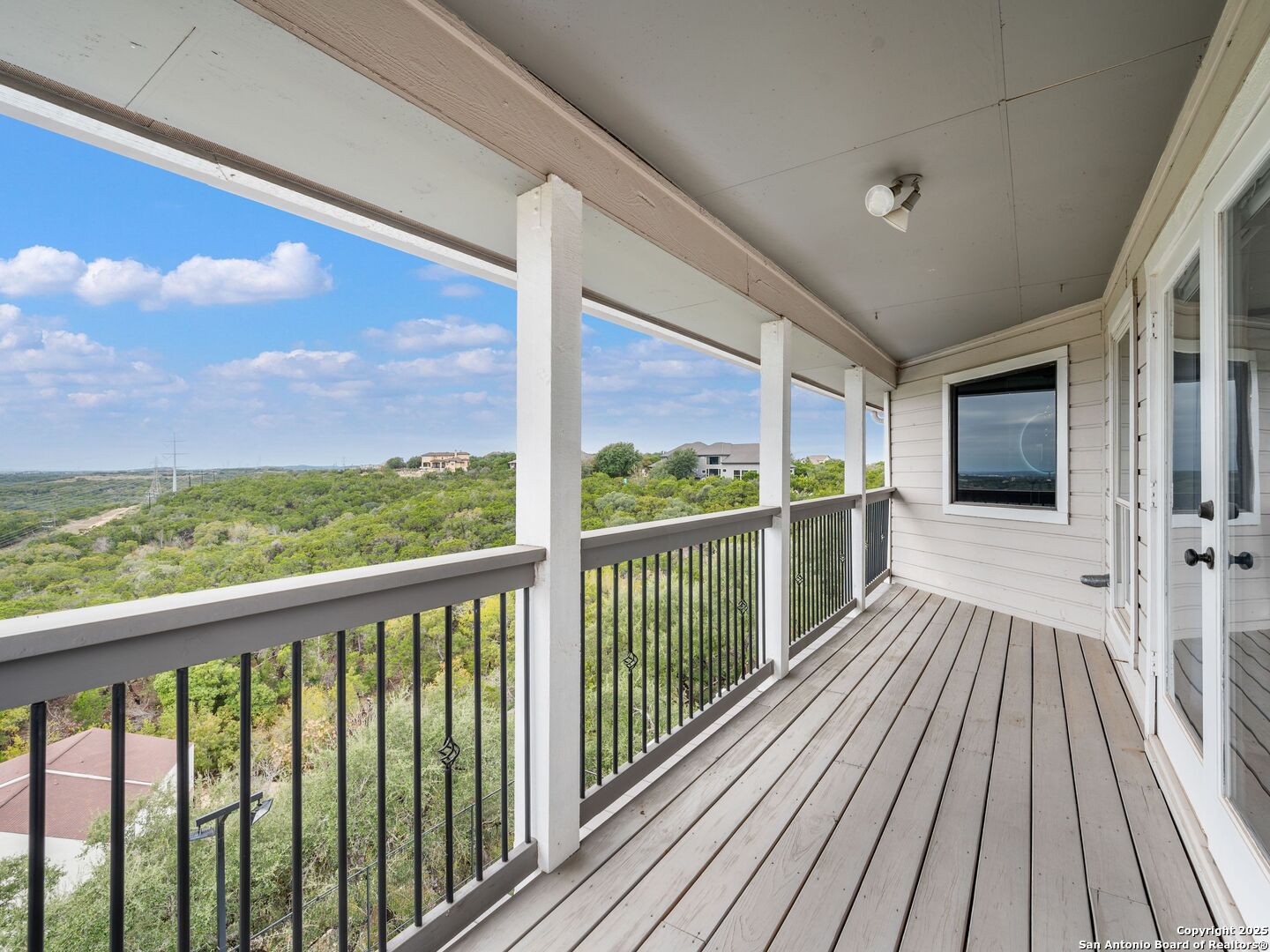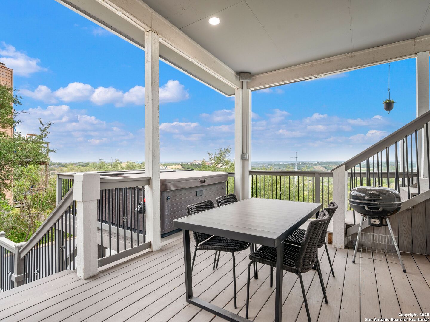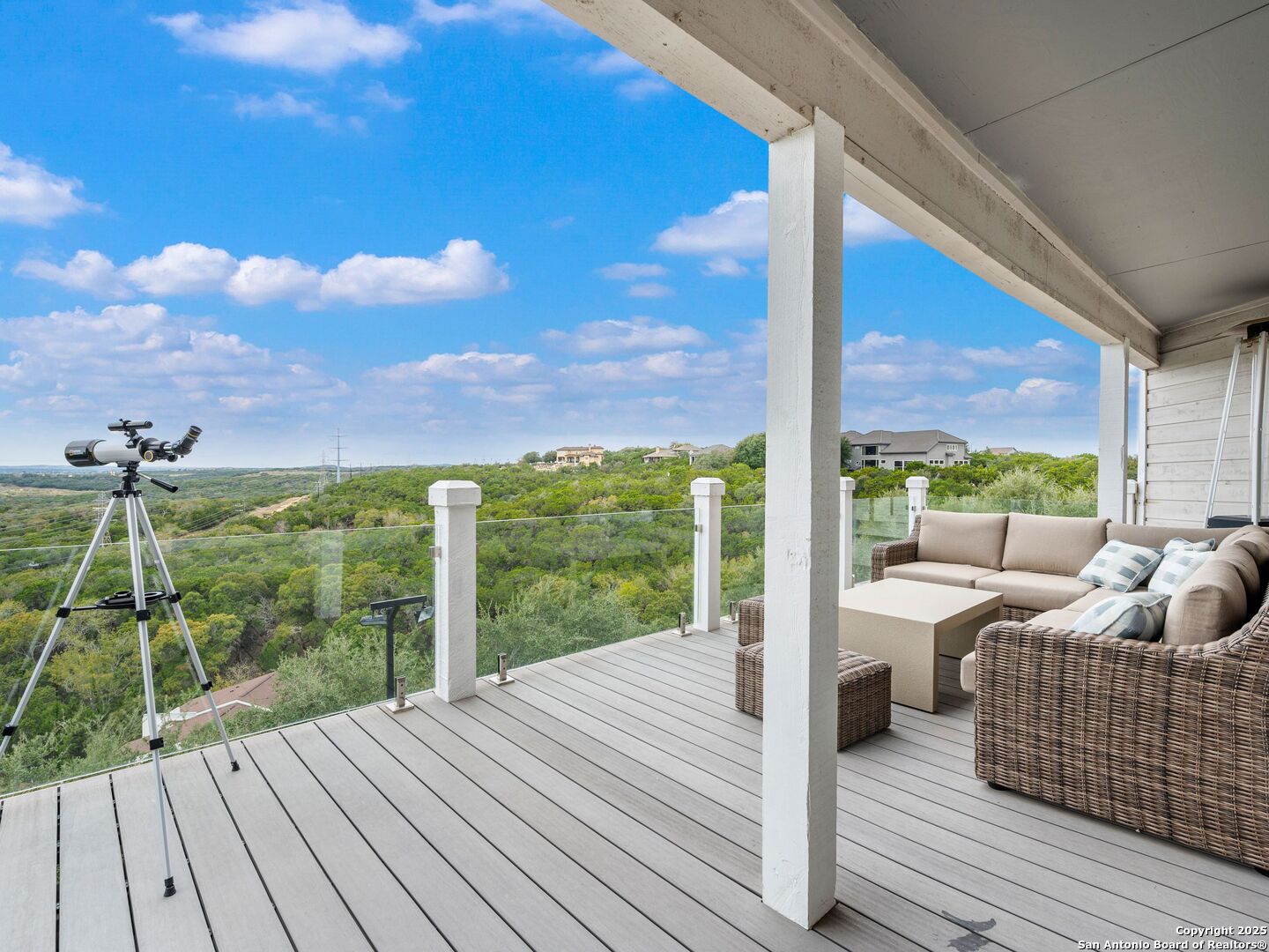Set above the rolling hills of Crownridge, this thoughtfully updated residence captures sweeping Hill Country and downtown skyline views from nearly every vantage point. The home blends refined living with effortless entertaining, offering generous indoor-outdoor spaces and multi-level terraces designed to showcase the scenery. A light-filled main living area welcomes you upon entry, anchored by a gas fireplace and a redesigned wet bar. The island kitchen serves as the heart of the home, updated with quartz countertops, a modern backsplash, and an expanded butler's pantry with new cabinetry. A wood-paneled study with built-ins includes a private spiral staircase leading to a climate-controlled wine room on the lower level. Downstairs, two guest bedrooms enjoy terrace access and unobstructed views, accompanied by an updated full bath, a media room, and a flexible living space with direct access to the backyard. Upstairs, the primary suite offers complete privacy with its own terrace, a large walk-in closet, and a renovated spa bath featuring an oversized walk-in shower, standalone soaking tub, and dual vanities. Outdoors, tiered terraces provide ideal settings for dining, relaxing, and taking in fireworks from Six Flags. Additional features include a sports court, firepit area, hot tub, and professionally landscaped grounds. The property sits moments from I-10 and 1604, with quick access to La Cantera, The Rim, Camp Bullis, Friedrich Wilderness Park, and Eisenhower Park.