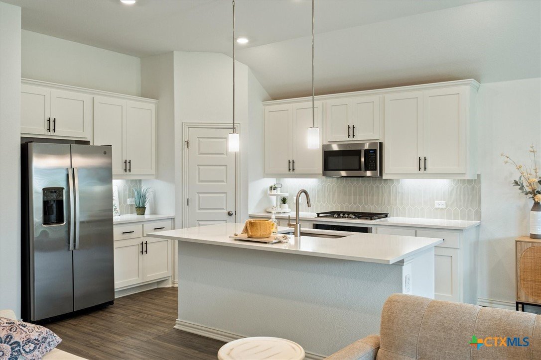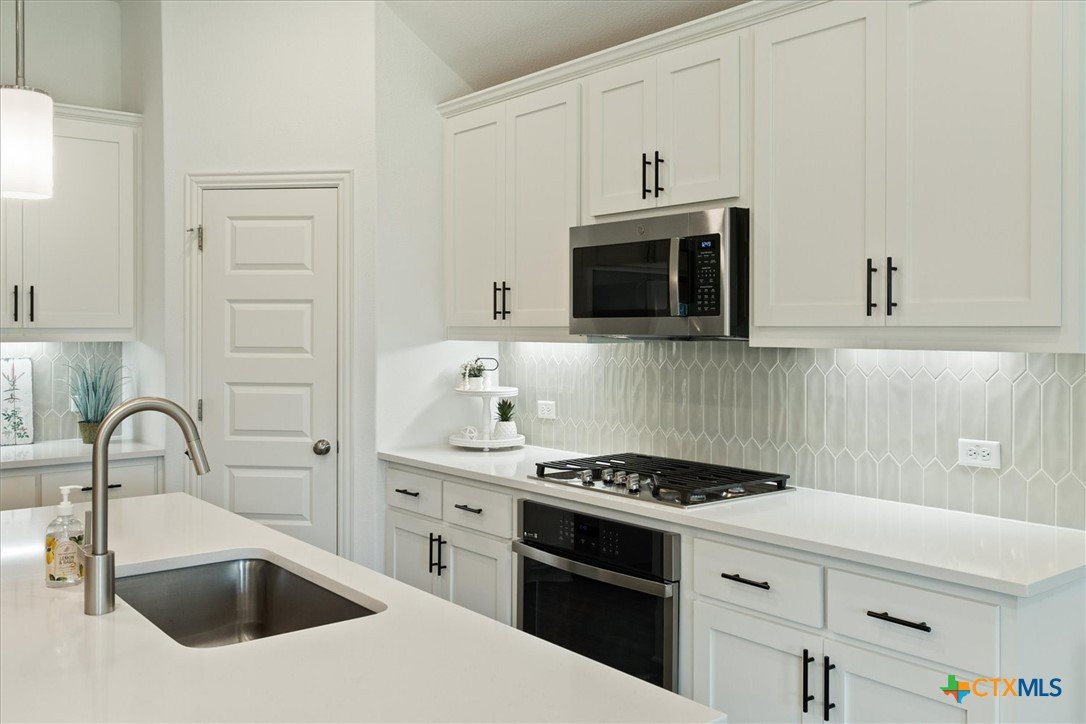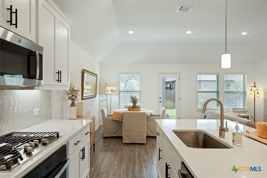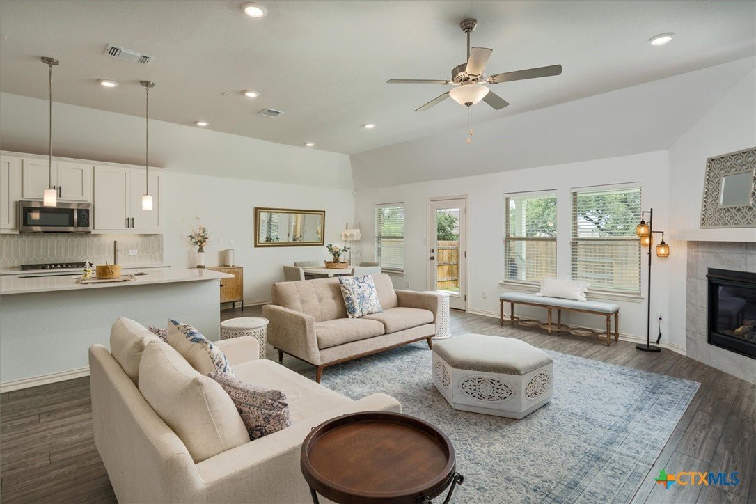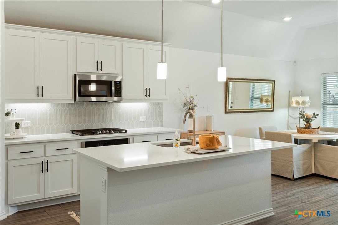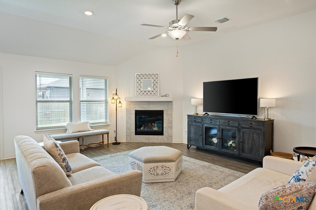 Low TAX RATE! Listing refreshed and staged! Welcome to your new home placed in the highly sought-after community of 6 Creeks, where convenience meets natural beauty! Step inside to discover the perfect modern comforts. LVP wood-style flooring creates an inviting atmosphere at every turn, easy on little feet and paws too! The heart of the home lies in the spacious kitchen, featuring bright white cabinets, countertops, and a huge island that serves as the focal point, overlooking the rest of the living space with a beautiful modern fireplace. Whether preparing meals or entertaining guests, this kitchen will inspire culinary creativity and lively gatherings. Step outside to your backyard oasis, where an extended covered patio provides the perfect spot for outdoor dining, BBQ (gas drop stub), or relaxing in the evening shade while overlooking the lush greenery around you. Don't miss your chance to own this exceptional home in 6 Creeks, where the best of both worlds awaits – urban convenience and natural serenity! Amenity Center/pool, pickleball courts, playscape, and pond are within .25 miles of this fabulous home. This stunning home offers easy access to major highways while being enveloped in the tranquility of winding walking trails and picturesque scenery.