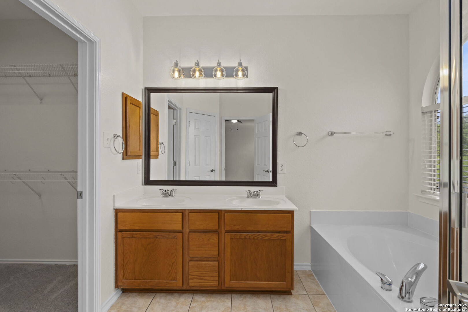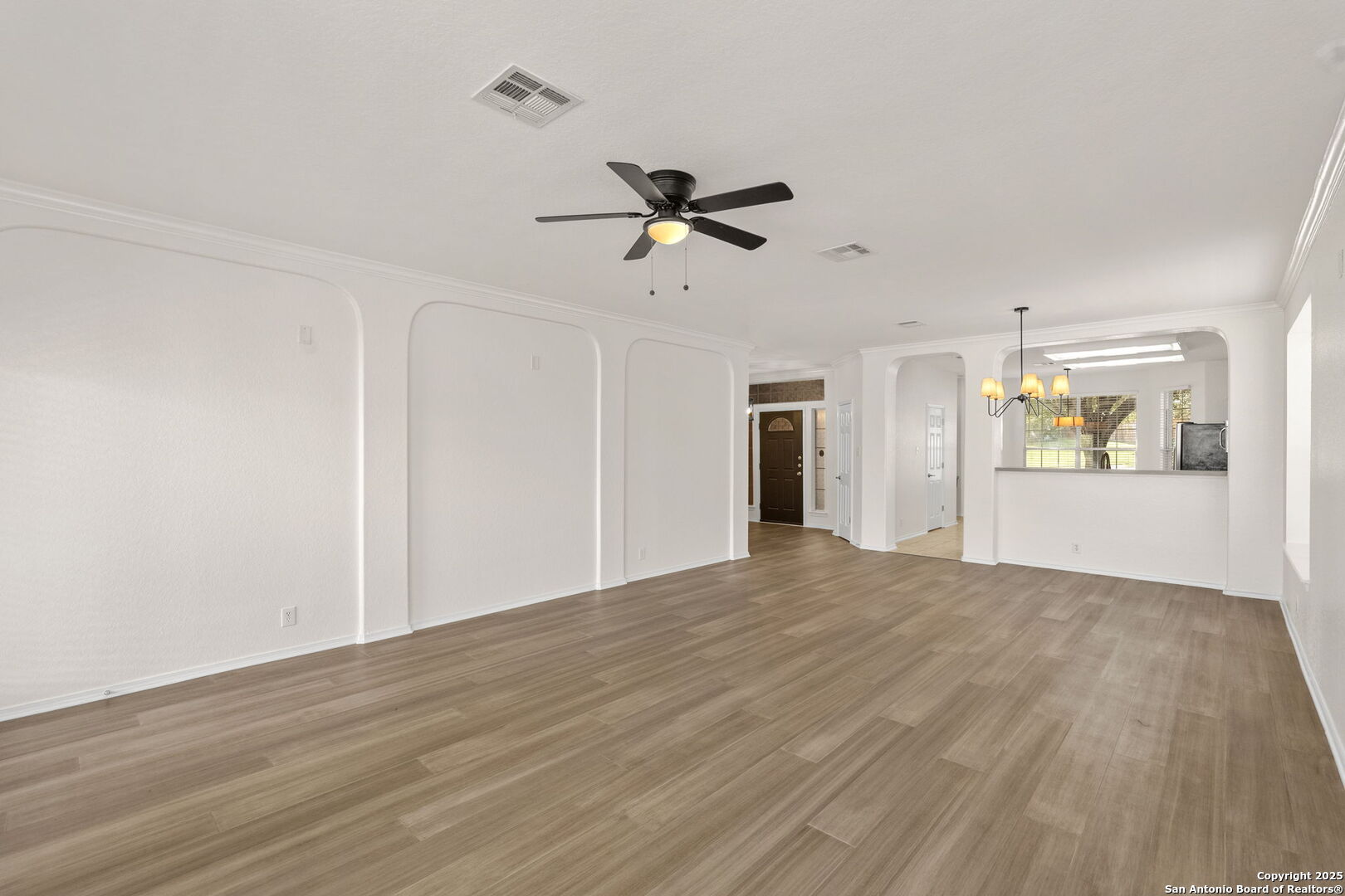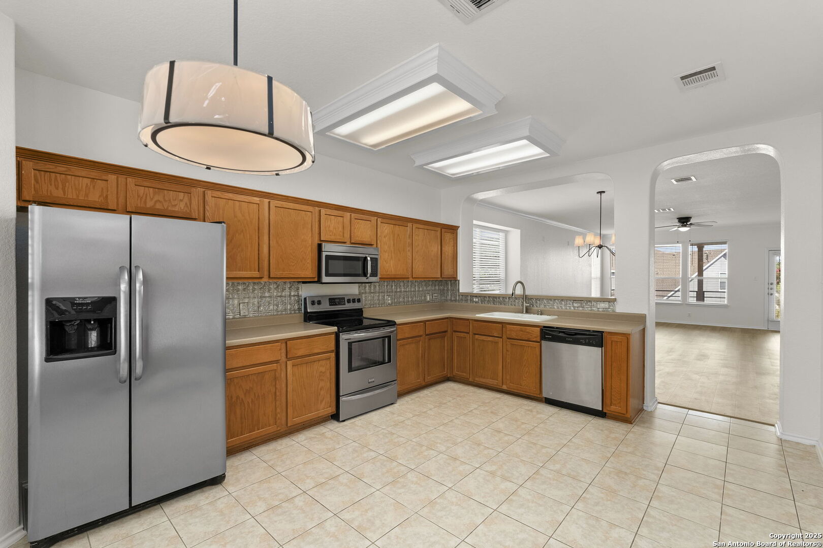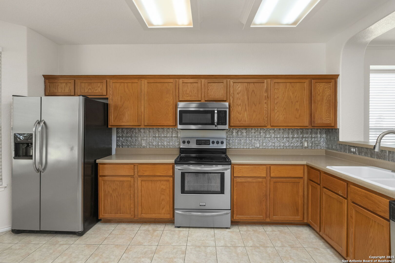 Natural light fills this inviting 3-bedroom, 2-bathroom home in a peaceful New Braunfels neighborhood. The bright open layout creates effortless flow between the spacious living area and kitchen, making it easy to host friends or enjoy quiet evenings at home. The kitchen is a standout feature, equipped with stainless steel appliances, generous cabinetry, a cozy breakfast nook, and a built-in planning area that adds convenience to your daily routine. Plush carpeting adds warmth to the bedrooms, including a comfortable primary suite complete with a walk-in closet, garden tub, and private en suite bath. Step outside to a beautifully maintained backyard with a covered patio and a tiered deck-perfect for entertaining or relaxing under the Texas sky. Located on a quiet knuckle street with easy access to Highway 46, this home offers both tranquility and convenience. H-E-B, shopping, and dining are just minutes away, making this a wonderful place to call home.