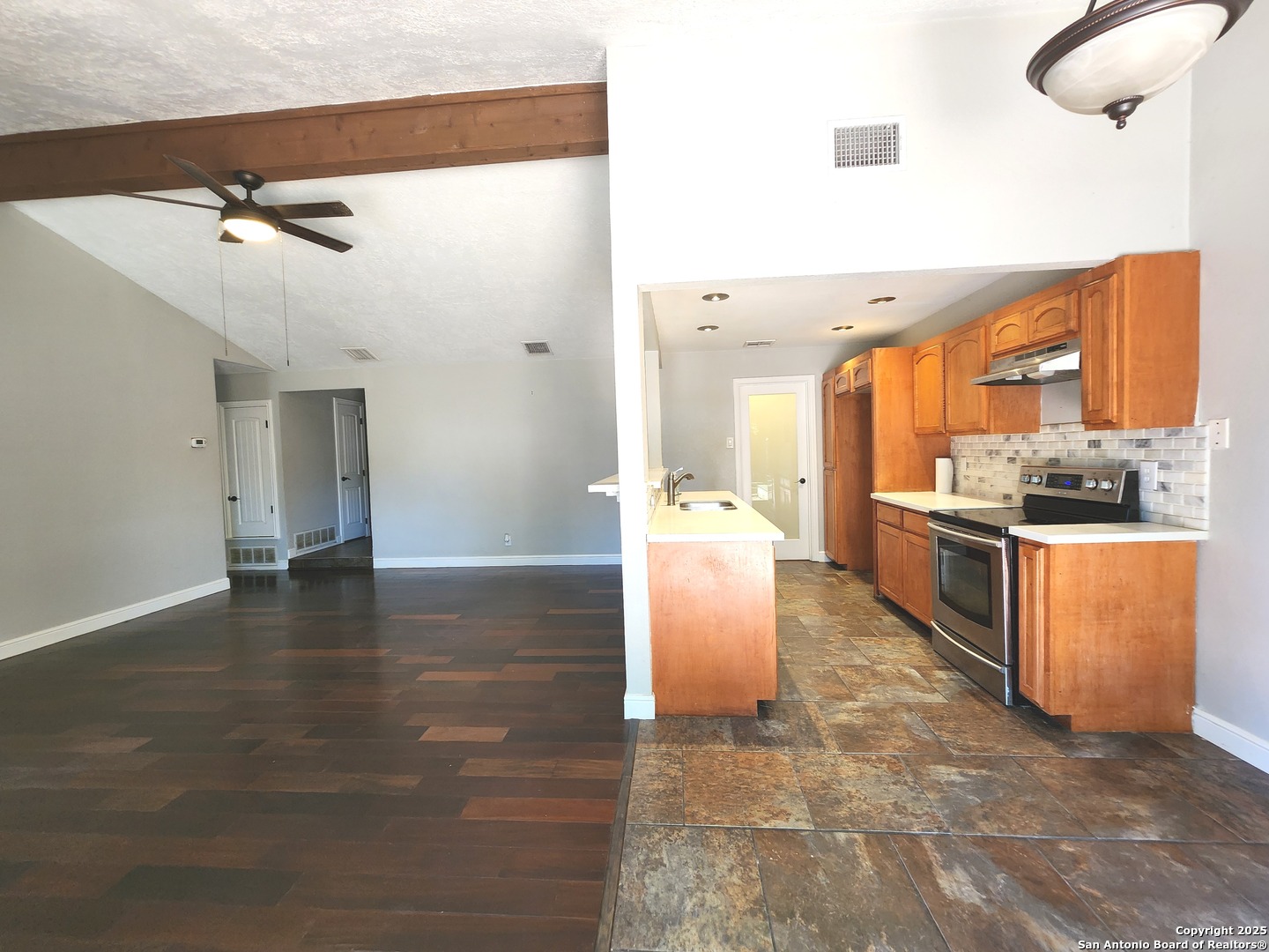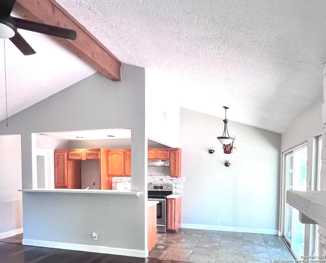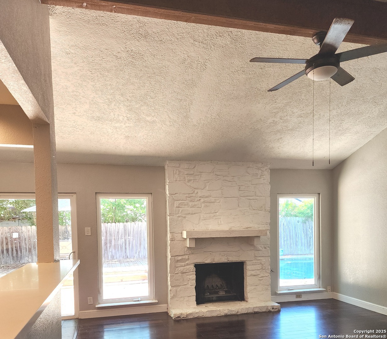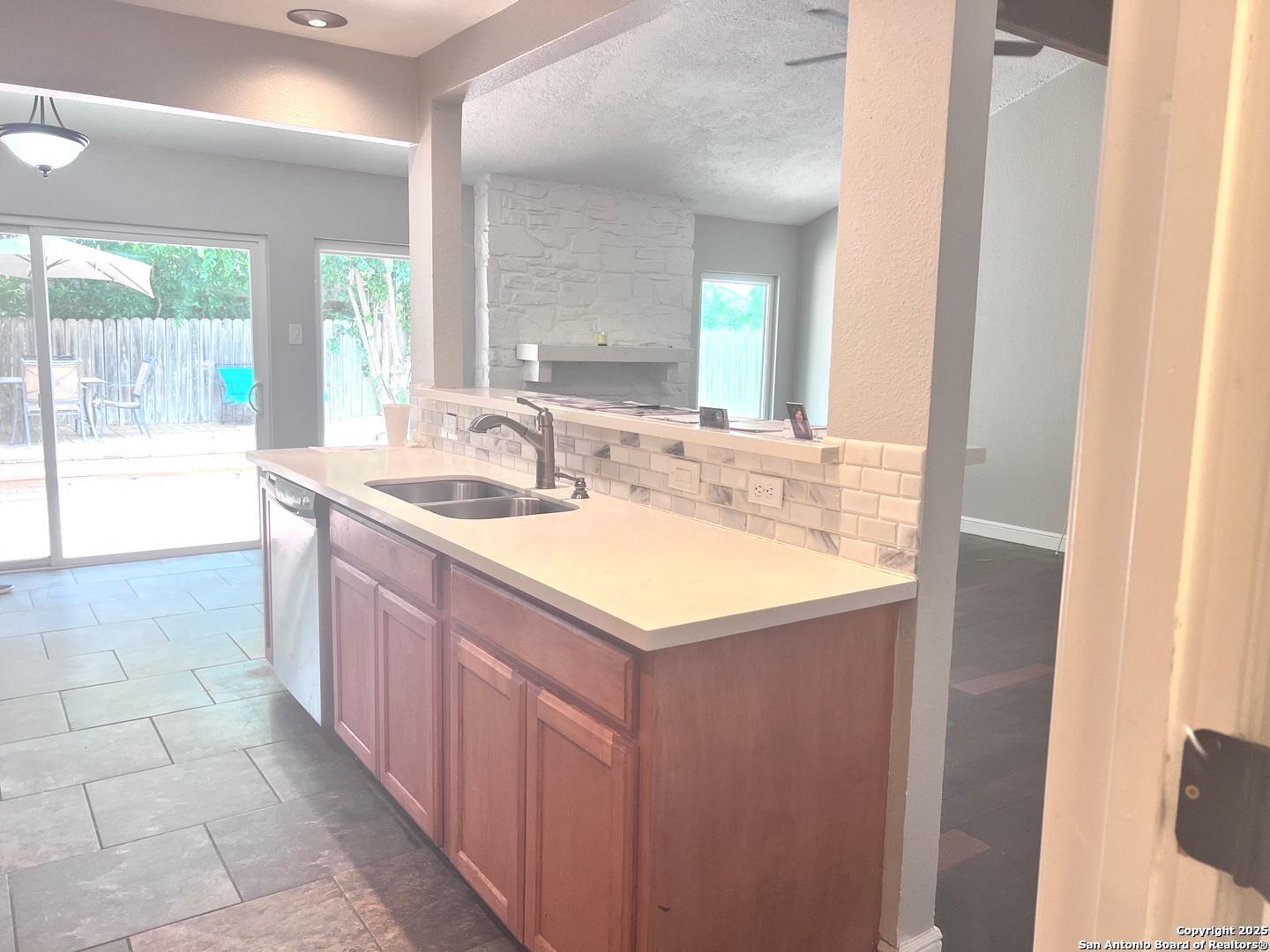 This spacious charming home with 1448 square feet has plenty of comfortable living space, 4 bedrooms, 2 baths. As you come up to the front entry you will notice the beautiful flagstone walkway to the front door. Step into the living room which as a vaulted ceiling and a beautiful fireplace. You can enjoy the view of the pool from the living room. Wonderful backyard which is perfect for those family gatherings with plenty of shade, Saltillo flooring on the porch and deck with an oversized sitting area. Cool off in the beautiful inground pool. Recent updates were done within the last 5 to 6 years. living room has high vaulted ceilings with a stone fireplace and a side window so that you can view the backyard with inground pool. beautifully updated features include, recessed lights, quartz counter tops in the kitchen. pantry and washroom combo located next to the kitchen with a sensor light when you walk in. Engineered hardwood flooring, ceramic floor in kitchen/breakroom area. Ceiling fans in the bedrooms. Master bath has recessed lights, granite double vanity and Walk-in closet with plenty of storage room.