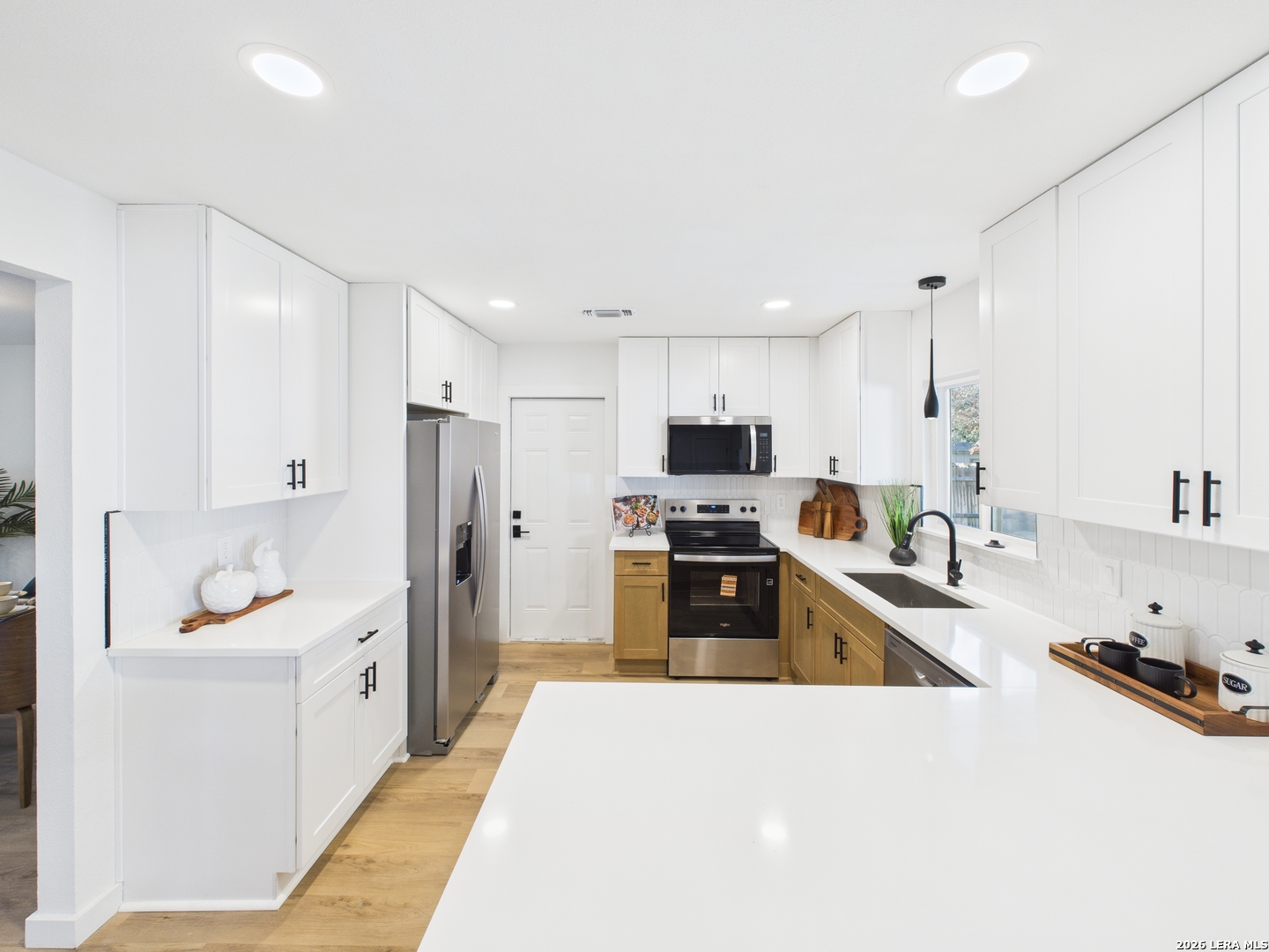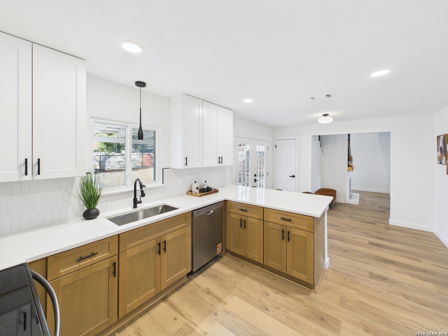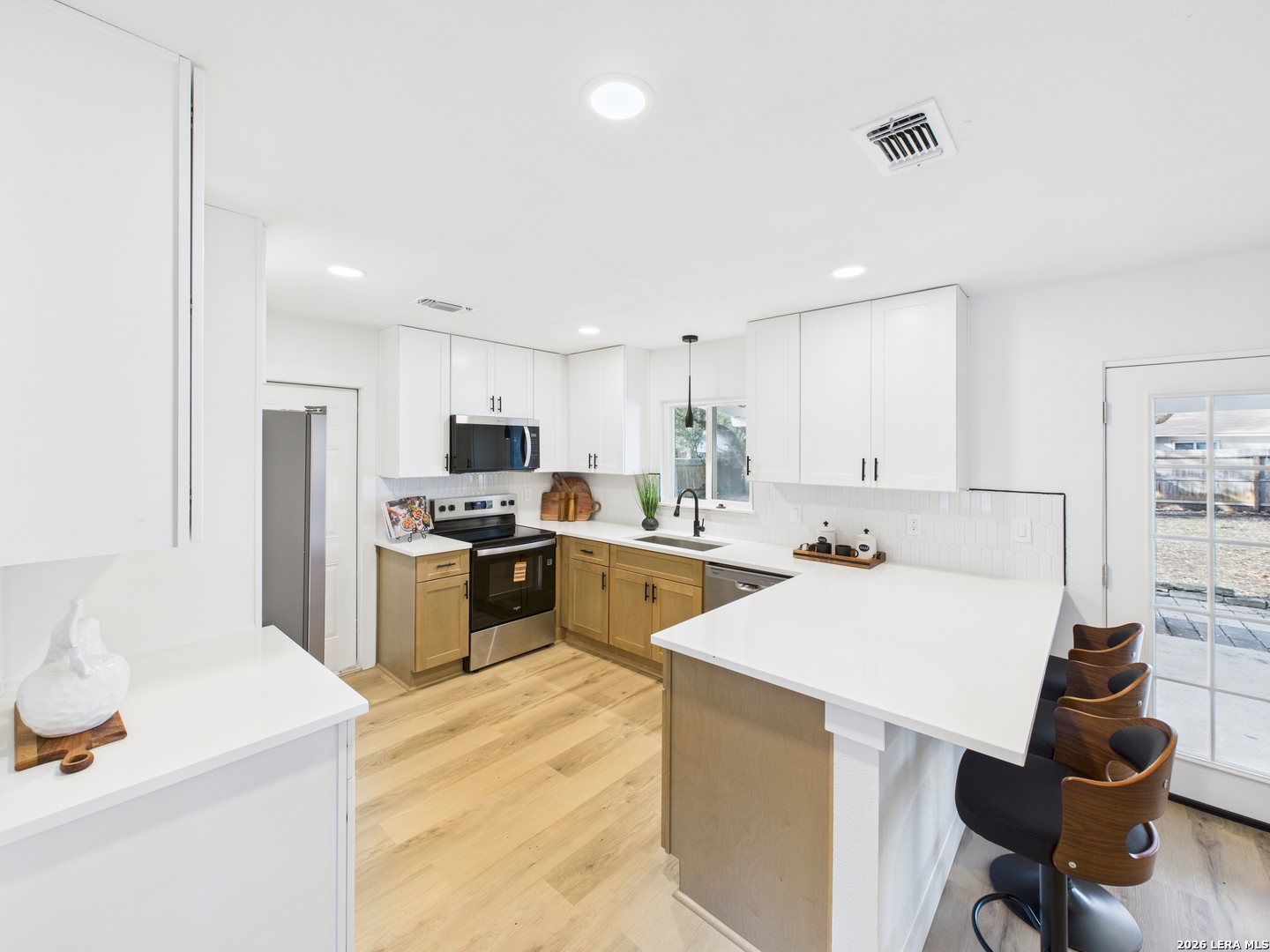 Welcome to 6723 Timberhill, a beautifully renovated residence offering a bright, modern aesthetic and a thoughtfully designed, functional layout. This refreshed home showcases clean lines, contemporary finishes, and inviting living spaces ideal for both everyday living and effortless entertaining. The interior is filled with natural light and features fresh paint, updated lighting, and wide-plank luxury flooring throughout the main living areas, creating a warm and open feel. Multiple living and dining spaces provide flexibility for relaxing, hosting guests, or creating a dedicated work-from-home area. The fully updated kitchen serves as the heart of the home, featuring modern white cabinetry, sleek quartz countertops, stainless steel appliances, and a spacious island with seating. The open flow into the dining and living areas makes this space perfect for gatherings and daily meals alike. Bedrooms have been carefully refreshed with neutral tones, updated ceiling fans, and ample closet space, offering comfort and versatility. The bathrooms have been tastefully updated with clean finishes, modern vanities, and contemporary fixtures, delivering a true move-in-ready experience. Outside, the expansive backyard provides a blank canvas with plenty of room for outdoor entertaining, gardening, or future enhancements. A spacious driveway and garage offer convenient parking and storage. Conveniently located in Leon Valley near schools, parks, shopping, dining, and major highways, this home combines modern style with everyday practicality. With thoughtful updates throughout and a welcoming layout, 6723 Timberhill is ready to be enjoyed from day one.