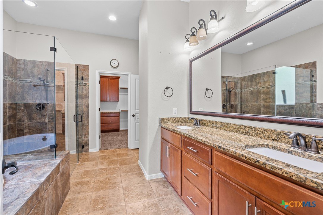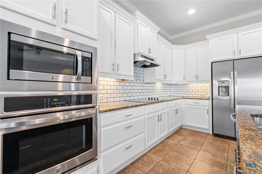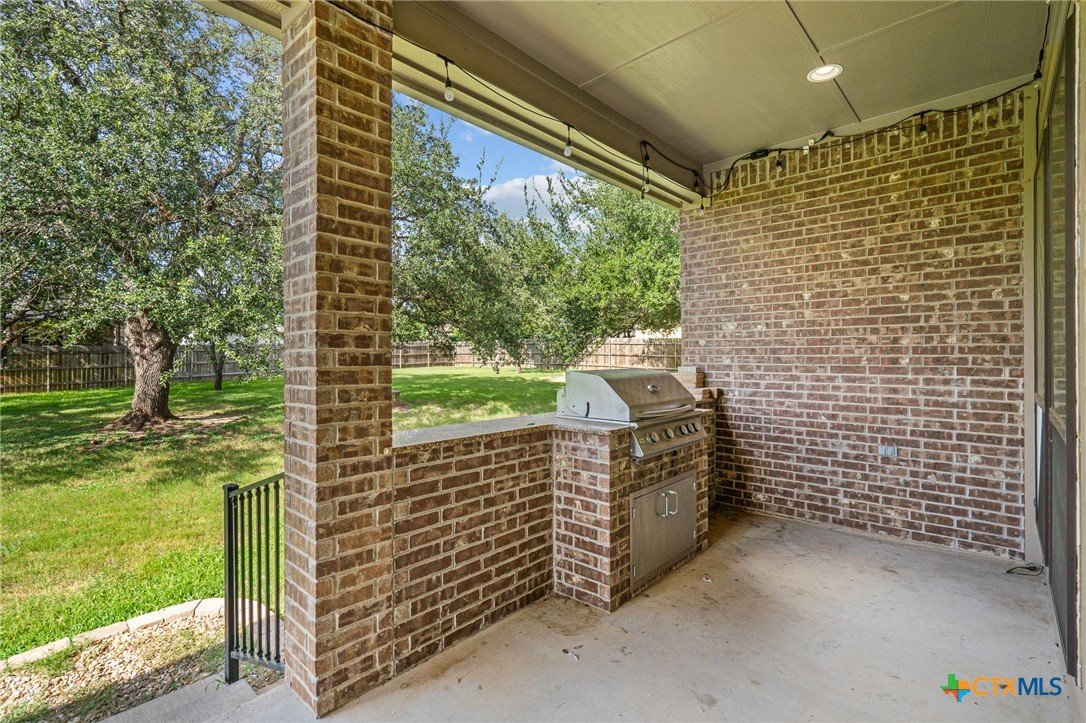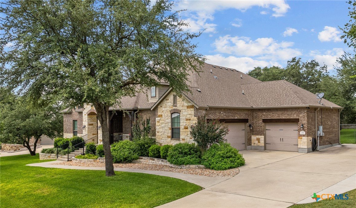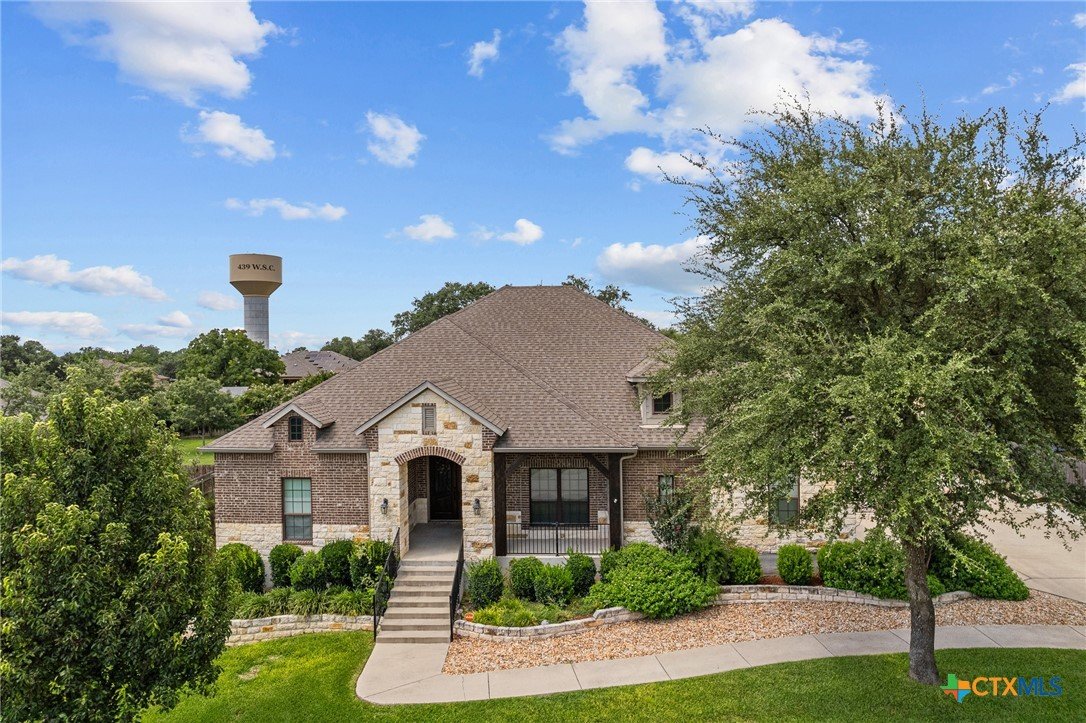 Welcome to this stunning 4-bedroom, 3-bathroom home nestled on a beautifully landscaped 0.5-acre lot in the High Crest community. From the charming front porch to the elegant double-door entry, every detail invites you in. Step inside to a spacious open-concept layout featuring a gourmet kitchen with a large island, granite countertops, stainless steel appliances, and tile flooring throughout the main areas, with carpet in the bedrooms. The oversized primary suite is a true retreat, offering a spa-like bathroom and a dream walk-in closet. A thoughtful Jack-and-Jill layout conveniently connects two of the secondary bedrooms, while a separate spacious bedroom and full bath providing an ideal space for guests or a mother-in-law suite. The additional office/flex room provides versatile space for work, relaxation, or hobbies. Enjoy the convenience of a 3-car garage and an incredible outdoor living area complete with a fireplace, built-in kitchen, and expansive covered patio that overlooks a serene, tree-filled backyard ideal for relaxing or entertaining. Recent upgrades include a fully resodded front lawn and a whole-home water purification system installed in September 2023. Located in close proximity to schools, grocery stores, and beautiful Belton Lake, this home offers the perfect balance of luxury, comfort, and convenience.