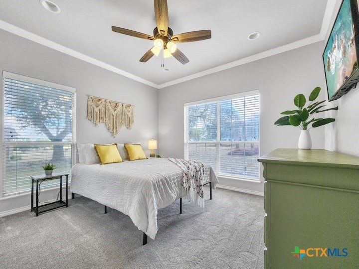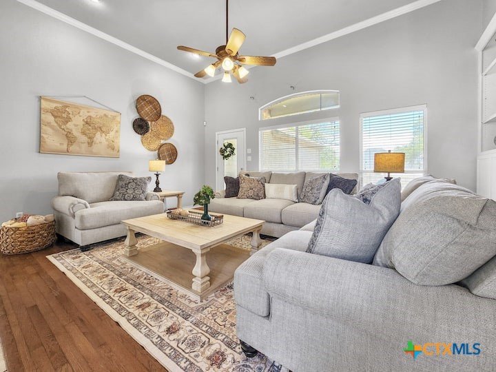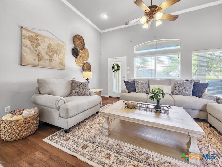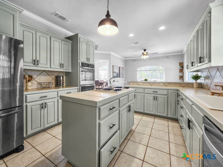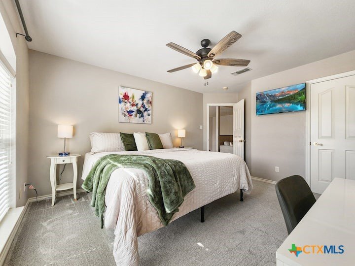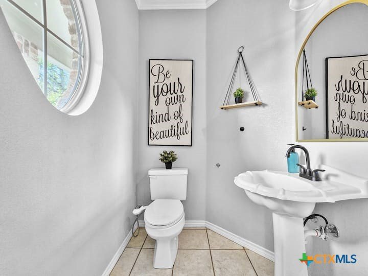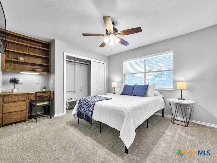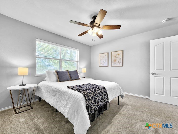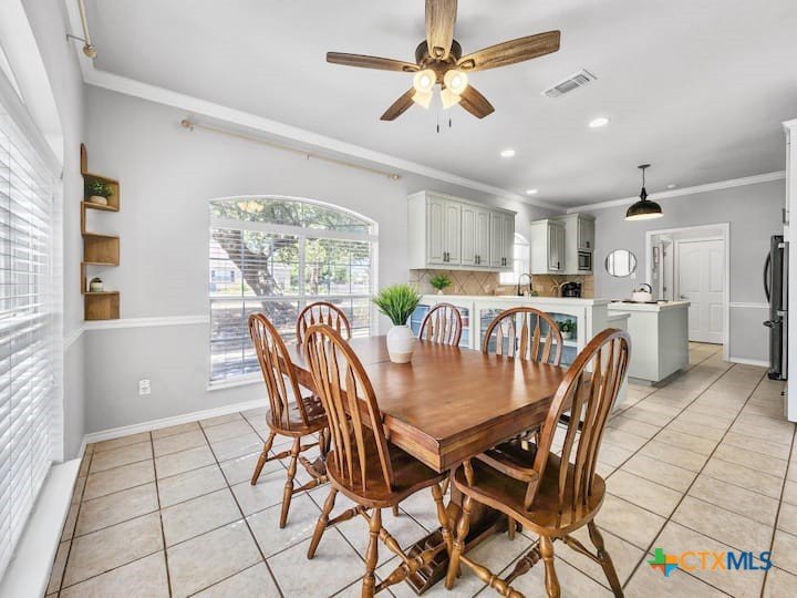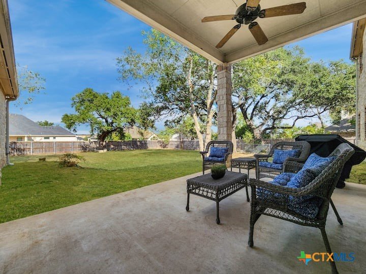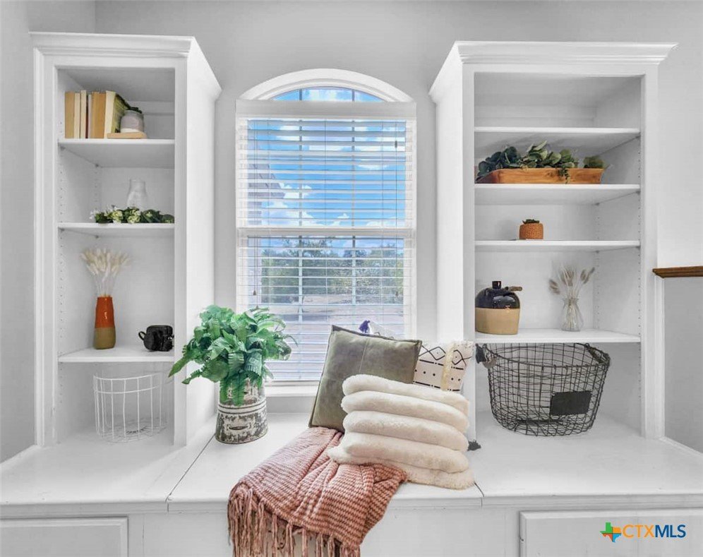 Welcome to this beautiful 5-bedroom, 3.5-bath farmhouse offering the perfect blend of charm, comfort, and functionality. Located south of Temple with quick and easy access to shopping, dining, and medical center off S 31st street, enjoy the serenity of country living with the convenience of town just 10 minutes away. Zoned for Academy schools, this estate home is ideal for entertaining, multi-generational living, or anyone seeking plenty of space for the whole family to spread out. The main floor boasts a large primary suite with an attached bathroom featuring a garden tub, walk-in shower, generous cabinet space, and an oversized walk-in closet. The primary bathroom provides extensive counter space, including dedicated knee-space for a vanity chair or makeup area. The huge walk-in closet offers abundant built-in shoe storage and shelving. A second bedroom and half bath are also conveniently located downstairs. The open foyer welcomes you with abundant natural light, leading into a kitchen designed for convenience and storage with ample cabinetry. The laundry room includes additional cabinet space and an attached full bath for added functionality. Upstairs, you’ll find three bedrooms, a full bath, and a cozy loft living area featuring a built-in reading nook—perfect for relaxing or entertaining. The home also includes a versatile flex room and a spacious two-car garage. Outside, enjoy the expansive front yard with a large driveway providing plenty of parking space, and a huge backyard ideal for outdoor gatherings, play, or peaceful country living. The north-facing backyard is sheltered from the evening sun and ready for entertaining - adorned with mature trees providing morning shade as well. This farmhouse offers plenty of room for family, guests, or rental income potential, with thoughtful details and a warm, inviting atmosphere throughout. Natural light floods every room, filtered through the gorgeous trees skirting this beautiful home.