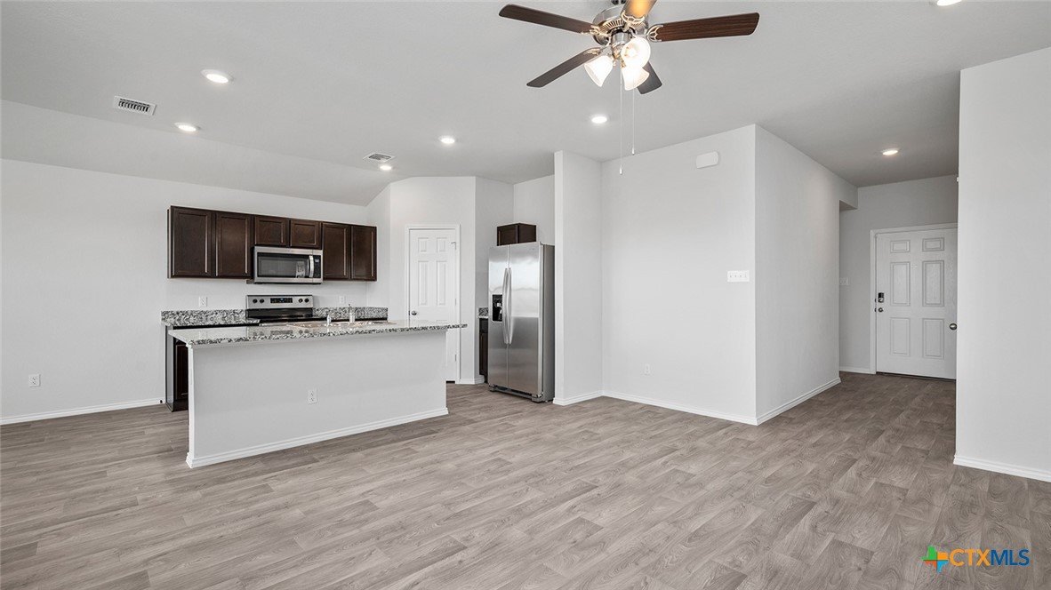 The Ashburn floorplan at Mitchell Farm in Killeen, Texas is a 3-bedroom, 2-bathroom single-story home covering approximately 1,263 sq. ft. The 2-car garage ensures plenty of space for vehicles and storage. In this floorplan, you’ll find a home that makes the most of its space. The kitchen features beautiful shaker-style cabinetry with granite countertops as it flows into the dining area and great room. The bedrooms are carpeted, and the primary bedroom has an attached bathroom with a walk-in closet. The secondary bedrooms are cozy and carpeted, with plenty of closet space. The laundry room and a secondary bathroom are perfectly place next to these rooms for easy access. Enjoy nature from the backyard covered patio that is attached to the dining area. Here you can start or end your day relaxing with nature. Like with all our homes, you’ll never be too far from home with our smart home technology thoughtfully designed into every detail. Find security and control through the Qolsys panel, your phone, or voice and when you want to add additional smart home tech, easily integrate with Z-wave or Bluetooth technology. Come visit the Ashburn floorplan today to find your new home!