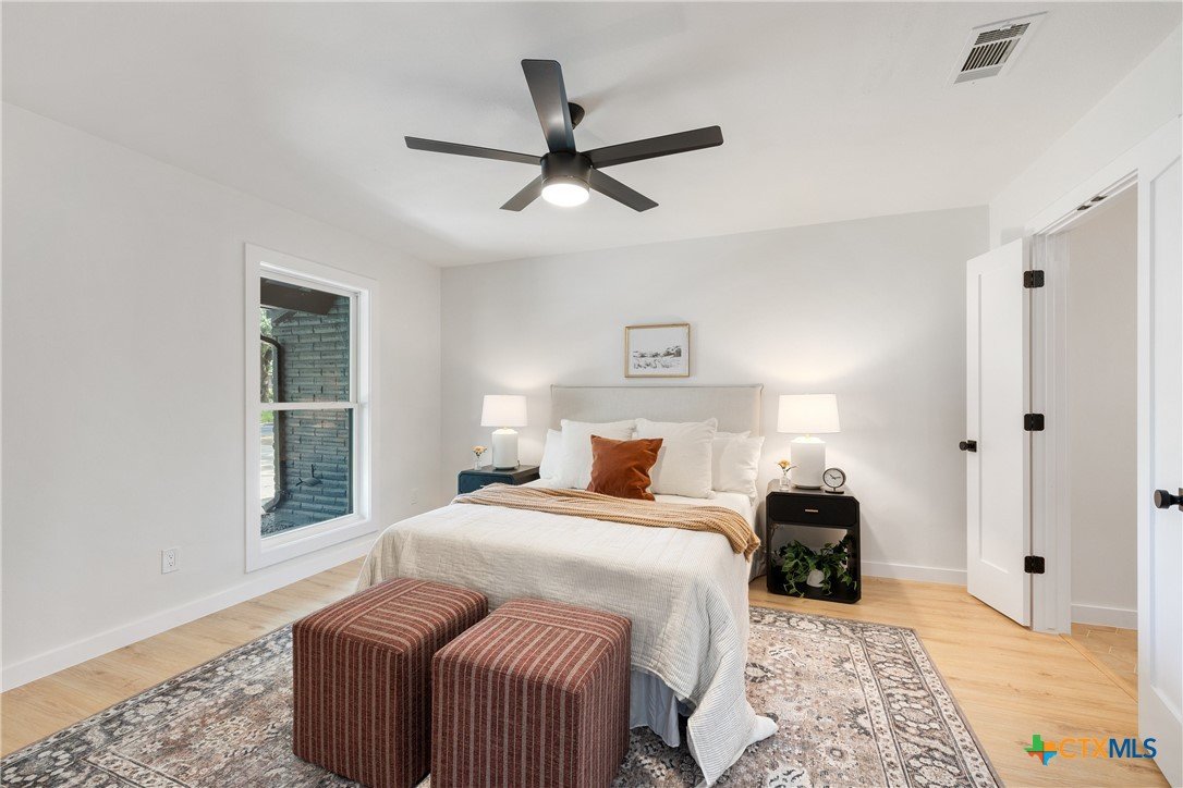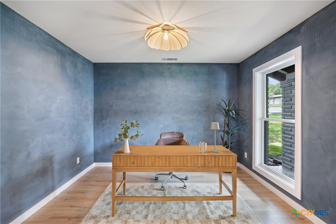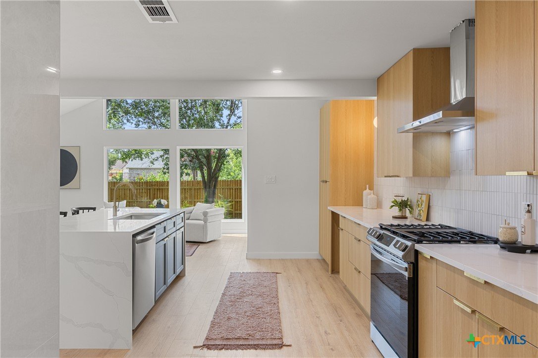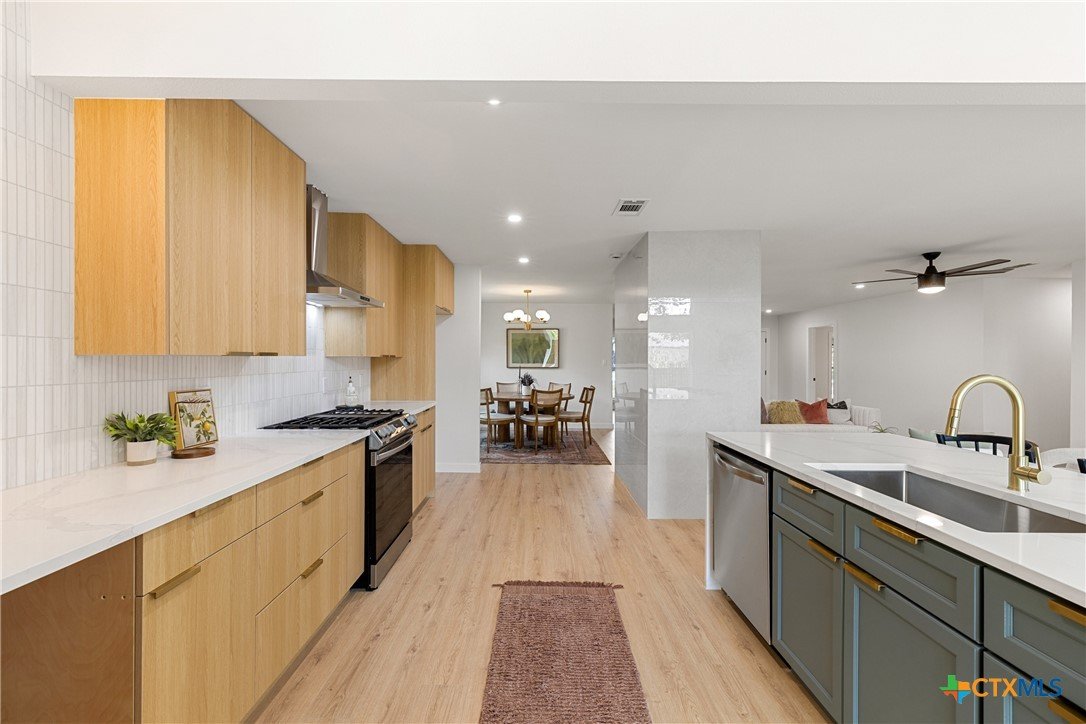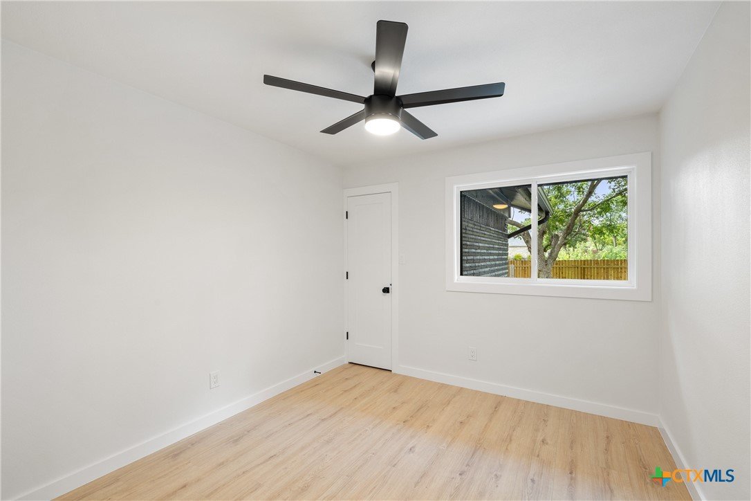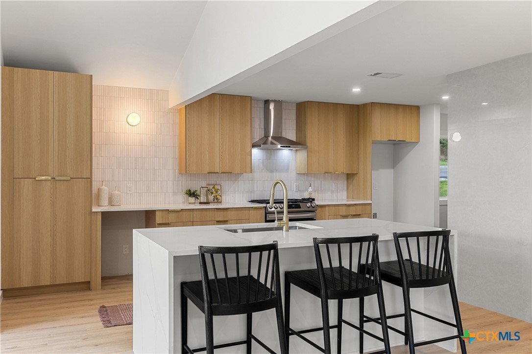 Special Financing Options Available - Please Inquire! Introducing a stunning, one-story gem in the desirable University Hills community. This fully remodeled beauty features a rare and versatile layout with four bedrooms, plus an office, and two-car garage, situated on a lush .4 acre lot with mature trees and a modern exterior. Throughout the home, you'll instantly fall in love with the thoughtfully crafted finishes and unique, vintage European design. A spacious and light-filled entry invites you into the home with timeless white oak flooring throughout. A sleek tiled fireplace acts as a centerpiece of the home, seamlessly transitioning you from the dining space, to the kitchen, to the great room with vaulted ceilings and wall-to-ceiling windows. The kitchen is open to the living and dining spaces, with waterfall quartz countertops, stainless appliances, gas range, warm color tones, and gold finishes. Both spacious bathrooms are stunningly designed with unique and stylish tilework and inviting color schemes. Outdoors, a courtyard-like patio makes for a cozy outdoor space to enjoy summer cook-outs and entertaining, with a canopy of tree coverage and no neighbors in site! Updates include all new electrical wiring and fixtures, new roof, new water heater, new HVAC system and ventilation, new plumbing (PVC & PEX) and sewer line, new high efficiency, energy saving windows and doors, foundation (transferable warranty), epoxied garage, and new sheetrock throughout the home. New homeowners will enjoy the best of both worlds with this unbeatable Austin location - large private lots, and also minutes from Downtown Austin. the Airport, and conveniences in Mueller. Also, just steps away, Dottie Jordan Neighborhood Park/Recreation Center offers a swimming pool, multi-use field, a playscape, two-lighted tennis courts, a lighted basketball court, a walking trail, and community garden. Welcome home!