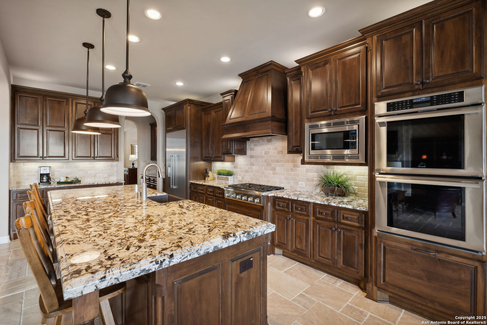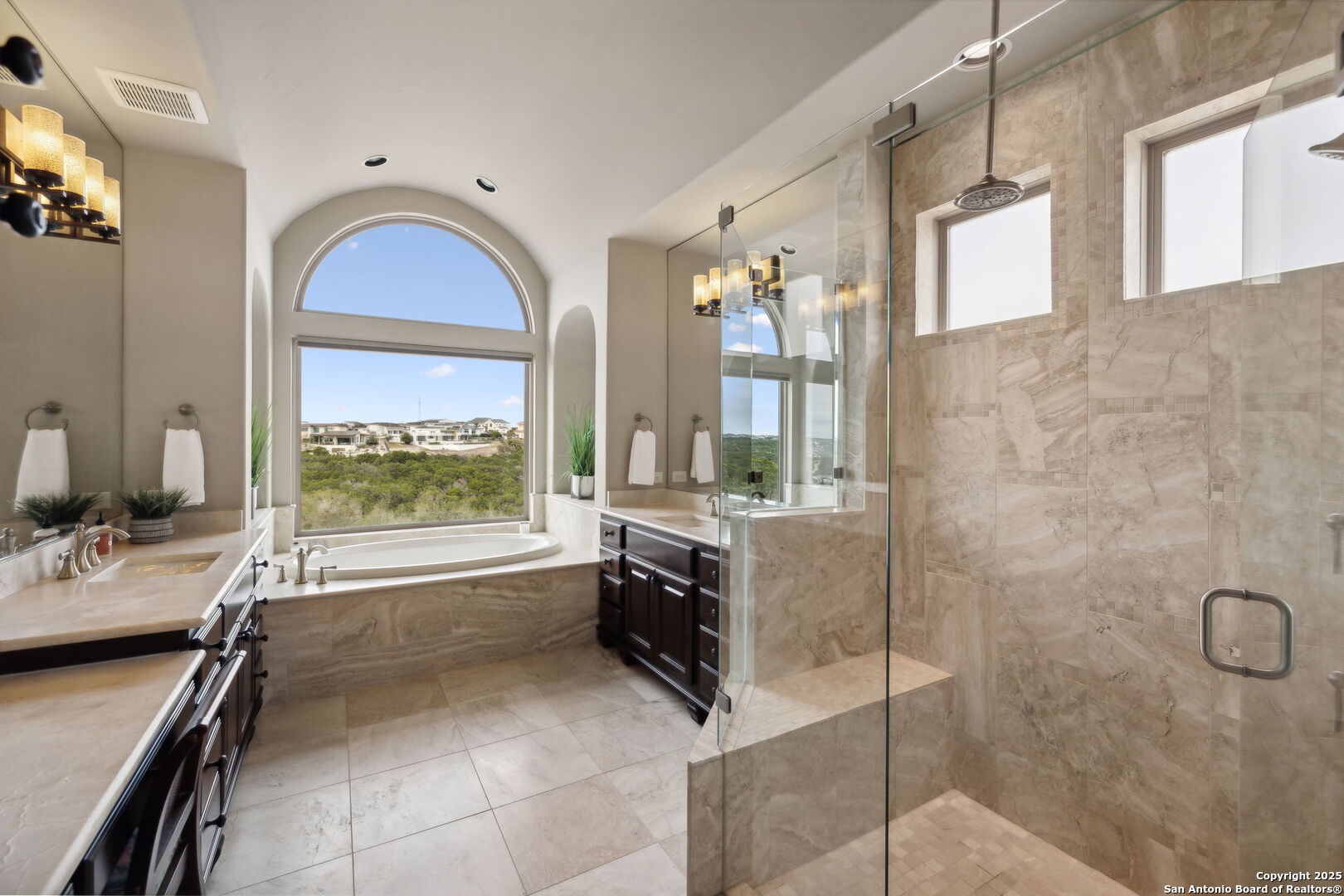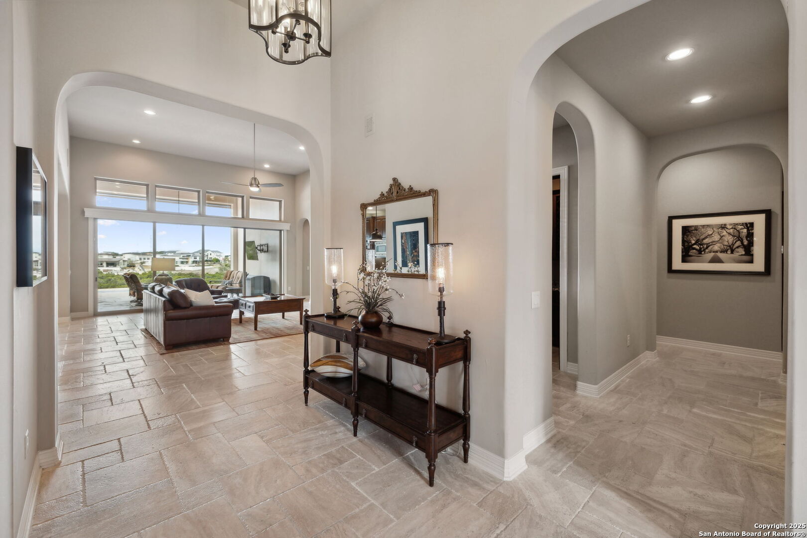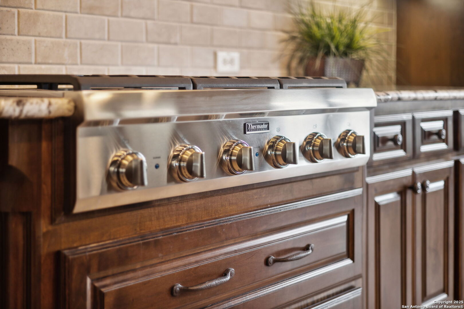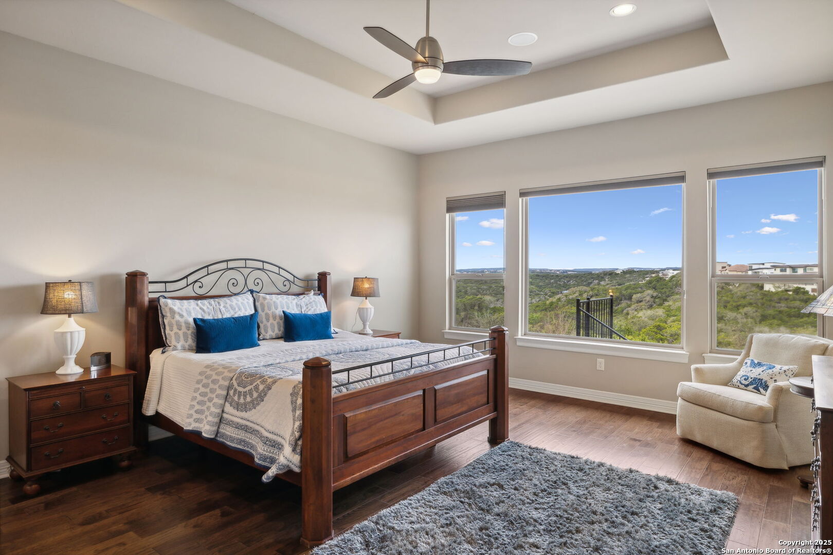Luxury lifestyle for the buyers wanting lock-and-leave conveniences in a gated community. Beautiful, quality finishes and top-of-the-line lighting, flooring, millwork, hardware & plumbing fixtures. Shutters across the front of the home provide privacy and exquisite curb appeal. Electric shades across the back of the home provide convenience & privacy while preserving the magnificent hill country views. Gorgeous hardwood floors and Turkish Travertine tile throughout the home for a luxury feel, and ease-of-maintenance. Huge primary bedroom with amazing views & extra-large closet. Enjoy the oversized tub with fabulous sunset hill country views (& a motorized shade for privacy). Huge island kitchen with gorgeous granite counters, Thermador gas appliances, double oven and Filtered water in the farm sink. Butler's pantry leads to the formal dining for added storage and convenience. Collapsible patio doors extend the inside living to outdoors. Large, landscaped yard with recently-resurfaced pool & stamped concrete patio to watch the gorgeous sunsets--backs to greenbelt. Oversized backyard with "puppy pickets" in the iron fence is great for dogs.