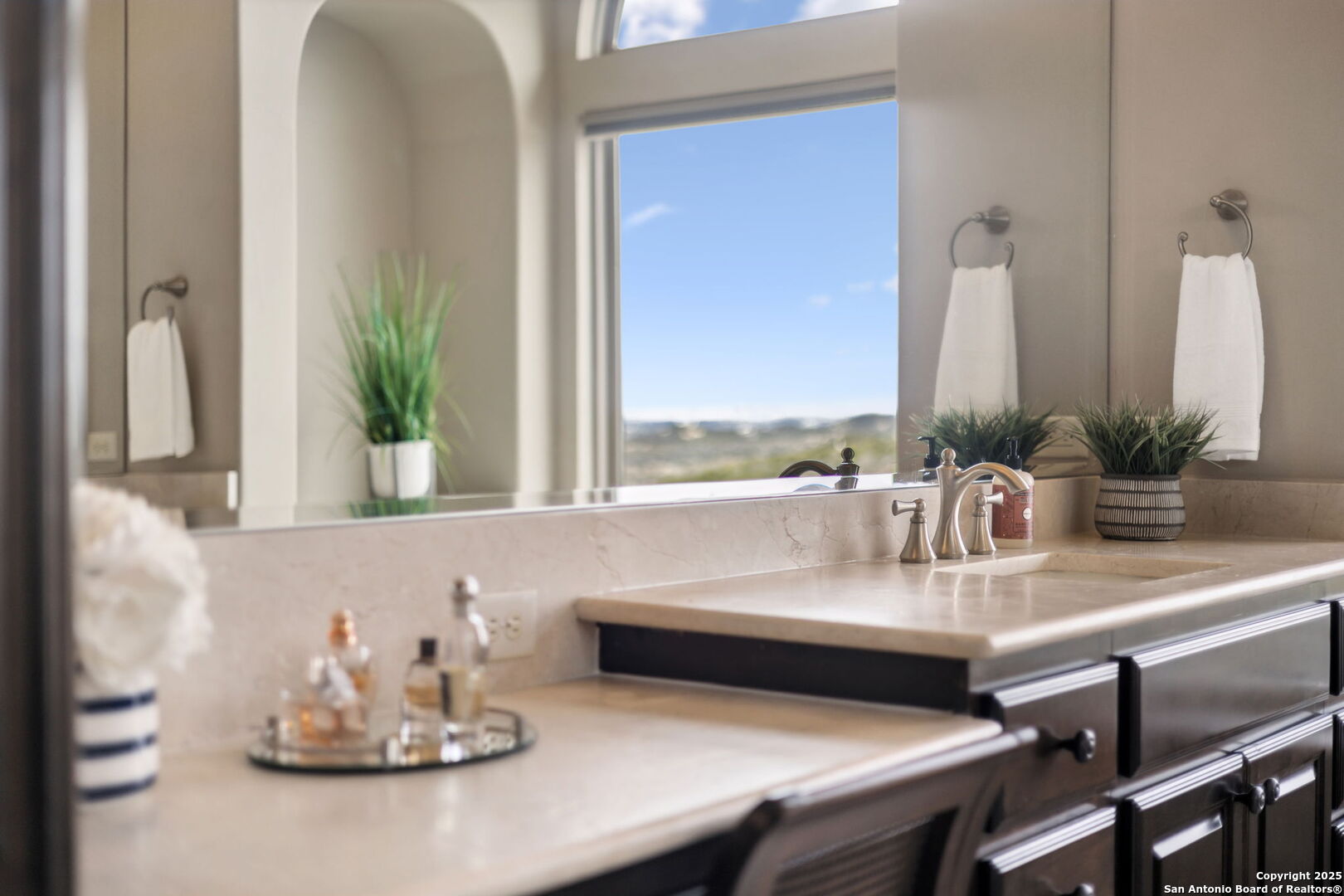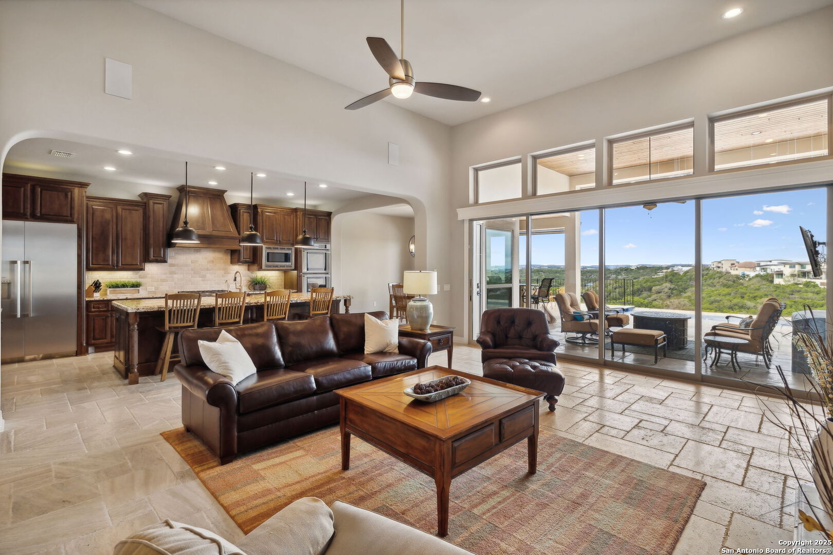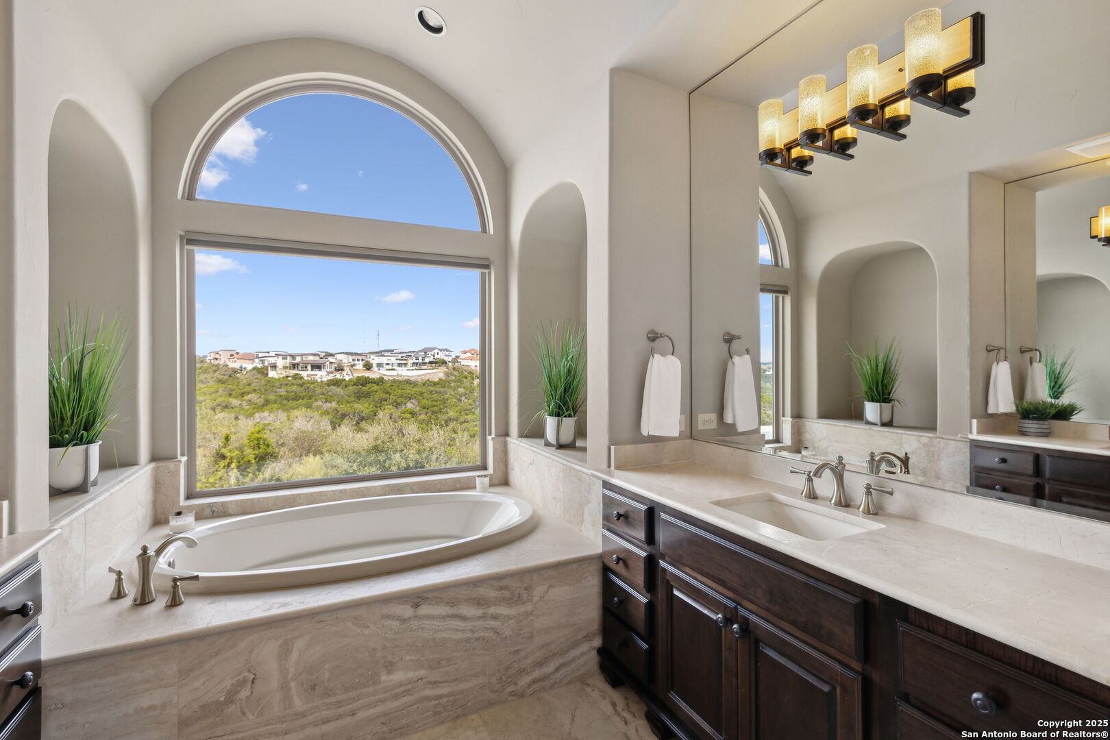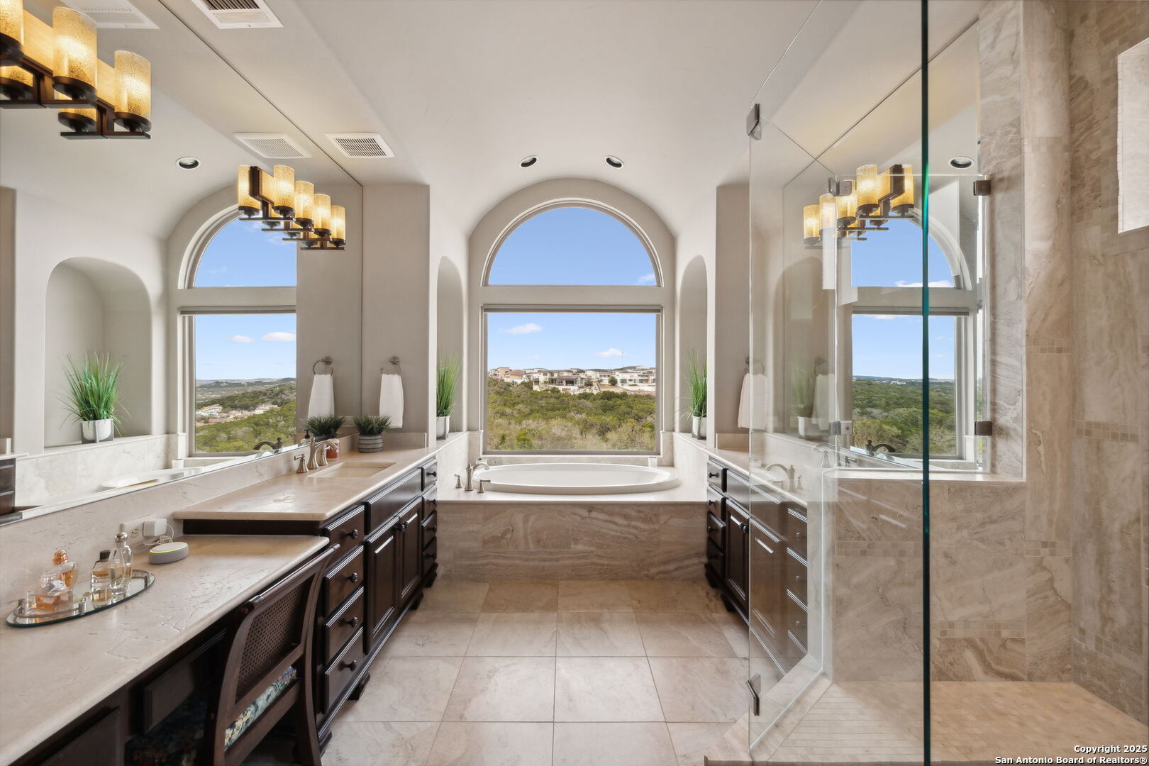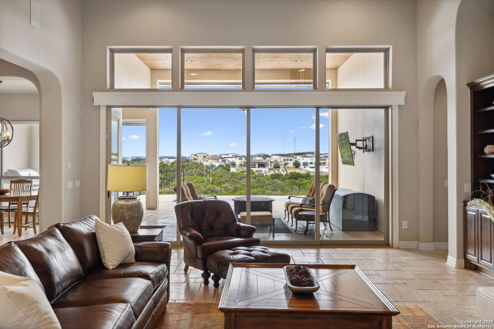 Luxury lifestyle for the buyers wanting lock-and-leave conveniences in a gated community. Beautiful, quality finishes and top-of-the-line lighting, flooring, millwork, hardware & plumbing fixtures. Shutters across the front of the home provide privacy and exquisite curb appeal. Electric shades across the back of the home provide convenience & privacy while preserving the magnificent hill country views. Gorgeous hardwood floors and Turkish Travertine tile throughout the home for a luxury feel, and ease-of-maintenance. Huge primary bedroom with amazing views & extra-large closet. Enjoy the oversized tub with fabulous sunset hill country views (& a motorized shade for privacy). Huge island kitchen with gorgeous granite counters, Thermador gas appliances, double oven and Filtered water in the farm sink. Butler's pantry leads to the formal dining for added storage and convenience. Collapsible patio doors extend the inside living to outdoors. Large, landscaped yard with recently-resurfaced pool & stamped concrete patio to watch the gorgeous sunsets--backs to greenbelt. Oversized backyard with "puppy pickets" in the iron fence is great for dogs.